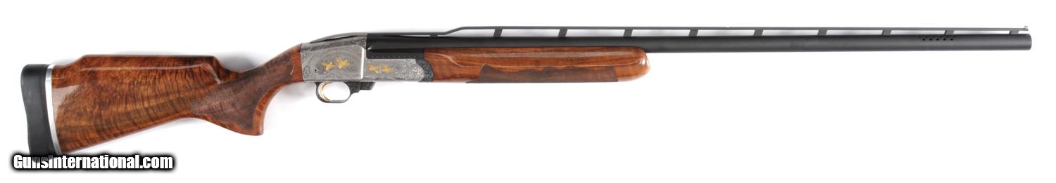 Description: LJUTIC LTX EXTRA ENGRAVED AND GOLD INLAID BY RINO GRECO 12 ga. Cal. 12 ga. 33" Ported bbl is fitted with high vent rib. Coin finished action is engraved with exceptionally well cut varying sized scroll and rose bouquets surrounding gold inlaid bird scenes by Greco. Four gold inlaid ducks are settling into marsh on left side, and four quail are flushing and flying on right. Engravers signature is under rear duck scene. Beautiful flame figured American walnut stocks have fancy pattern checkering and butt is fitted with KICKEEZ trap pad. Weight: 9 lbs 0 oz. LOP: 14-3/4". PROVENANCE: The Collection of Robert Burg. CONDITION: Excellent, with evidence of little firing, with a few minor marks on wood and metal. Left side of action has some browning in background of scene (should clean). Mechanically excellent All credit card transactions require a 3% processing fee. Call (401)247-4867 and ask for Dave for more information. SOLD Manufacturer: Ljutic Model: LTX Caliber Info: 12 ga. |