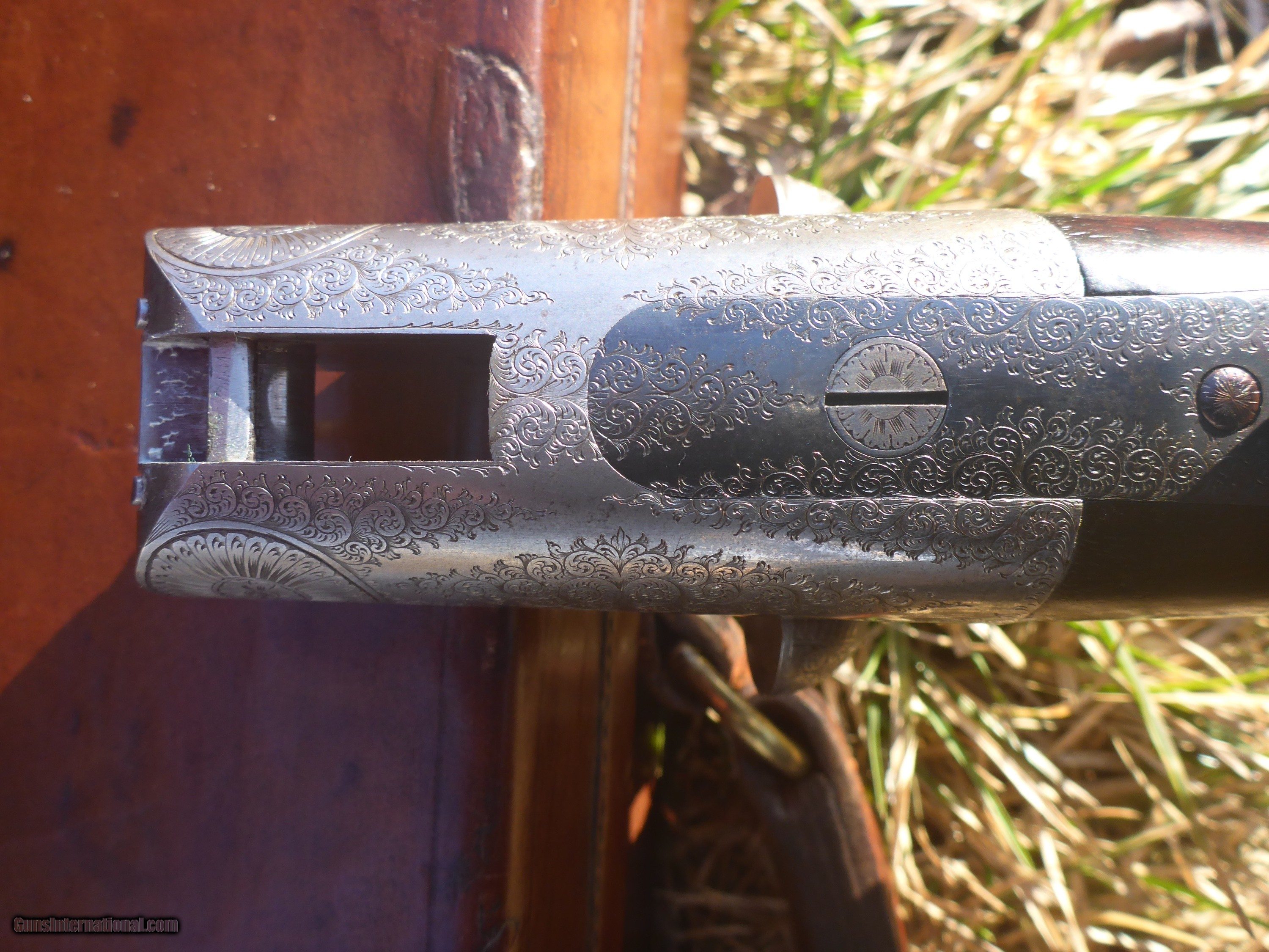Description: A WONDERFUL opportunity to own a true Scottish Round Body Trigger Plate shotgun by the Man who actually invented it !!! This gun is in excellent + condition with very sharp (nearly as new) engraving over the entire gun !! (including barrel rib and barrel bands.) All screws are perfect . Checkering is outstanding with no crushed points. Stock is very beautifully figured with very nicely done 1 inch leather pad. Original Barrels with bluing (old redone) 98% and bores are spotless. Toggle safety. Beautifully balanced that feels much lighter than actual weight ! Photos truely do tell the story of the remarkable condition this gun is in. Comes with a relined period Oak & Leather Case that is one of the finest you'll ever see with makers label. All this for the incredible price of $9995 SHIPPING included.($8995 without case) With the crazy prices of Dicksons this MacNaughton won't last long .....so don't this one get away !! Thanks for looking CHRIS (christo502003yahoo) SOLD Curio/Relic: Yes Shotgun Gauge: 12 Gauge Manufacturer: Mac Naughton Model: Round Body Serial Number: 2552 Barrel Length: 28 Bore: 12 Chambers: 2 1/2 Ejectors: Yes Condition: Excellent Metal Condition: very good+ Wood Condition: Excellent Bore Condition: Spotless Barrels: Steel Barrel Type: Double Action: Trigger plate Triggers: Double Stock: Figured Walnut Stock Drop: 2 1/4 Stock Heel: 1 1/2 Stock Cast: 1/8" cast off Fore End: Splinter Butt Pad: Leather LOP: 14 3/4 Rib: Game Rib Finish: Oil Weight: 6 lb 11 oz Sights: single bead Manufacture Date: 1902 Chokes: Fixed Choke Left: Mod Choke Right: IC Engraving: 75% Case: FIne Oak & Leather Item Location: Montana Proof:Nitro: Yes Minimum Wall Thickness Left: .025 Minimum Wall Thickness Right: .024 |