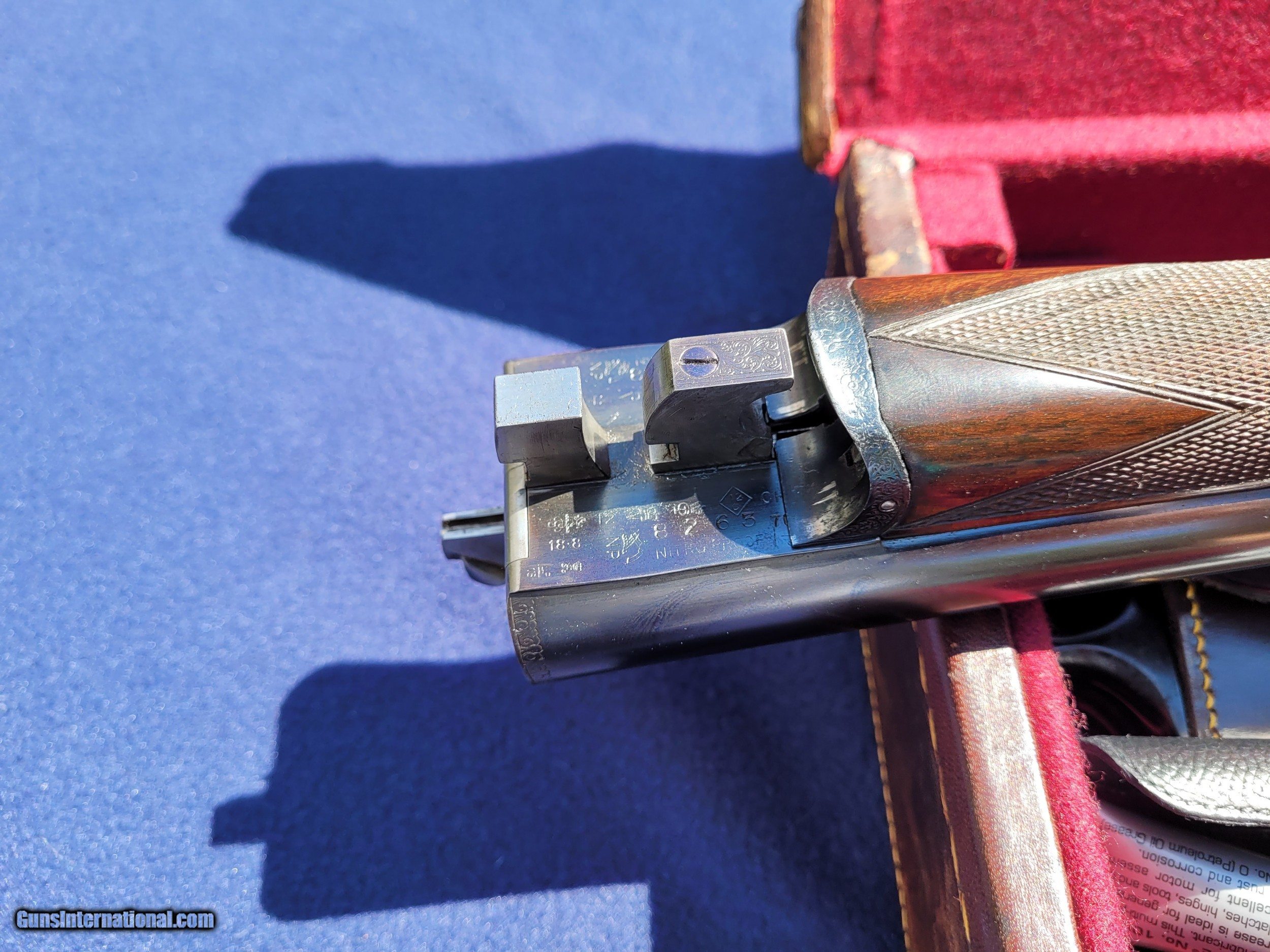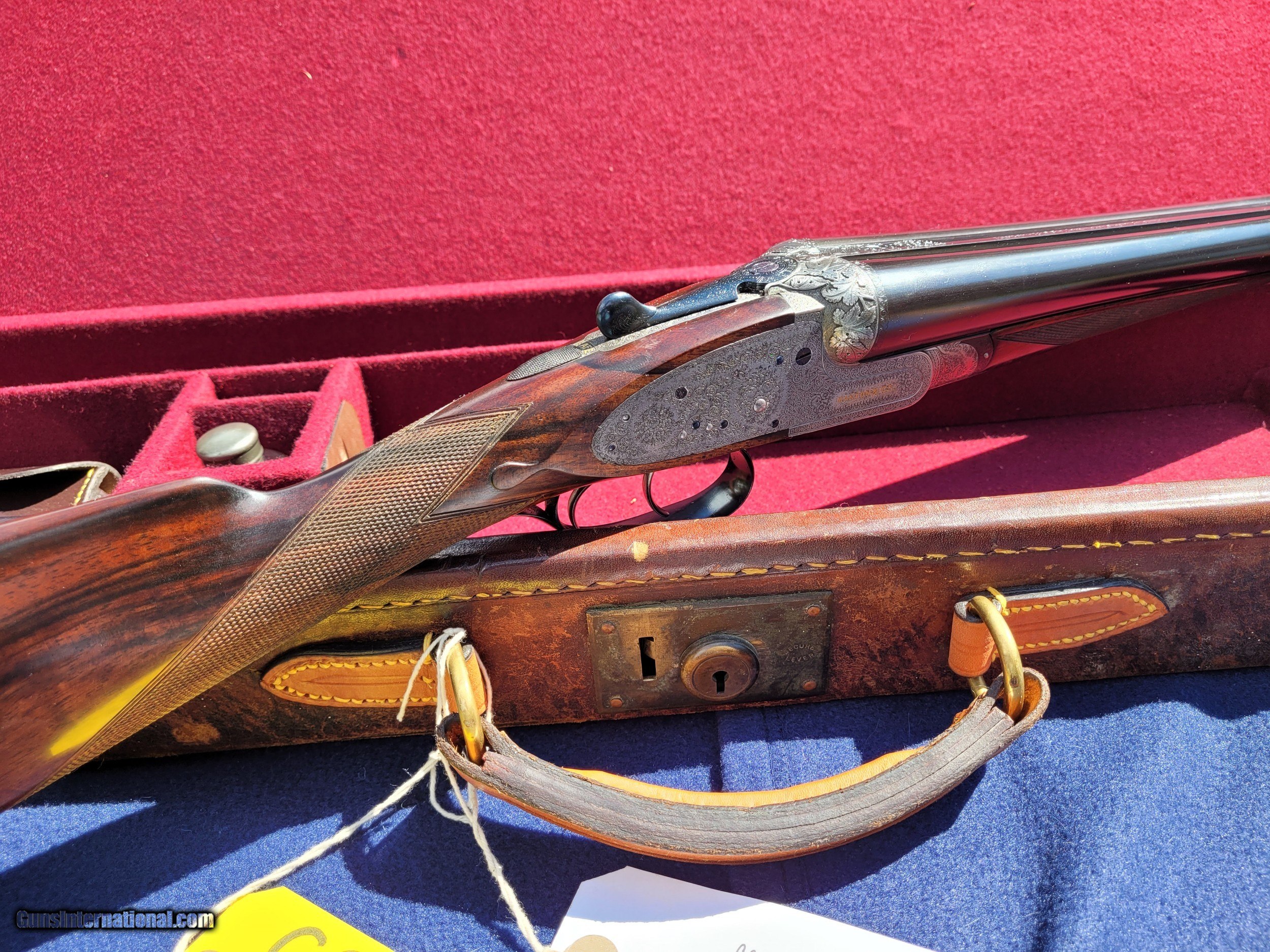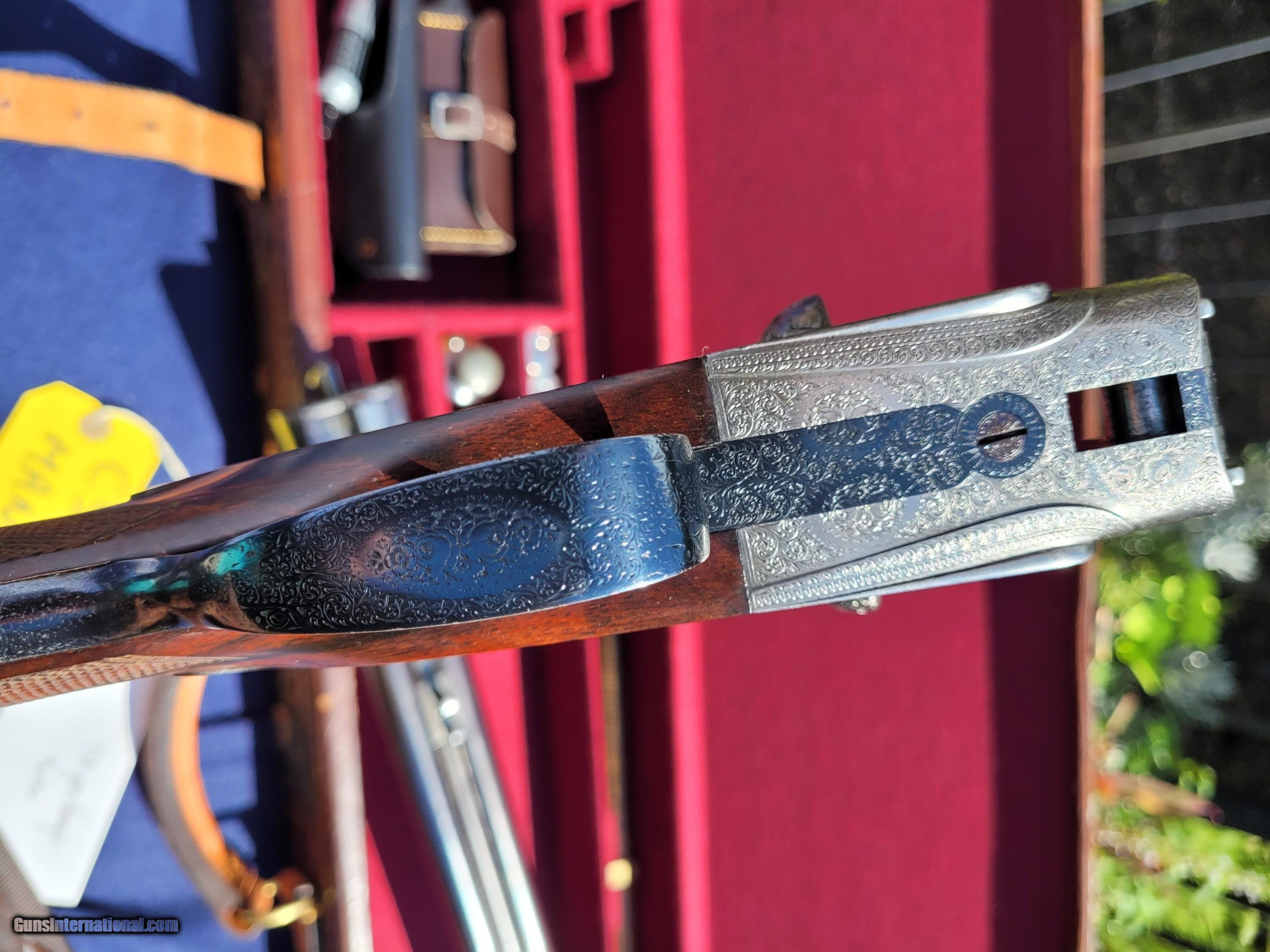 Description: Fantastic condition Manton & Co. 12b sidelock ejector featuring 30" fluid steel barrels choked .005 / .035 with minimum barrel thickness R .029 / L .030. Fully engraved with carved foliate fences. The engraving crisp and sharp like new. Nitro proof 2 3/4" chambers. 6lb 14oz with a 15 1/4" LOP to leather covered pad. 1 1/2" drop at comb + 2 1/8" at heel. Includes fitted leather case with accessories as shown. Refreshed in England for Cyril S. Adams, who commissioned the work before his passing. This gun is being sold for his widow, Gale Morton. Available for inspection in Houston Texas. Shipping included in CONUS. $14,500.00 SOLD Curio/Relic: Yes Shotgun Gauge: 12 Gauge |
