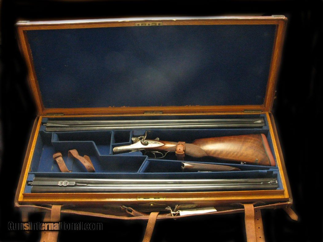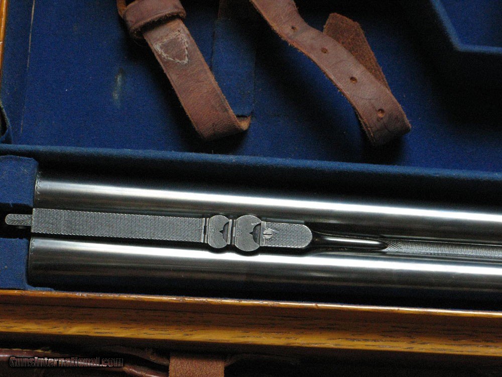 Description: Possibly unique, a delightful French rendition of the famous Paradox guns, this one cased in a sturdy English style fitted oak and leather case with a canvas overcover, with a second set of normal 12ga x 2 1/2" shotgun barrels choked cyl/mod, bullet mold and tools, in mint original condition as restored. The (Birmingham) nitro proofed steel barrels have H&H style ratchet rifled chokes and a two leaf folding sight; the mechanism is tight and crisp; and MF went one step further than Holland in extending both the top and bottom tangs over the comb/grip! Dimensions and weights: lop 14.5" drops x and x; shotgun 7.5lb, 29" bbls; rifle 8lb 1oz 29" bbls. Price: $7,500.00 Contact Seller |