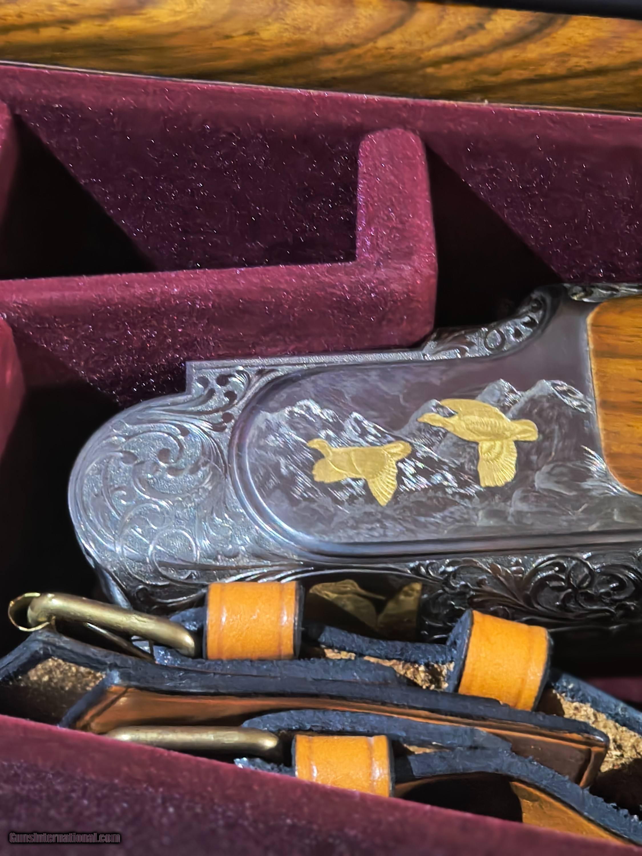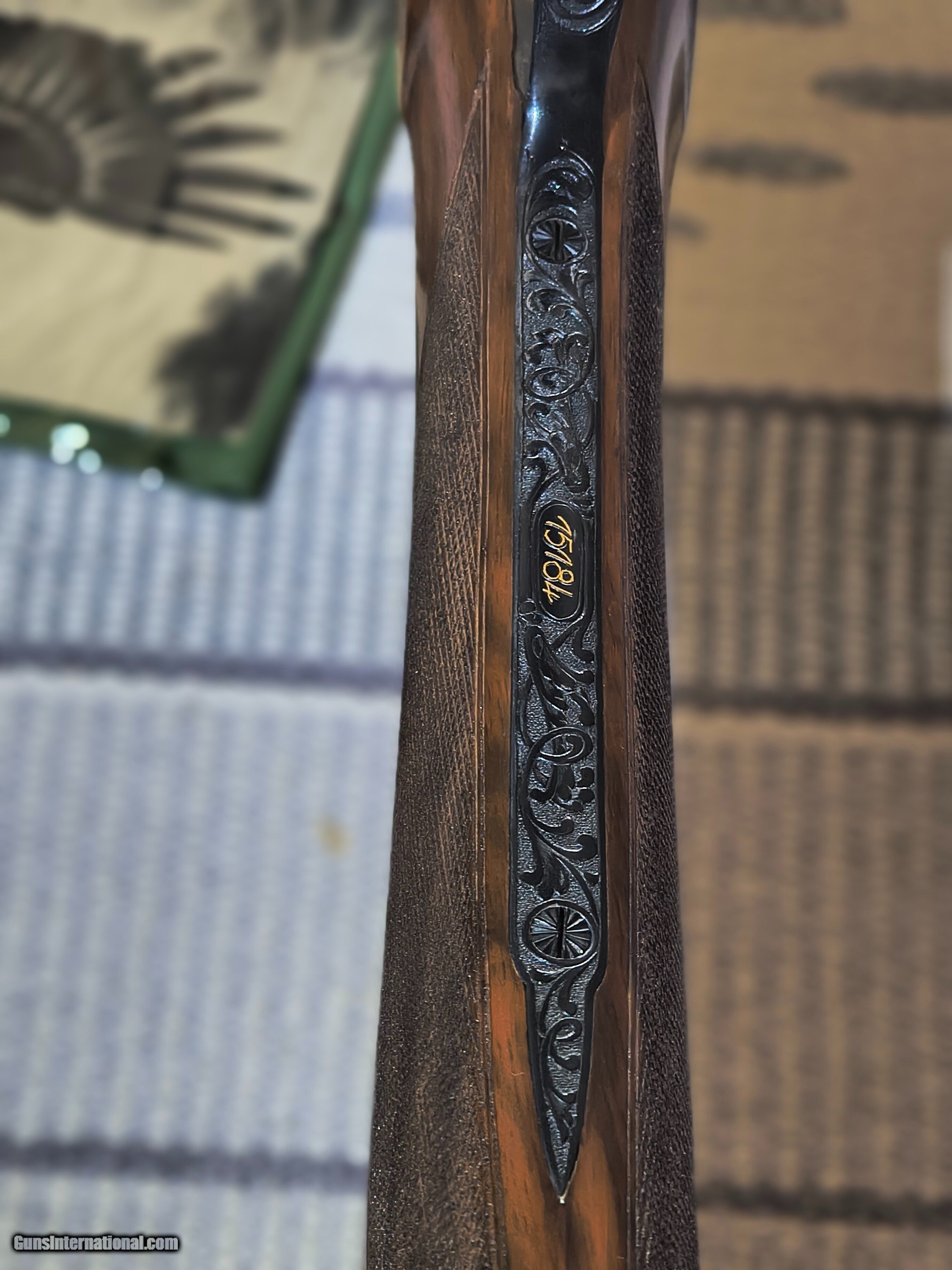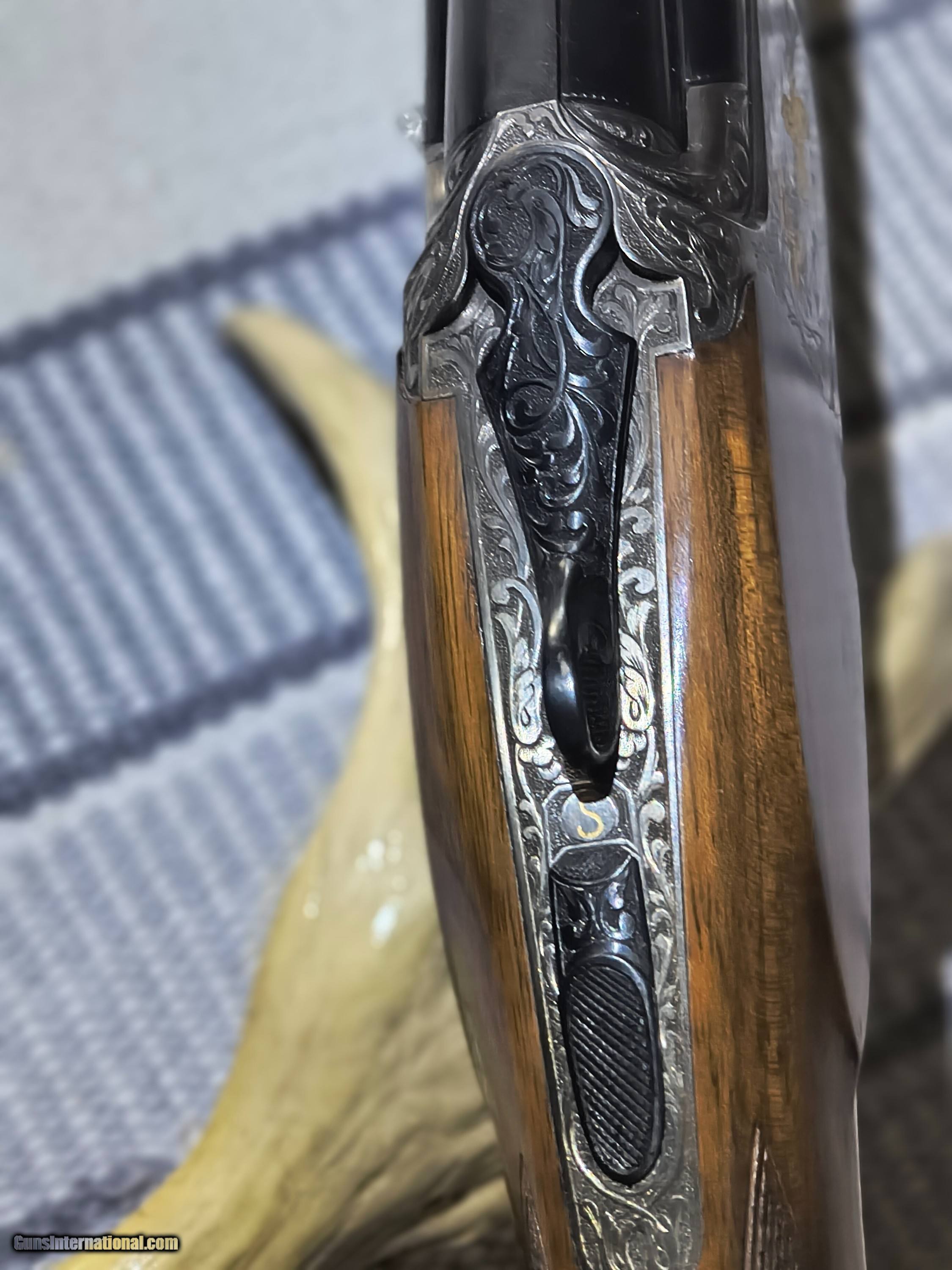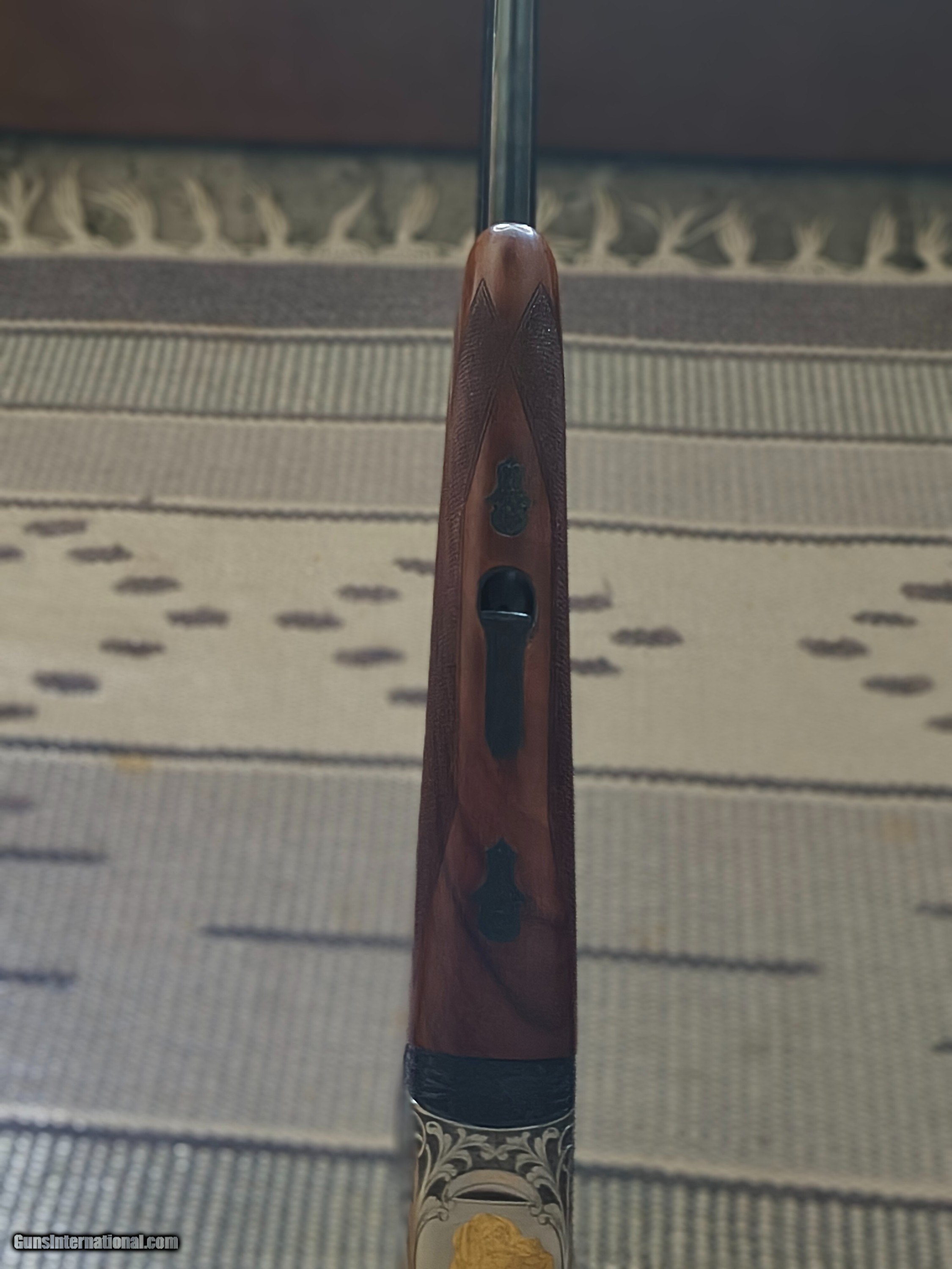 Description: Unfired Best Quality Mario Beschi Master Engraved by Attilio Giovanelli deep cut scroll with gold inlayed game scenes with gold plated single non selective trigger. Very well figured Turkish walnut with slim field style friend with English grip stock checked 32lines per inch to a fully checkered butt. Barrels are of monobloc construction with solid game style side ribs to a hand matted vent rib with ivory mid bead and metal front bead with 2 3/4" chambers. This lovely little wand is cased in the makers Best Quality Nizzoli suede case complete with paper work and key . PLEASE CALL FOR PRICING Shotgun Gauge: 28 Gauge Manufacturer: Mario Beschi Model: Best Quality Boxlock Serial Number: 151xx Barrel Length: 26 Chambers: 2 3/4 Ejectors: Yes Condition: Excellent Unfired Metal Condition: Excellent Wood Condition: Excellent Bore Condition: Excellent Barrel Type: Monobloc Action: Boxlock Triggers: Single non selective Stock: English grip Stock Dimensions: 1 5/16" x 2 1/8" x 14 1/2 Stock Heel: Off 1/4 heel 3/8" toe Butt Pad: No LOP: 14 1/2 Rib: Hand Matted Vent Finish: Original Weight: 6 lbs 0 oz Sights: Ivory Mid bead Metal front bead Manufacture Date: 1986 Chokes: Fixed Choke Left: Full Choke Right: Mod Engraving: Master Attilio Giovanelli Case: Makers Best Price: POR Contact Seller |