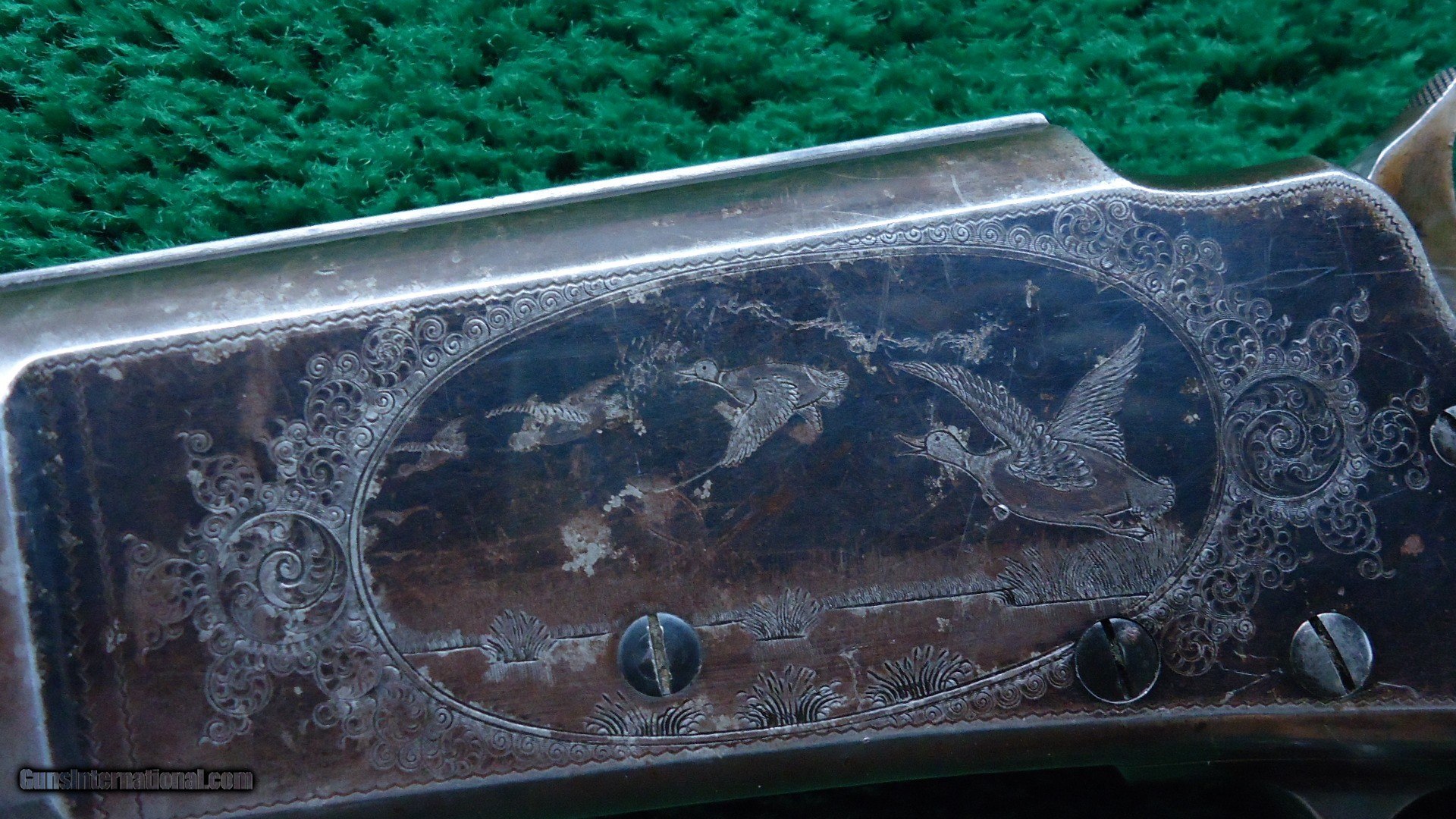 Description: 12 Gauge. Gun retains about 25% original blue finish turning a silver color. 30 inch barrel. Wood is generally good condition. LOP 14-1/4 to the end of a brown Pachmayr pad. Factory engraved with some ducks on one side and scrolling with a couple of pigeons on the other side. Mechanics are good. Tootsie roll style forearm. Original gun except for the pad. Leroy Merz Antique Firearms specializes in antique and vintage Winchesters and other fine American firearms. Since 1965 Mr. Merz has taken part in the world of firearms and has been a contributor to many well known reference books. We have hundreds of additional guns in every price range at our home online. Search for Merz Antiques in google. SOLD Curio/Relic: Yes Shotgun Gauge: 12 Gauge |