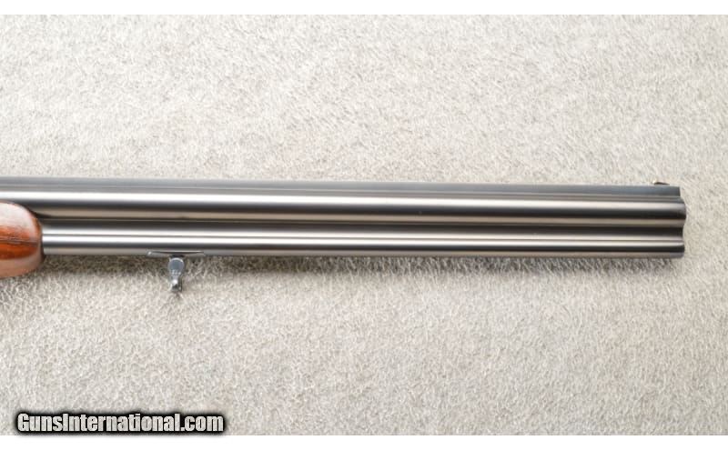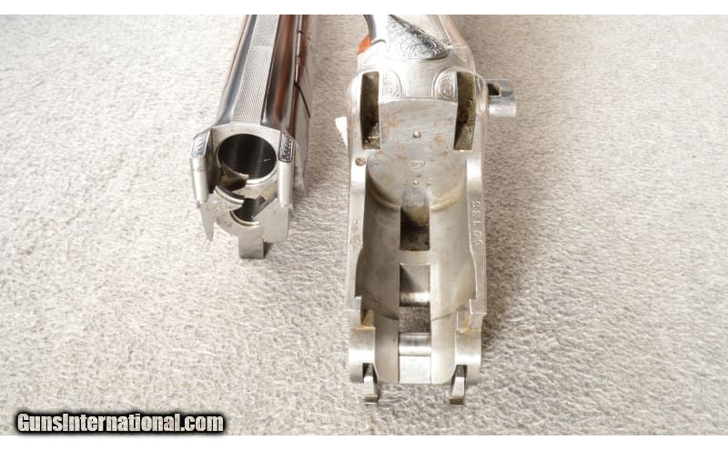 Description: This Gebruder Merkel Scalloped Boxlock Shotgun features a Kersetn crossbolt action with cocking indicators, double trigger (adjustable set trigger), engraved coin finish action displays scroll engraving surrounding a roaring red stag and two hinds on the left and a dog and mallard scene on the right, shadow line cheek piece butt stock with fine point checkering on pistol grip with horn grip cap, engraved blued trigger guard, tang lever blued & engraved, Nitro proofed action with import mark, sling swivels, mine multipoint checkered splinter forend with engraved release catch and metal (s/n matching), 16 gauge upper and 7x65R lower 25.5" barrels (marked BOHLER Stahl Weichlot), SUHL proof stamp for April 1959, raised rear U notch sight with raised front bead sight and a hand matted top solid rib. Serial 50123. 16 Gauge SOLD Chambers: Break open. Metal Condition: Excellent with minor handling marks. Wood Condition: "Scattered dings, dents, scratches with a name scratched on the right side stock. Bore Condition: Excellent bores. Barrels: 25.5" barrels. Triggers: Two. Stock Dimensions: LOP 14.25". Butt Pad: Hard rubber. Weight: 6.75 lbs Sights: "Bead, folding. Chokes: Fixed. Item Location: Owatonna, MN |