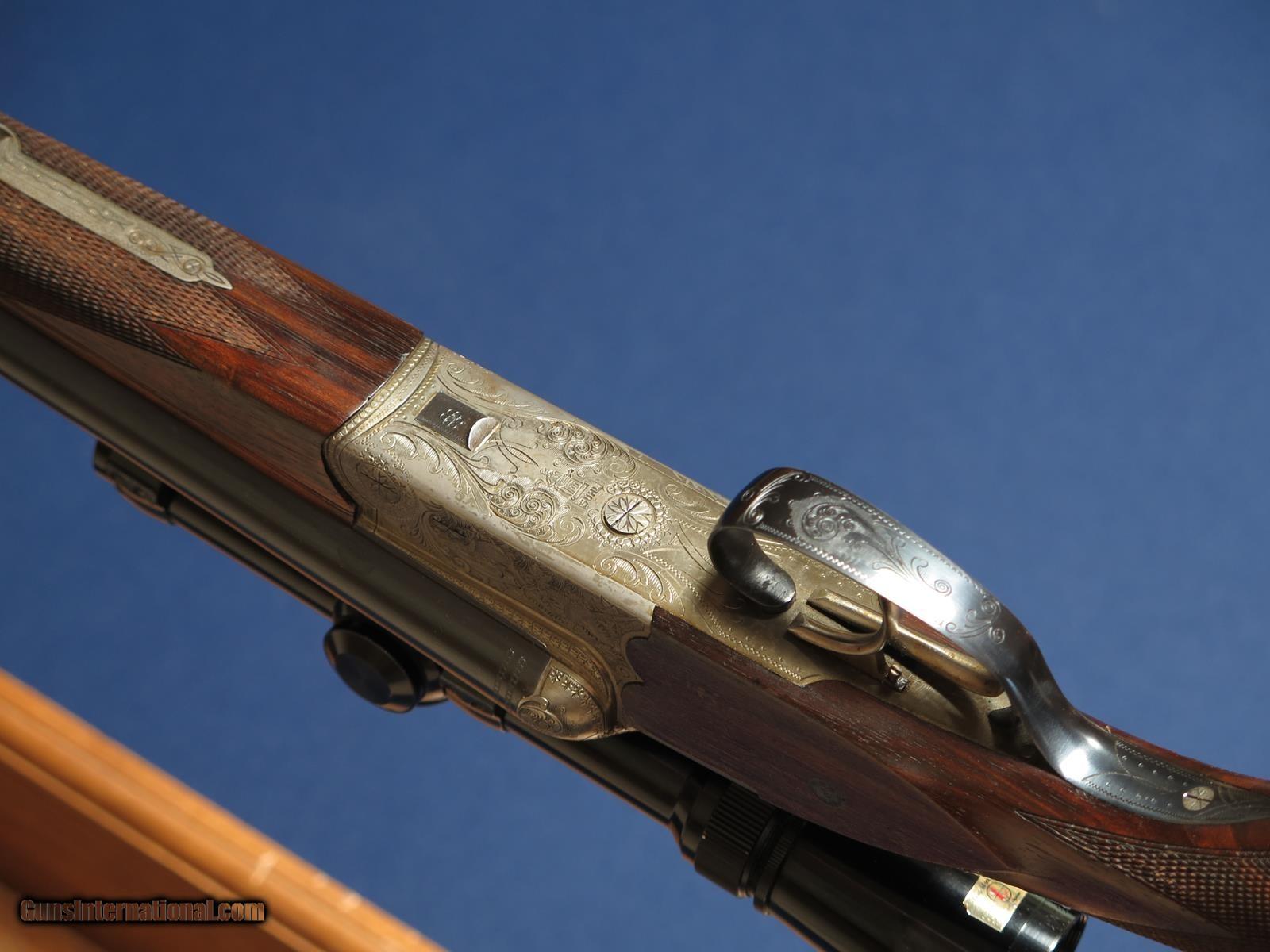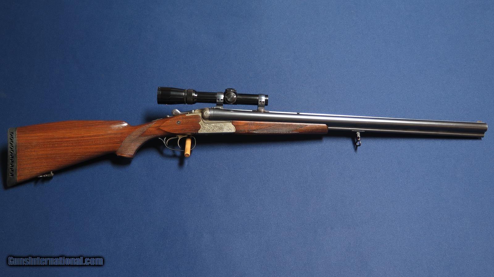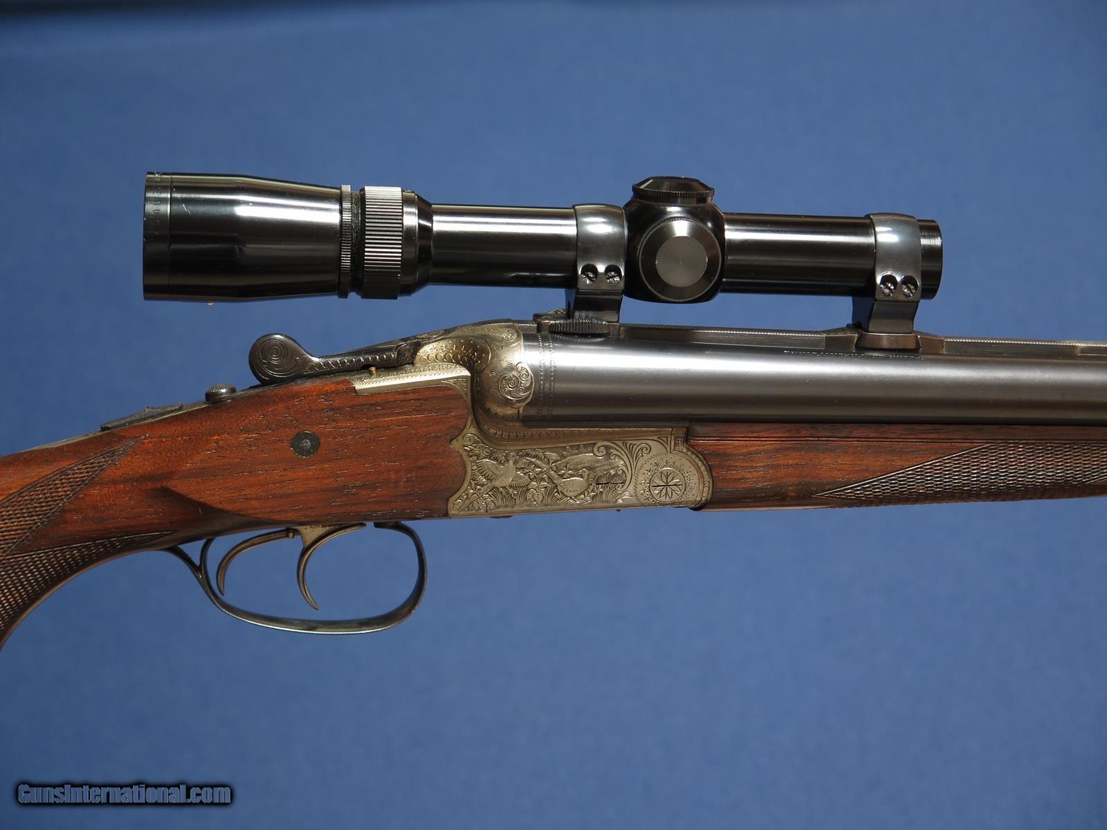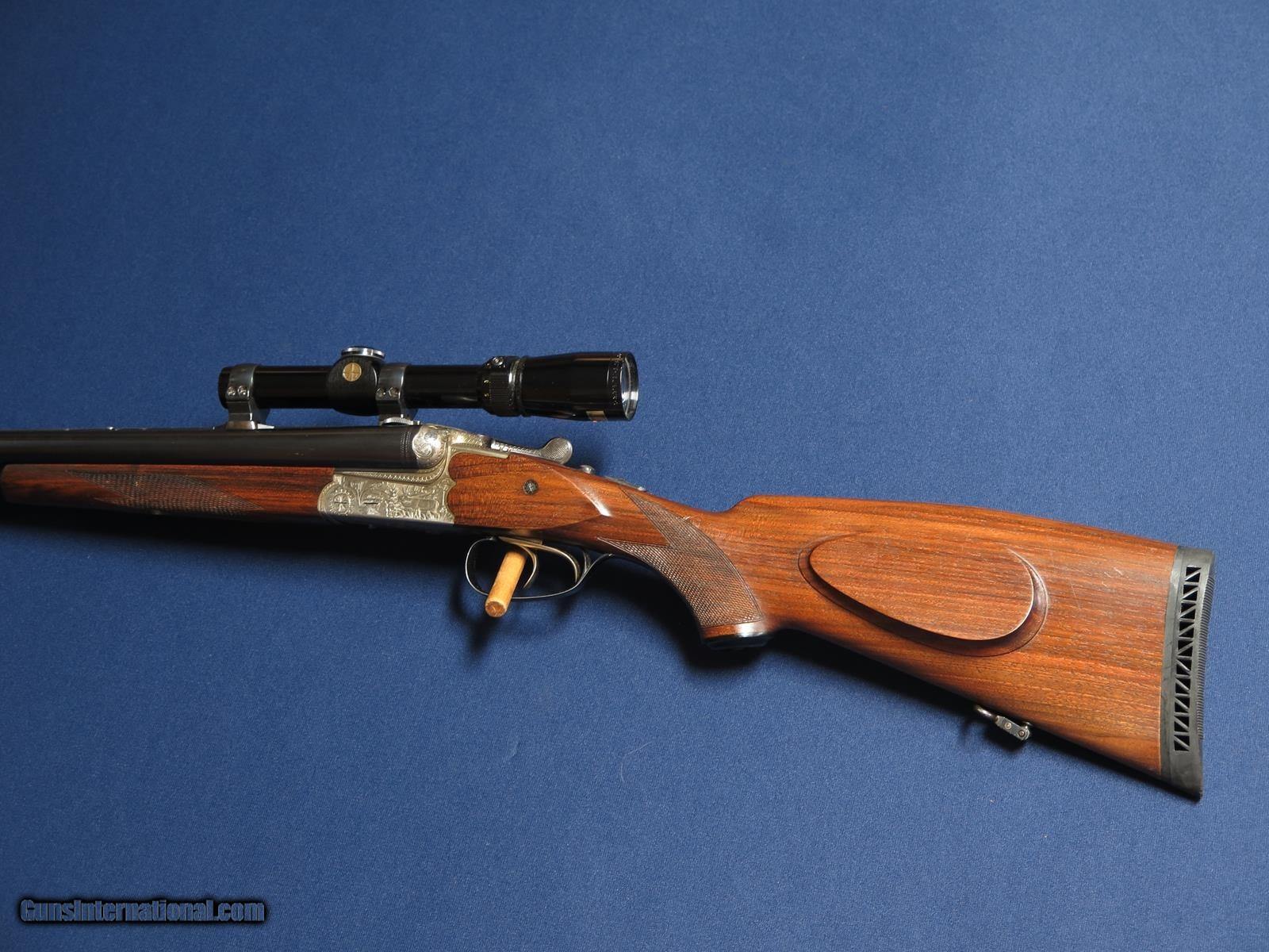 Description: Merkel game scene engraved drilling 12ga/12ga/5.7x43 (222 Rem) 25 inch barrels. Double triggers. Cocking indicators. Side clips. Greener cross bolt. 14 3/4 LOP pad. 14 inch LOP to curved wood. Wood has not been cut. Leupold Vari X III 1.5x5 scope with claw mount rings. Gun is tight and in excellent condition and bores. 2 3/4 chambers. 1977 mfg. Over 45 years in business, and not only do we buy guns, but we accept collections (and single/multiple guns) on consignment. SOLD |
