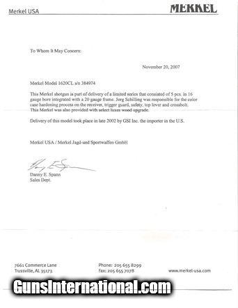 Description: Merkel 1620CL 16 Ga shotgun. Limited edition boxlock double with case colored receiver and extra deluxe walnut. Has 28” MOD/ IMP MOD barrels. Only 5 of this model were made in 16 Ga, on the 20 Ga frame, in 2002. Comes with letter explaining the history of the gun. With case. SOLD |