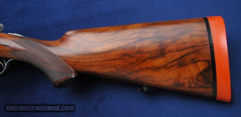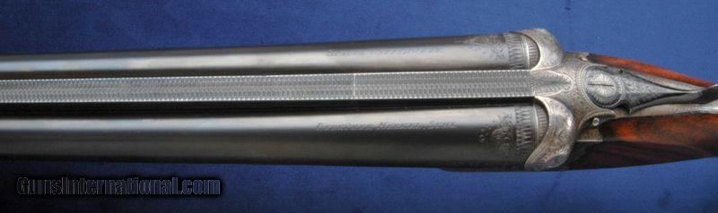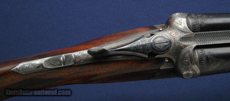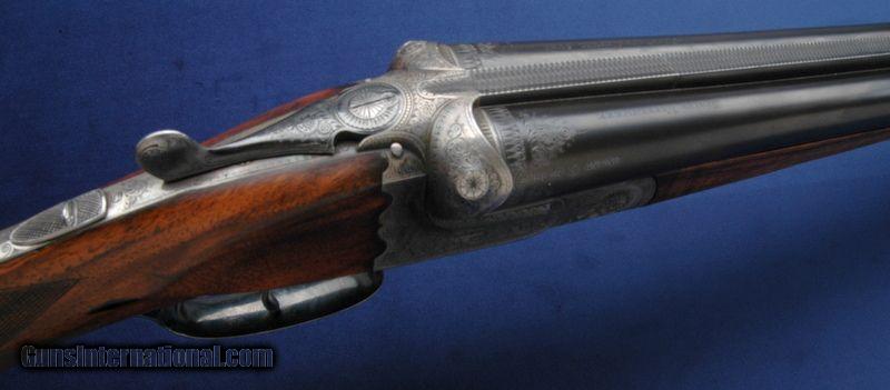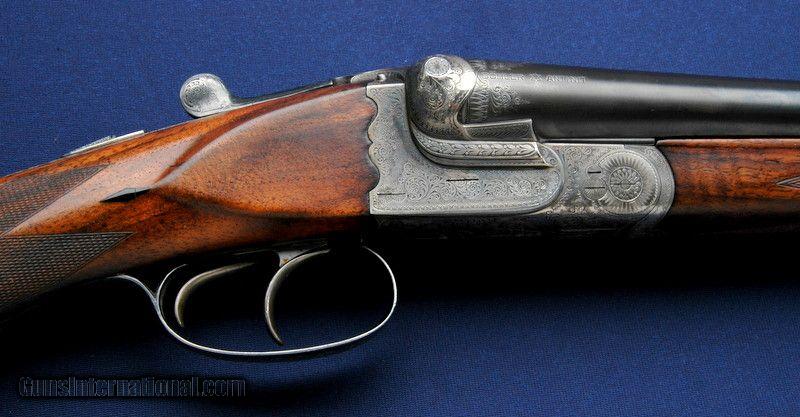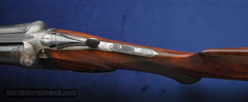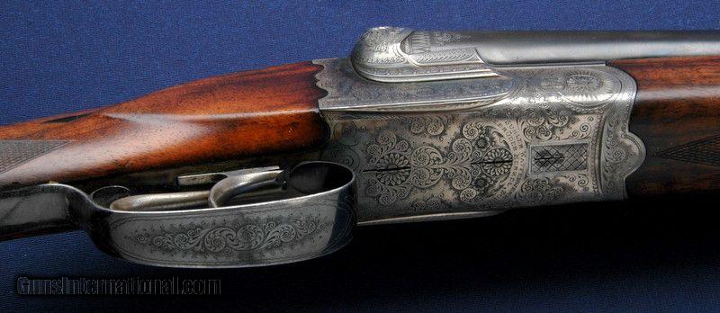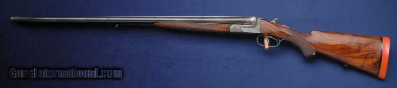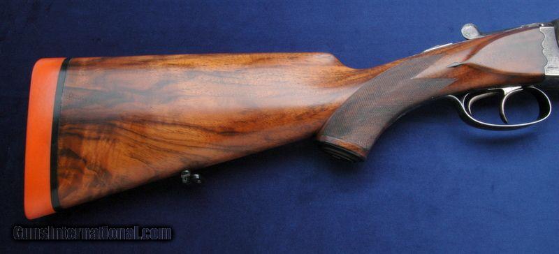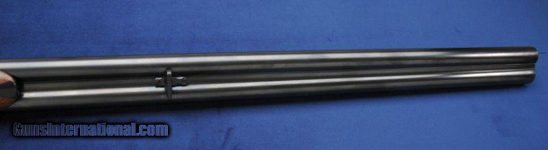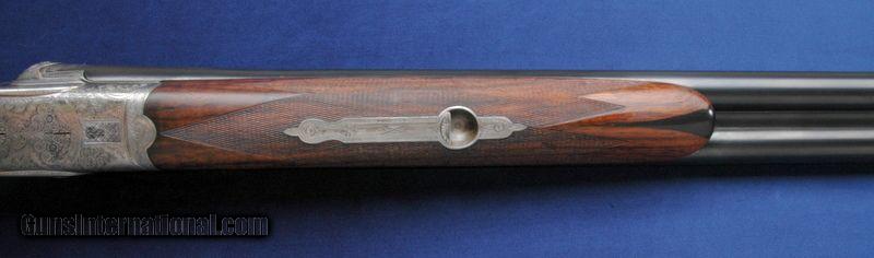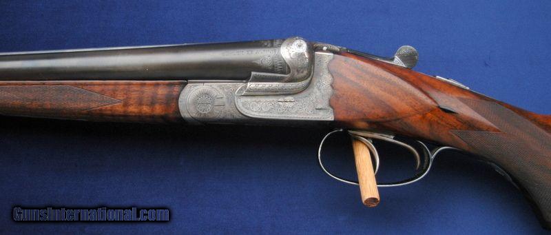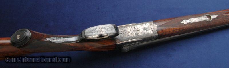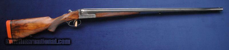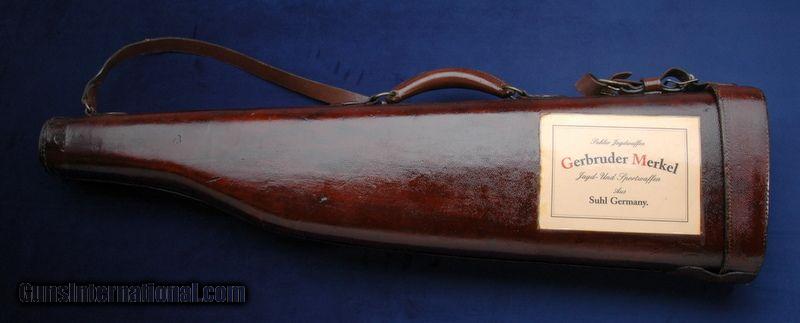Description: As the title says, this is a beautiful 1929 Gebruder Merkel SxS shotgun. 29 1/2" barrels with factory 2 3/4" chambers (stamped 70mm). Cyl/IC chokes, nitro proofed, ejectors. Boxlock with cocking indicators and cross bolt. Tight as the day it was made. Pistol grip with long tang straight grip and beautiful 4x wood with modern dimensions, 28 lpi checkering, no cheek piece, correct 1/2" sling swivels, correct period red rubber recoil pad showing wear consistent with the rest of the gun (may be original). Jeweled finish fore end iron. Very fine, full coverage engraving in excellent condition. Loads of stampings/proofs on the action flats and barrel table. Comes with a leg-0-mutton leather case with Gebruder-Merkel tag. Weight is a bit over 6 lbs, (6lbs, 1.1oz). LOP 14 1/4", DAH 2 1/8", DAC 1 7/16". Fantastic quail, ruffled grouse and woodcock gun that you can carry all day- really does carry like a 20ga and shoots like a 12! Will rate it 90+% overall. You need to see this shotgun to appreciate the artistry and the wood. The pics are ok, but they cannot do a classic like this justice. Very hard to find. $100 shipping, 3% surcharge for using a CC. SOLD |