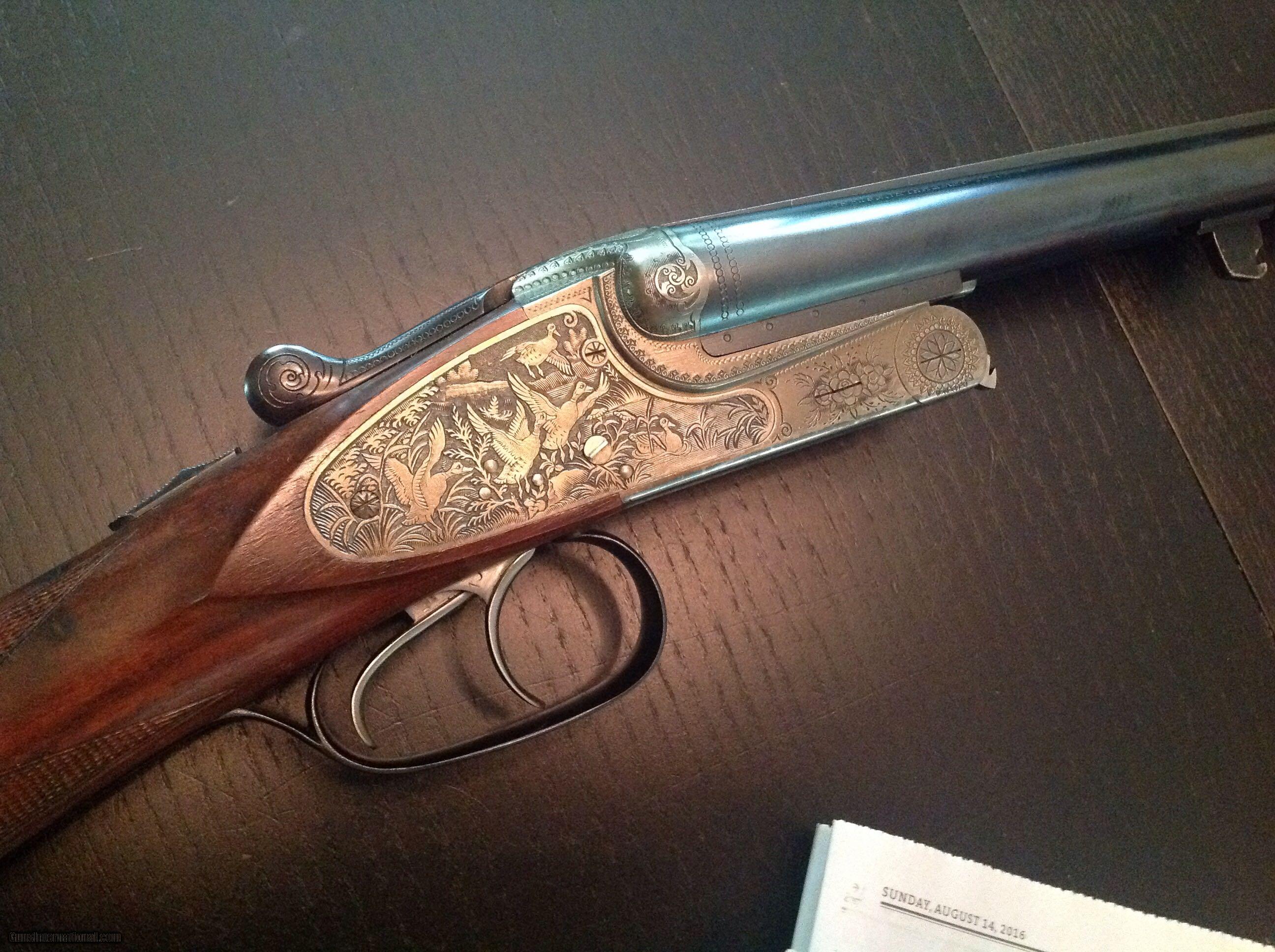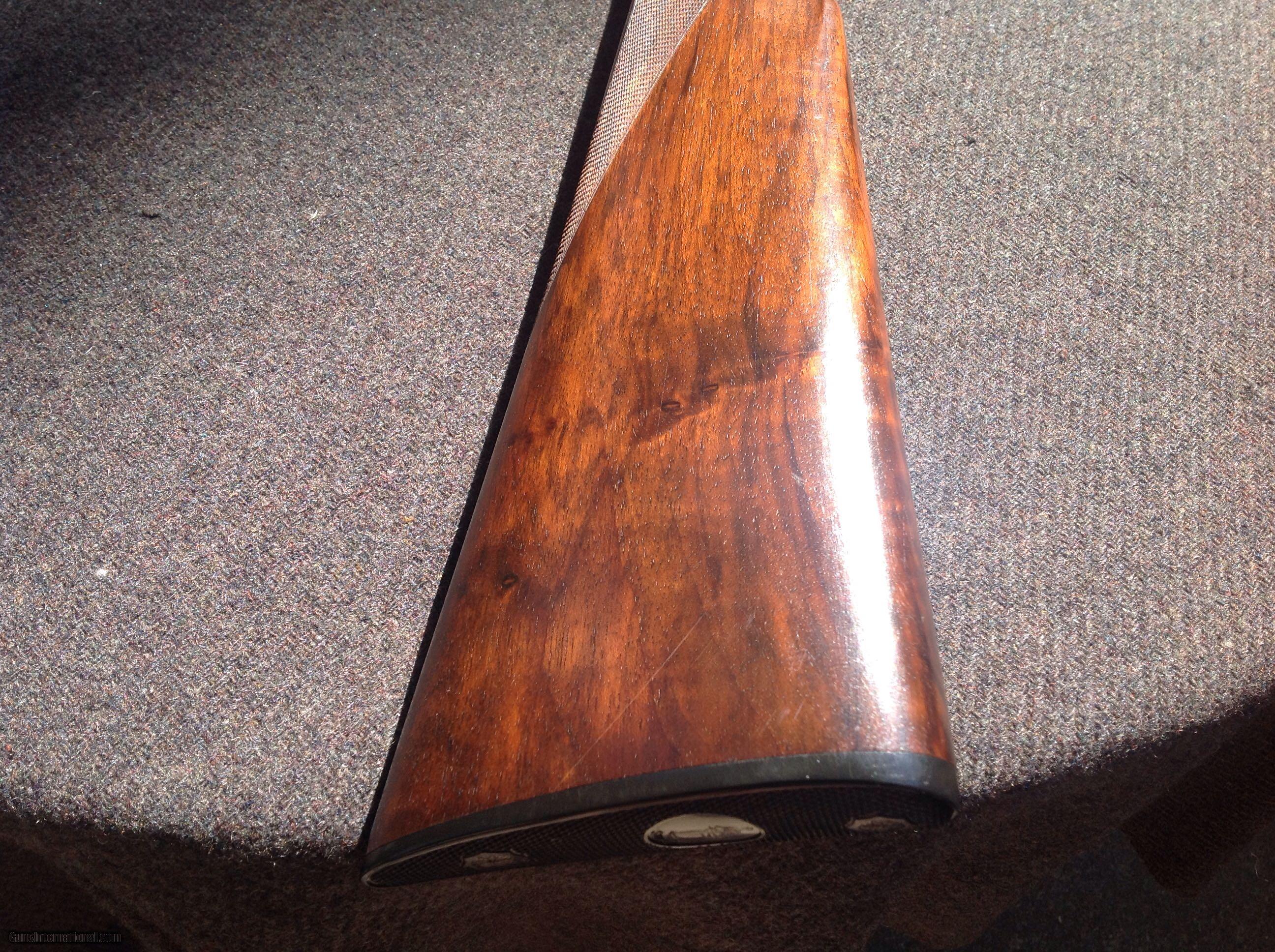 Description: Made in German Democratic Republic. Coin finished sidelock action with Greener crossbolt and chopper lump extension, 26 in. fixed choke barrels, ejectors. Double triggers, deluxe game scene engraving. Tang mounted automatic safety and mounted with an extra fancy multi-point checkered English walnut forearm and straight grip stock with black plastic Merkel buttplate. Gun is in remarkable condtion overall. Mirror bores! Gun is very tight! Only flaw is small chip missing from heel (see photos). SOLD Manufacturer: GEBR MERKEL SUHL Model: 147SL Serial Number: 761043 Chambers: 3 Ejectors: Y Condition: 95 Metal Condition: 95 Wood Condition: 95 Bore Condition: 100 Barrel Type: Special steel Triggers: D Gauge Info: 20 Stock: Walnut LOP: 14.5 Rib: Solid Finish: Blue Engraving: Deluxe |