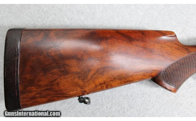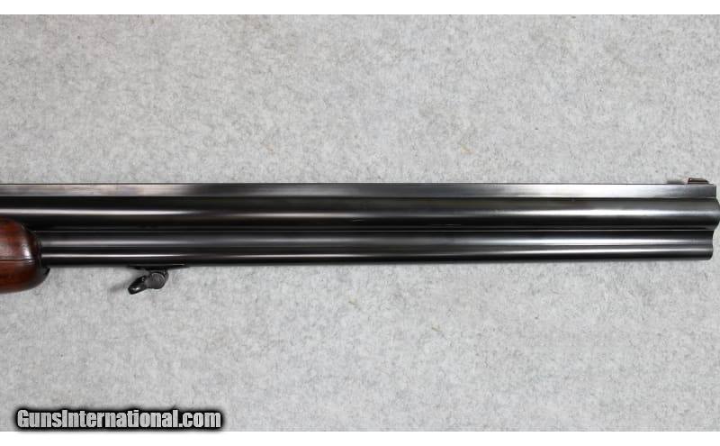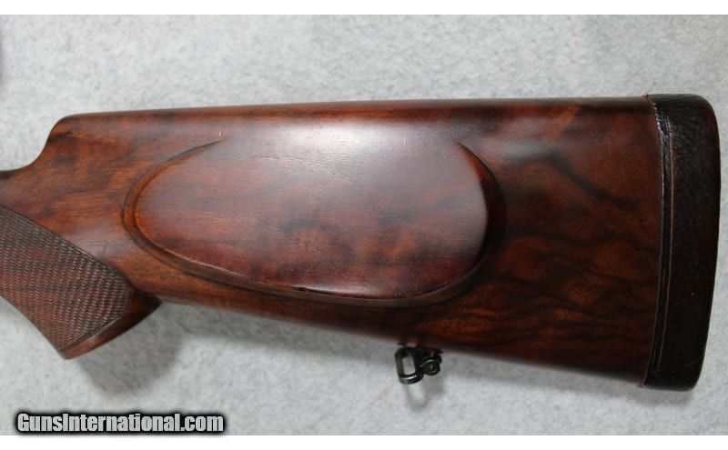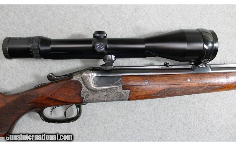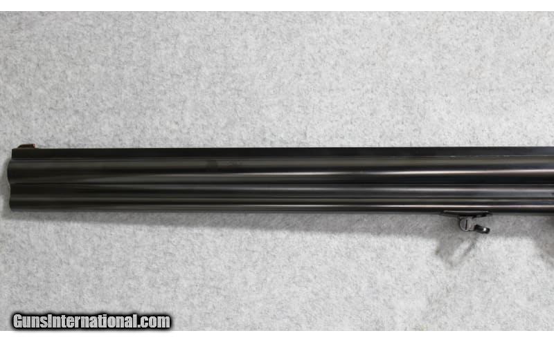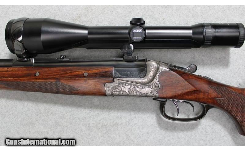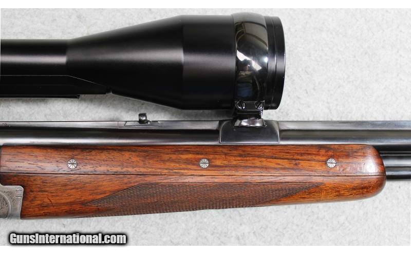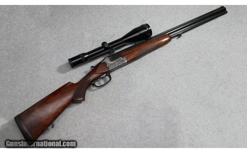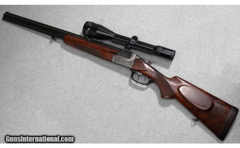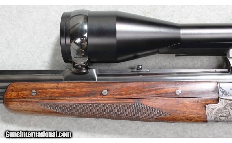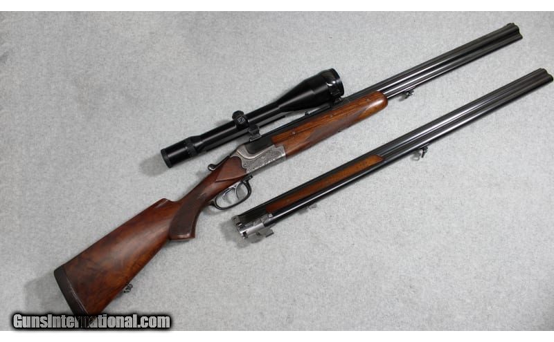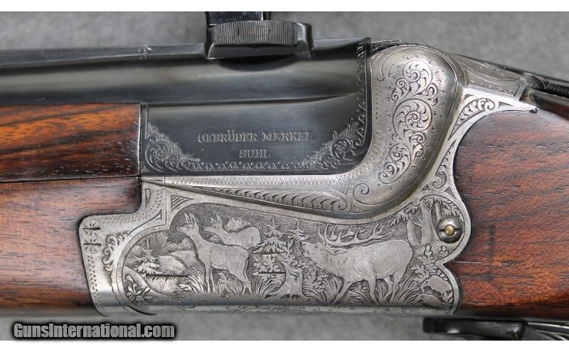 Description: This is a Gebruder Merkel Game Scene engraved Over/Under combination Gun with two barrels. The first barrel is chambered in 16-Gauge on the top and chambered in 7x65R on the bottom. The second barrel is an over/under 16-gauge double barrel. There is a mounted Zeiss Diavari-ZM scope with a magnification of 3-12x56. This firearm has a checkered walnut foregrip and a walnut stock with a leather butt pad and shadowline cheekpiece.. The coin finished bolstered boxlock action displays scroll engraving surround a roaring red stag and two hinds on the left and a dog and mallard scene on the right. The gun features double triggers and a tang mounted manual safety switch. 1960 dated German proofs, light engraving around the upper breech, and import mark under forend. 16/7X65R SOLD Metal Condition: Very good with minor handling marks Wood Condition: Very good with minor handling marks Bore Condition: Bright and clear with no pitting Barrels: "(1) 25.5 "" 16 Gauge over 7x57R rifle, (1) 28"" 16 Gauge Over & Under Triggers: "Double, Single Set Front Stock Dimensions: Length of pull 14 13/16 Fore End: Checkered walnut Butt Pad: Leather butt pad Weight: 9 lb 5 oz Sights: "Zeiss Diavari-ZM scope (3-12x56 magnification), Quick Detach Mounts Chokes: Full Item Location: Buda, TX |