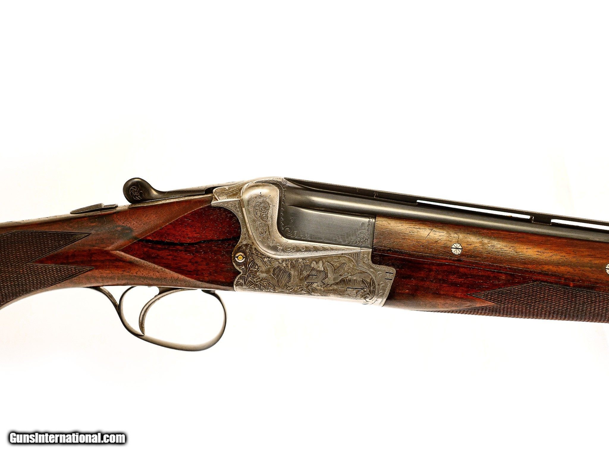 Description: Gebruder Merkel - O/U, 28ga. 28 1/2" Barrels Choked IC/M. Factory single trigger, auto ejector, magnificent game scene engraved, capped pistol grip, vent rib, 3 piece forend. This is a donation gun from Pachmayer, as inscribed on oval. Gun was manufactured in January 1967. New and unfired with some VERY minor closet marks, highly figured Turkish walnut, very desirable small bore German gun, with very high grade workmanship, and in near perfect condition. Inv: 62515 5 lbs. 15 oz. 14 3/8" x 1 3/8" x 2 1/4" $8,995.00 SOLD |
