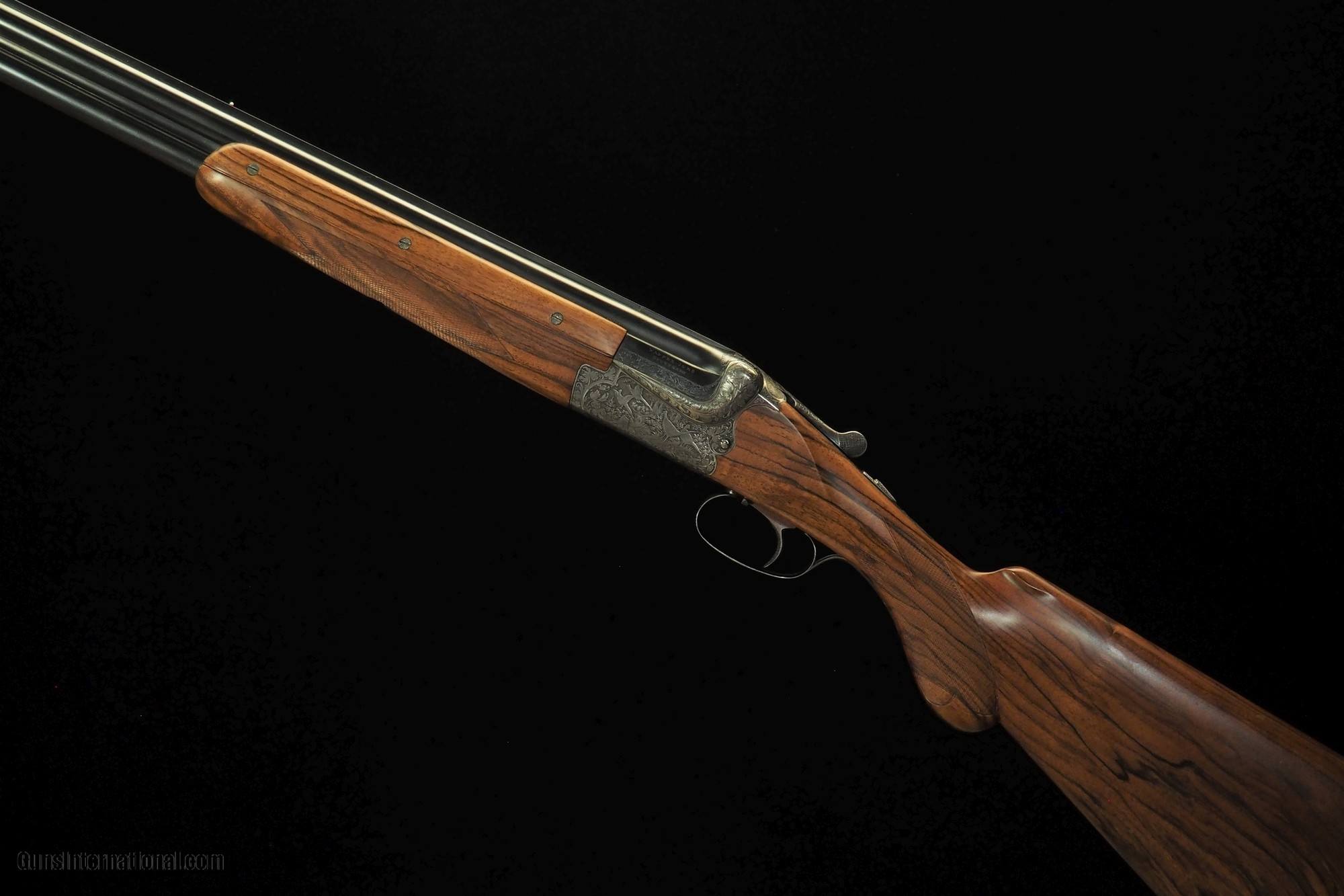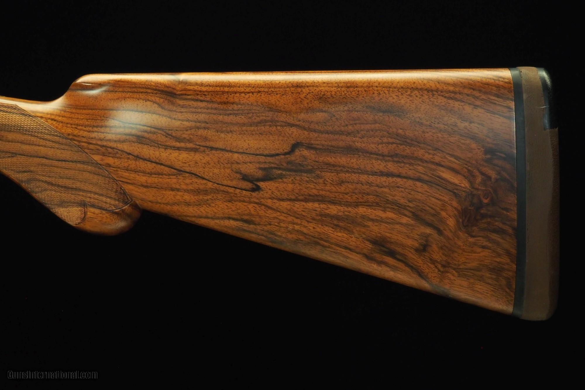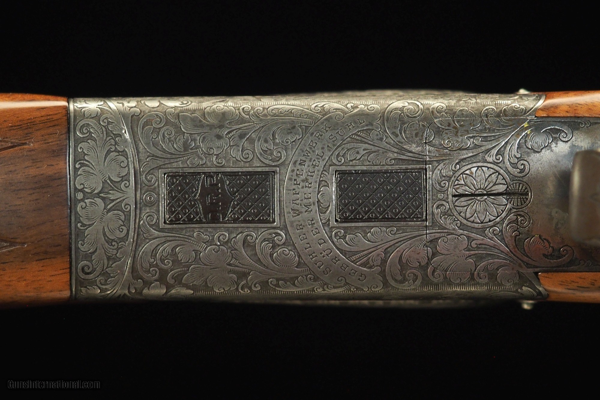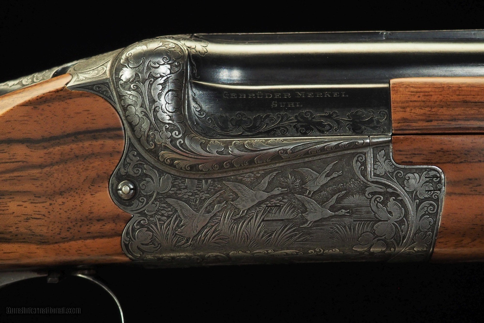 Description: Gebruder Merkel, Suhl Germany, circa 1936, 201E Boxlock Ejector, 12 Bore, 7 lbs. 2 oz., nitro proved 70mm (2 3/4") chambers, 74 cm (29 1/8") Bohler steel barrels with a solid machined game rib, double Kersten lock extensions, ejectors, mid and front beads, choked .008 IC and .019 Mod., right rear of barrels engraved with maker "Gebruder Merkel, Suhl" and left with retailer "Waffen-Jung, Stuttgart", scalloped back boxlock action with double Kersten cross-bolt locks, pop-out cocking indicators, hidden toggle lever lock release, top-tang non-automatic safety, selectable single trigger, old silver finish with fine game scene hand engraving depicting pheasants on the left side and ducks on the right side both in natural setting scenes along with bold foliate throughout remainder and on bottom, full background stippling gives great contrast, bottom with banner engraved "Suhler Waffenwerk, Gebruder Merkel, Suhl" exposed bottom of barrel lug engraved with assumed original owner's initials "D.R.P.", properly restocked in very nicely figured English walnut for left hand shooter, 15" LOP over a pad, 1 7/16" DAC, 2 3/16" DAH, 1/8" cast on with toe twist for left hand shooter, round knob grip, 3-piece forend. Excellent condition used gun nice and tight and correct, shows very little if any use since restock, front bead missing white insert that's easily replaced. A very high quality pre-war gun. SOLD Shotgun Gauge: 12 Gauge |