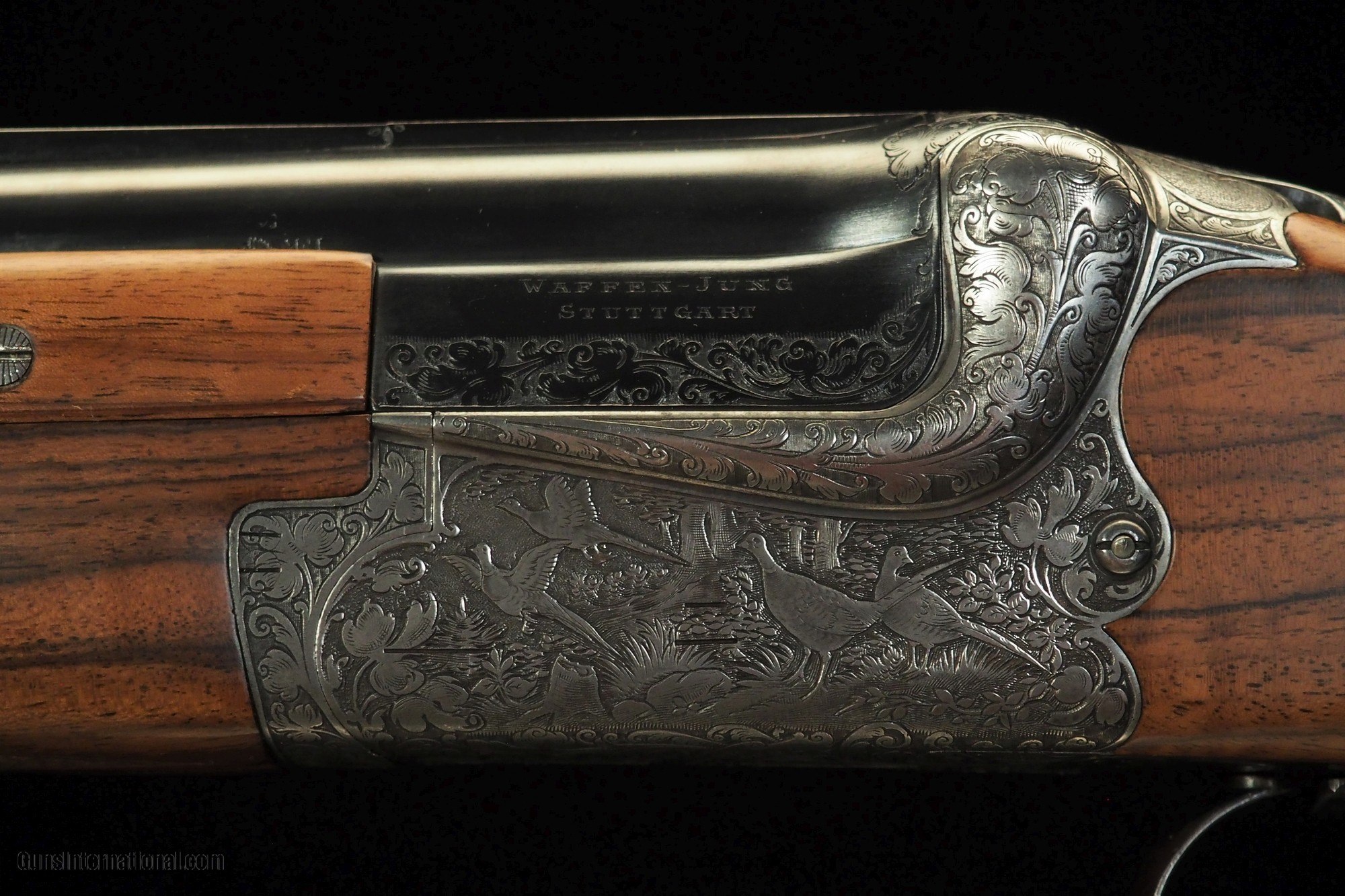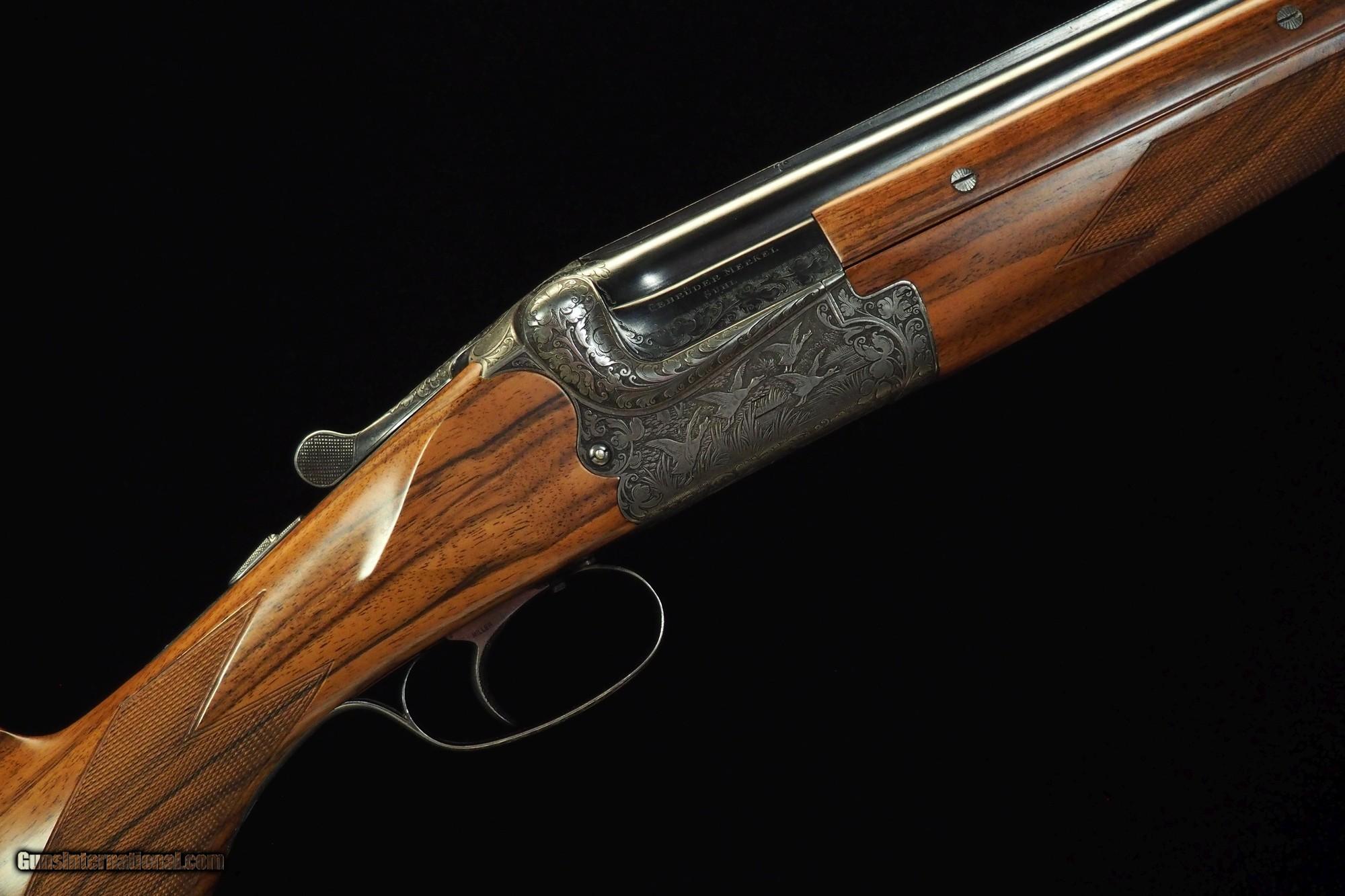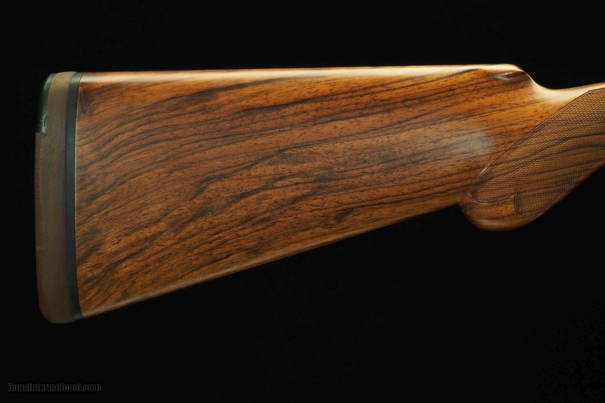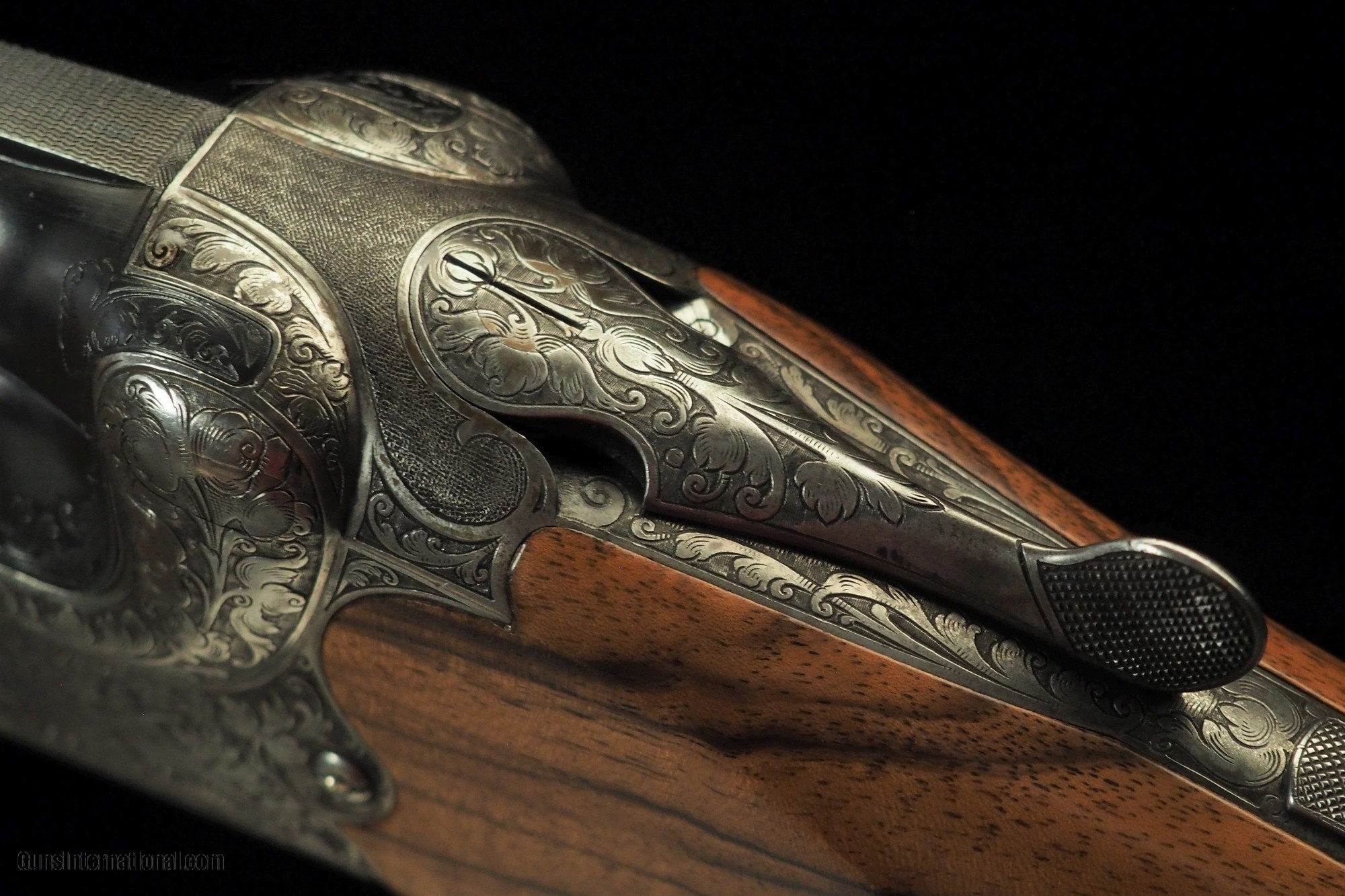 Description: Gebruder Merkel, Suhl Germany, circa 1936, 201E Boxlock Ejector, 12 Bore, 7 lbs. 2 oz., nitro proved 70mm (2 3/4") chambers, 74 cm (29 1/8") Bohler steel barrels with a solid machined game rib, double Kersten lock extensions, ejectors, mid and front beads, choked .008 IC and .019 Mod., right rear of barrels engraved with maker "Gebruder Merkel, Suhl" and left with retailer "Waffen-Jung, Stuttgart", scalloped back boxlock action with double Kersten cross-bolt locks, pop-out cocking indicators, hidden toggle lever lock release, top-tang non-automatic safety, selectable single trigger, old silver finish with fine game scene hand engraving depicting pheasants on the left side and ducks on the right side both in natural setting scenes along with bold foliate throughout remainder and on bottom, full background stippling gives great contrast, bottom with banner engraved "Suhler Waffenwerk, Gebruder Merkel, Suhl" exposed bottom of barrel lug engraved with assumed original owner's initials "D.R.P.", properly restocked in very nicely figured English walnut for left hand shooter, 15" LOP over a pad, 1 7/16" DAC, 2 3/16" DAH, 1/8" cast on with toe twist for left hand shooter, round knob grip, 3-piece forend. Excellent condition used gun nice and tight and correct, shows very little if any use since restock, front bead missing white insert that's easily replaced. A very high quality pre-war gun. SOLD Shotgun Gauge: 12 Gauge |