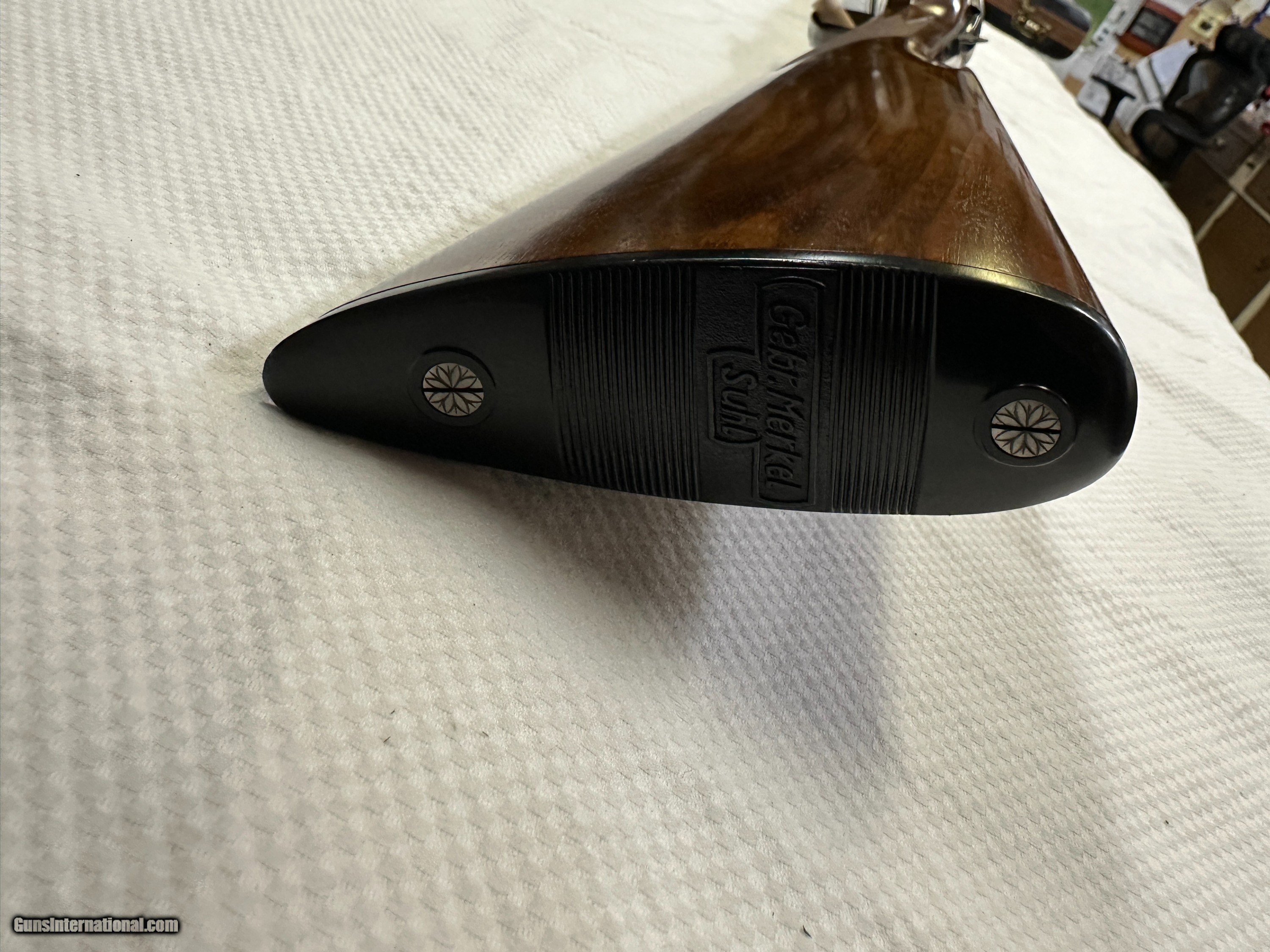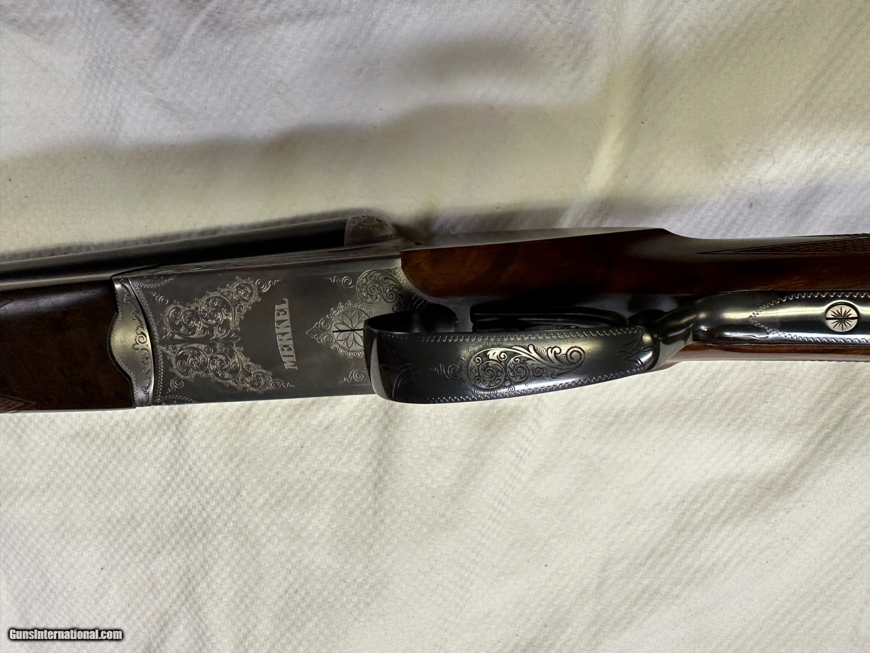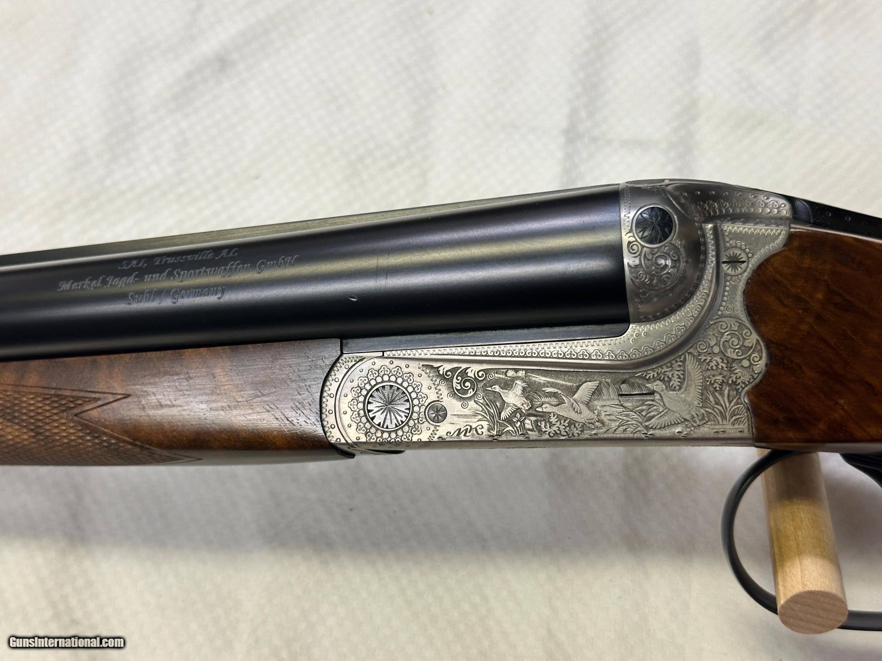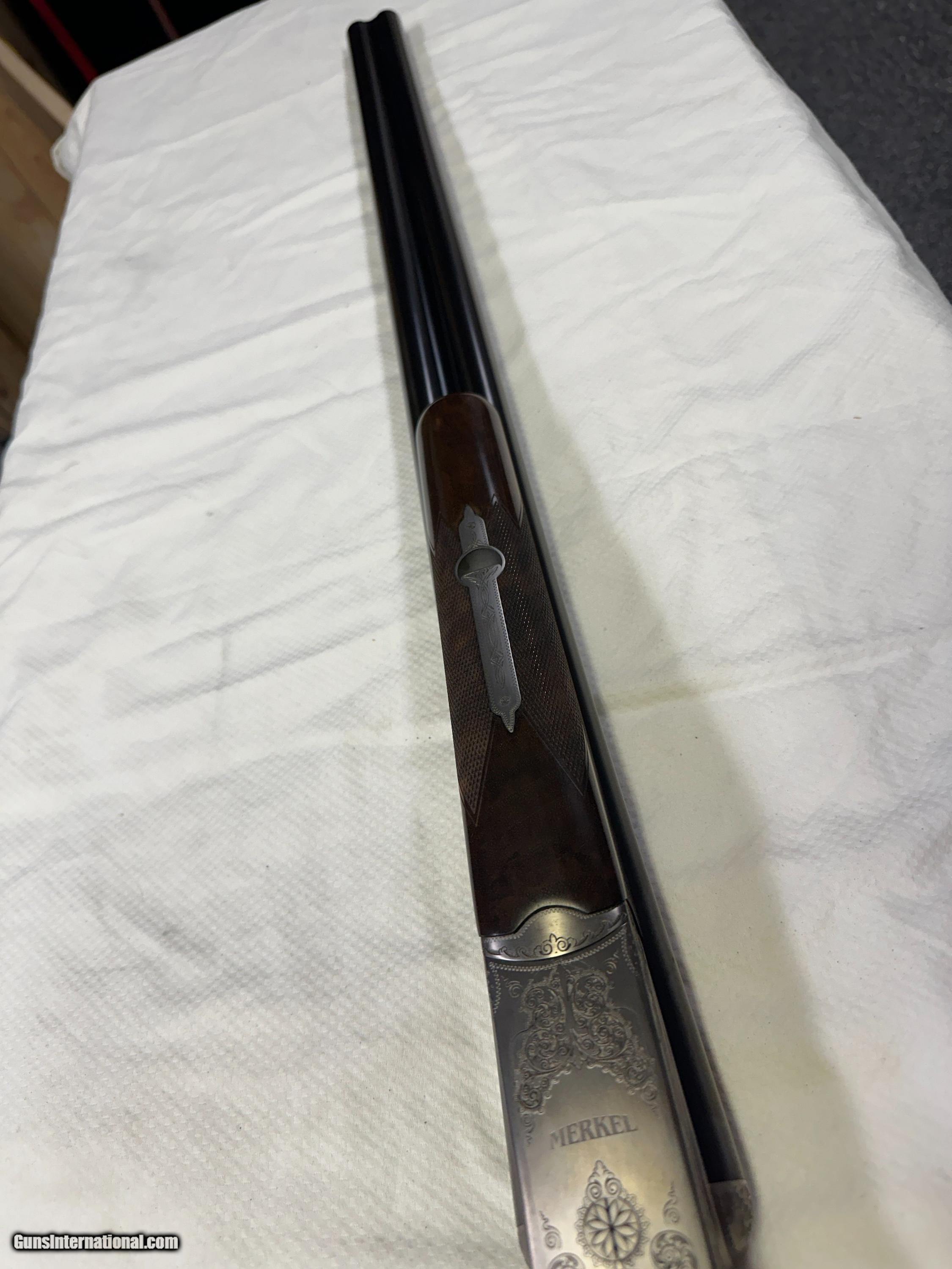 Description: Beauitful Merkel 147E in 98+% condition has been fired but very little and shows as near new. Double triggers and ejectors chokes are fixed Mod/IC. Gun comes with free new but slightly damaged Negrini case. No California sales. Arkansas residents will be charged 7.5% sales tax. Buyer pays actual shipping and insurance cost. Item will only be shipped to verified FFL, be sure you can purchase item where you live. No returns unless item is not as advertised, buyer will pay for all return FFL fee's, shipping and insurance cost. SOLD Shotgun Gauge: 12 Gauge Manufacturer: Merkel Model: 147E Serial Number: 388629 Barrel Length: 27 7/8 Bore: MOD / IC Chambers: 3 Ejectors: YES Condition: 98%+ Metal Condition: 98%+ Wood Condition: 98%+ Bore Condition: 100% Barrels: SIDE BY SIDE Barrel Type: SIDE BY SIDE Action: Break open Triggers: TWO Stock: WOOD / ENGLISH Stock Drop: 1 15/16 Stock Comb: 1 1/2 Stock Heel: 2 1/2 Stock Cast: NONE Fore End: WOOD / SPLINTER STYLE Butt Pad: FACTORY ORIGINAL LOP: 14.25 TO FRONT TRIGGER Rib: YES 3/8" wide Finish: Gloss Weight: 7.3 LBS. Sights: FRONT BEAD Chokes: FIXED Choke Left: MOD Choke Right: IC Engraving: YES FACTORY Case: Negrini with small dent Item Location: Arkansas |