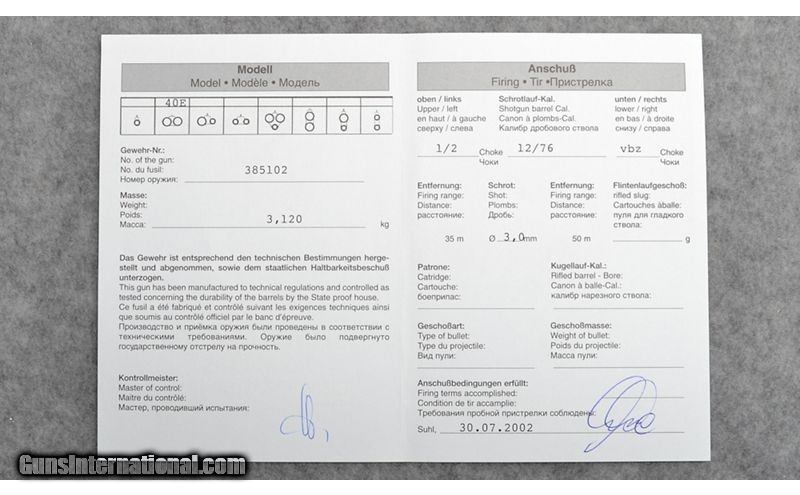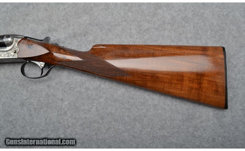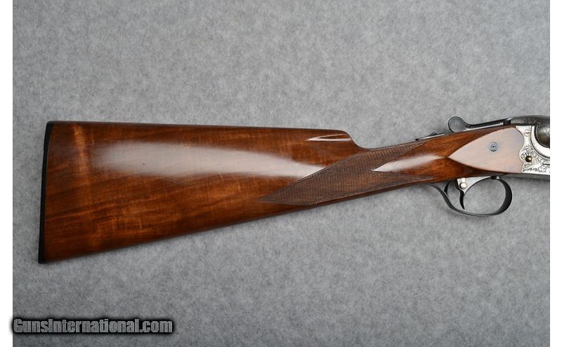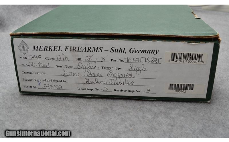 Description: This Merkel 147E was completed in July of 2002 and is engraved and signed by Gerhard Liebscher. The 28" Krupp barrels are choked improved cylinder and modified making it a great choice for an all around game gun. The straight stock and splinter fore end add to its ability as an excellent choice for upland game. Brass cocking indicators are easy to see and feel in low light conditions. The 147E is also equipped with ejectors and a Greener style cross bolt as a third fastener. This is an extremely solid built gun made for generation after generation of use. 12 Gauge SOLD Chambers: 3 Metal Condition: Excellent Wood Condition: Very Good showing minor use and Sharp checkering Bore Condition: Excellent Barrels: 28 Triggers: Single Selective Stock Dimensions: 14 1/4" LOP Fore End: Splinter Fore end with Deeley & Edge Fastener Butt Pad: Factory Hard Rubber Weight: 6 Lbs. 13 Ozs. Sights: Brass Bead Front Chokes: Improved Cylinder / Modified Item Location: Woodbury, MN |