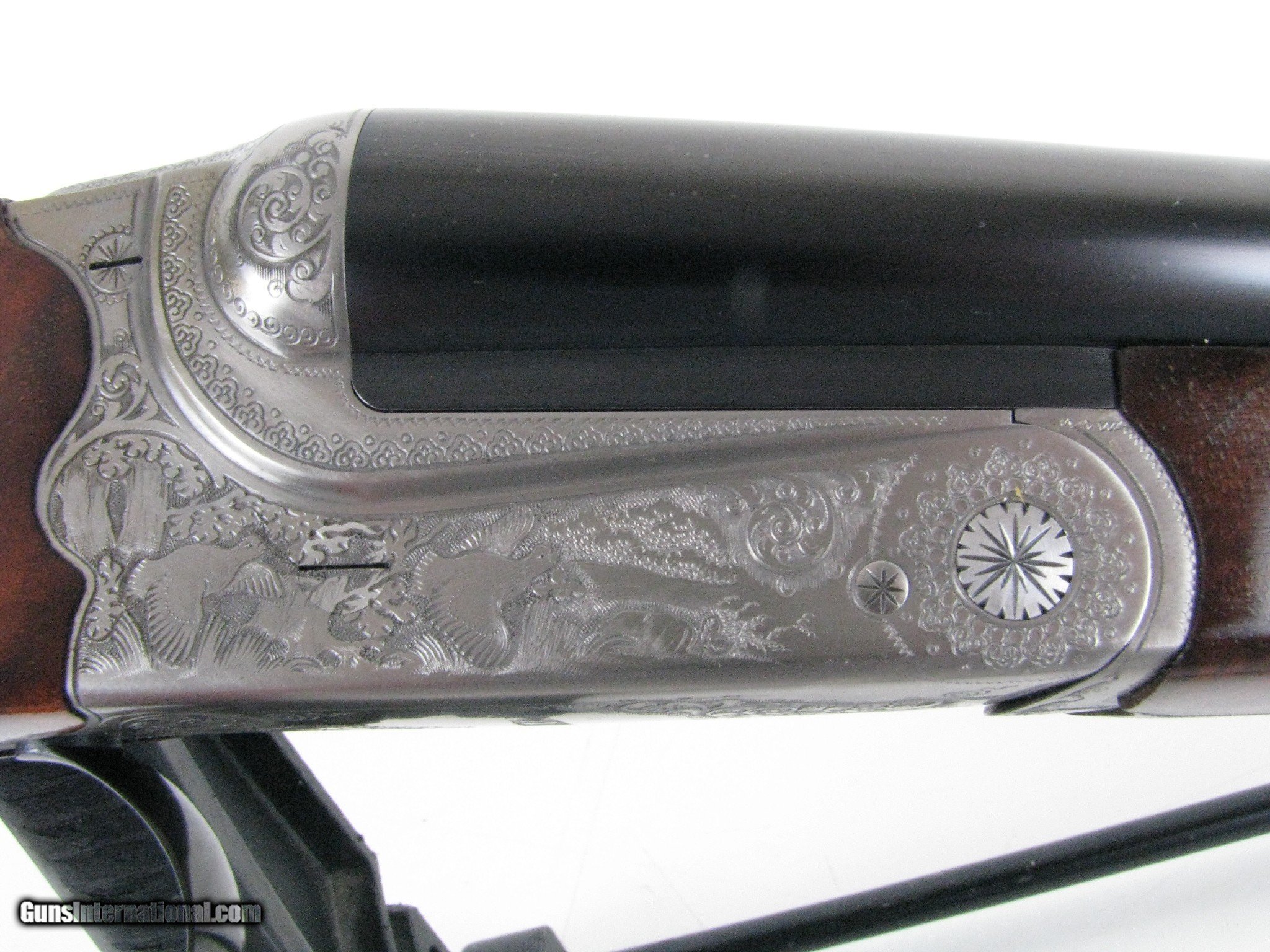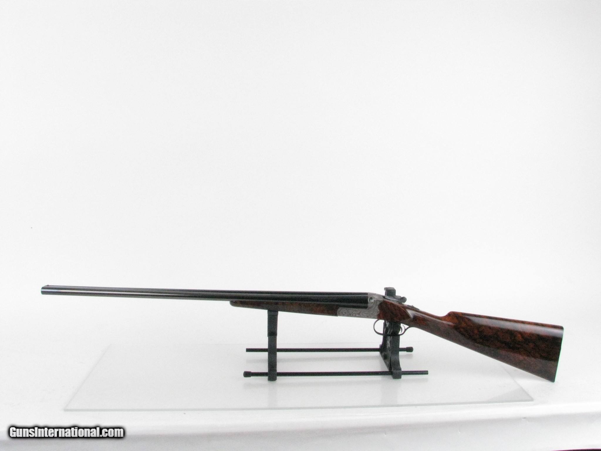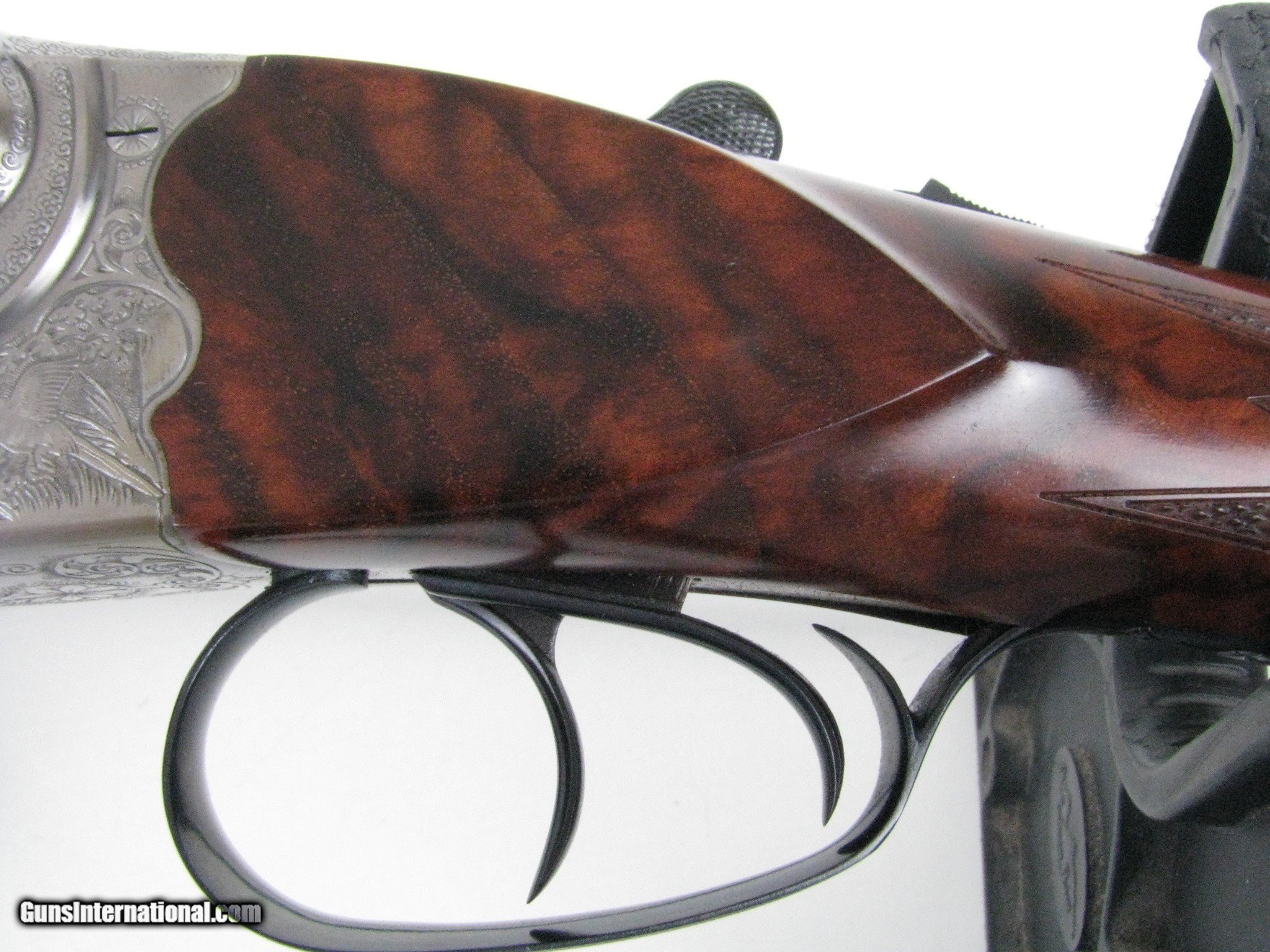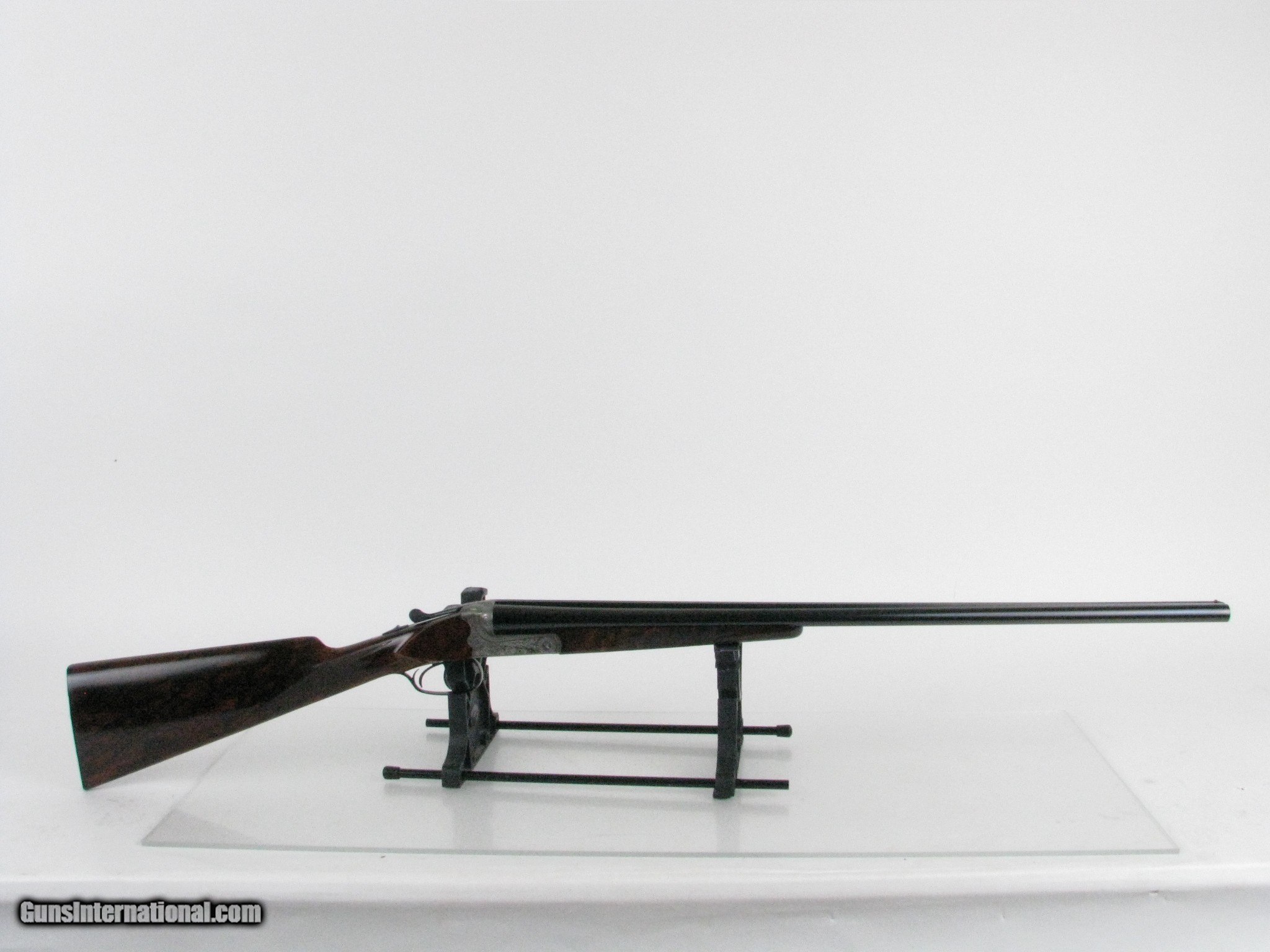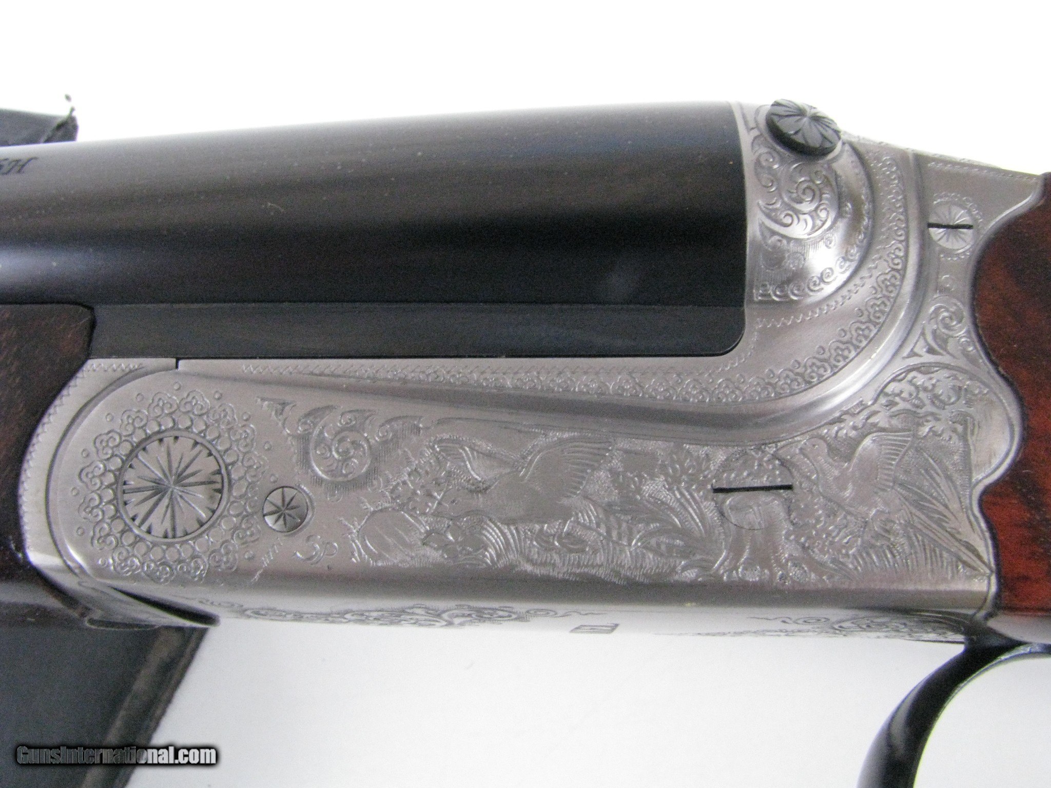 Description: This is a Merkel 147EL Side by Side shotgun chambered in 20 Ga. It is sr# 388442. This is a Greener side lock gun. It has 28" barrels with 3" chambers. The barrels have fixed chokes with one IC and the second Cyl. It has auto safety and ejectors. The length of pull is 14.5 & 13.5 inches long. The drop at comb is 1.75 inches, drop at heel is 2.75 inches. The bore is clean and shiny. The receiver is fully engraved with very nice game scenes. The factory checkered wood stocks are Turkish Walnut and are absolutely gorgeous with no visible cracks. Overall in wonderful condition with minimal signs of use. The lock up is very tight. Check out the pictures for all the details. More pictures available upon request. SOLD Shotgun Gauge: 20 Gauge Manufacturer: Merkel Model: 147EL Ejectors: Holland and Holland Condition: Mint Metal Condition: Mint Wood Condition: Mint Bore Condition: Mint Stock Comb: 1.75 Stock Heel: 2.75 Stock Cast: None Choke Left: IC Choke Right: Cyl Engraving: Factory |