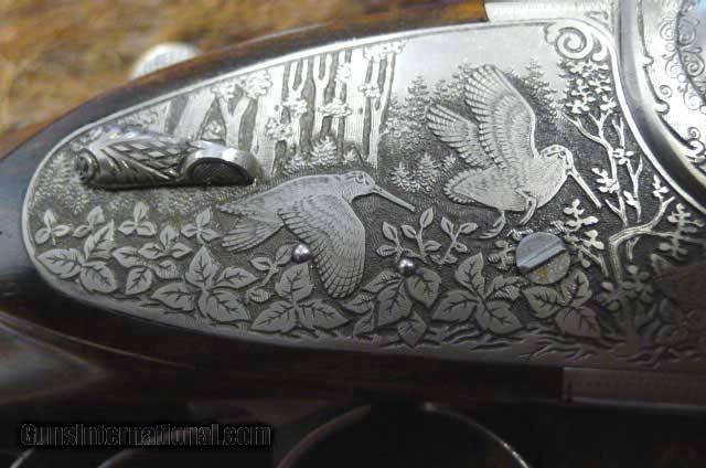 Description: Description: L.L.BEAN 100th ANNIVERSARY MERKEL SIDELOCK EJECTOR SHOTGUN ... 20 gauge ... 28" shoe lump barrels with concave matted game rib ... 3" chambers ... weight 6 lbs 4 oz ... LOP 14 1/2" over checkered butt plate ... drop comb 1 7/16" ... drop heel 2 1/2" ... bore dia: L.625 R.625, bore restrictions: L.014(Mod) R..008(IC), wall thickness: L.030 R.031 ... ejectors ... automatic safety ... cocking indicators ... detachable locks with H&H style takedown pins ... double triggers. This is the last one they made, number 20. The coin finished action is engraved and signed by longtime Merkel master engraver, 'B.Hafner'. There is well shaded, open floral scroll surrounding game scenes on each side. The right side shows 3 woodcocks in a dense forest setting with the left side showing a German shorthair on point as 3 ruffed grouse explode from cover and also the engraver's signature. The bottom features a Maine hunting shoe inset in gold and flanked by the years '1912' and '2012'. Smokey colored, densely marbled Circassian walnut was slected for the straight grip English stock and the splinter forearm. The Deeley forearm release also has matching scroll engraving. Finepoint, skipline checkering is generously spread over the front and rear grip surfaces and the butt plate. There is a 'yet-to-be-initialed' gold oval inset in the toeline. The dark brown leather case has stitched corners and a stiched on L.L.Bean label inside and out. Included accessories are a cocobolo & brass two peice cleaning rod, mop & jag & brush in a leather case, snap caps, square plated oil bottle and an L.L.Bean wipe down cloth. Overall condition new. Call with any questions. (Trades for Winchesters or Purdy's considered) SOLD Shotgun Gauge: 20 Gauge |