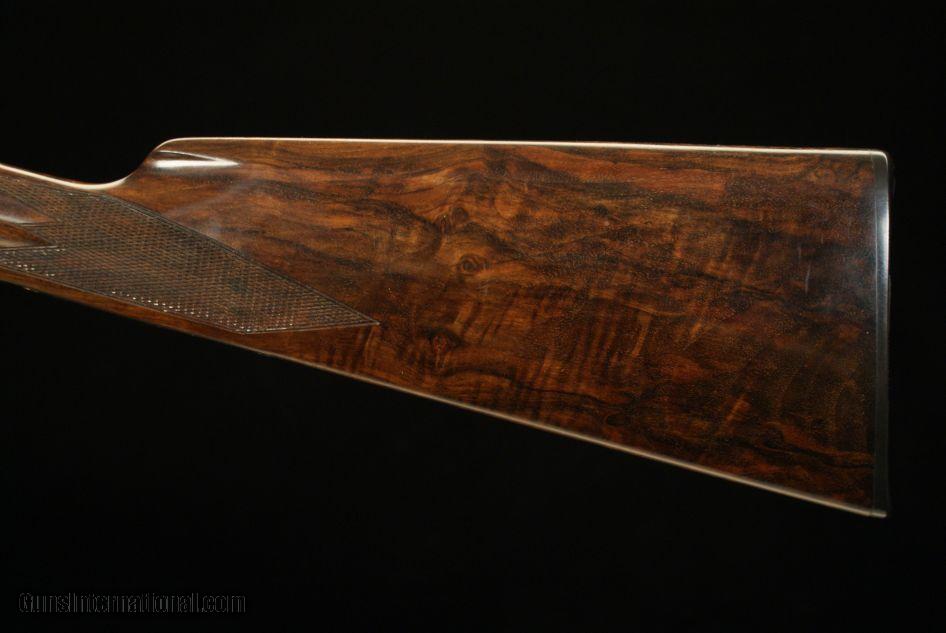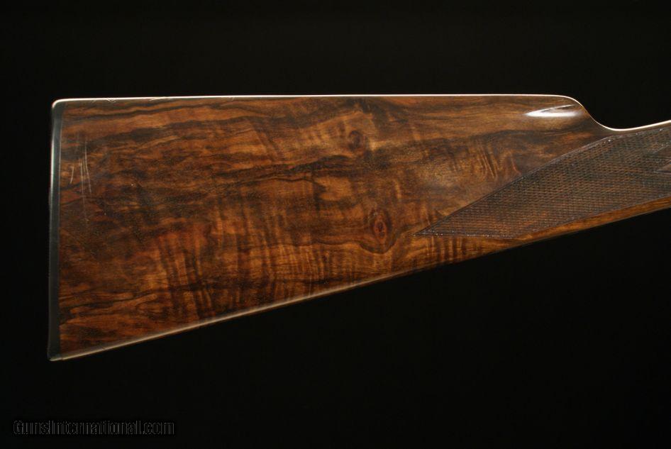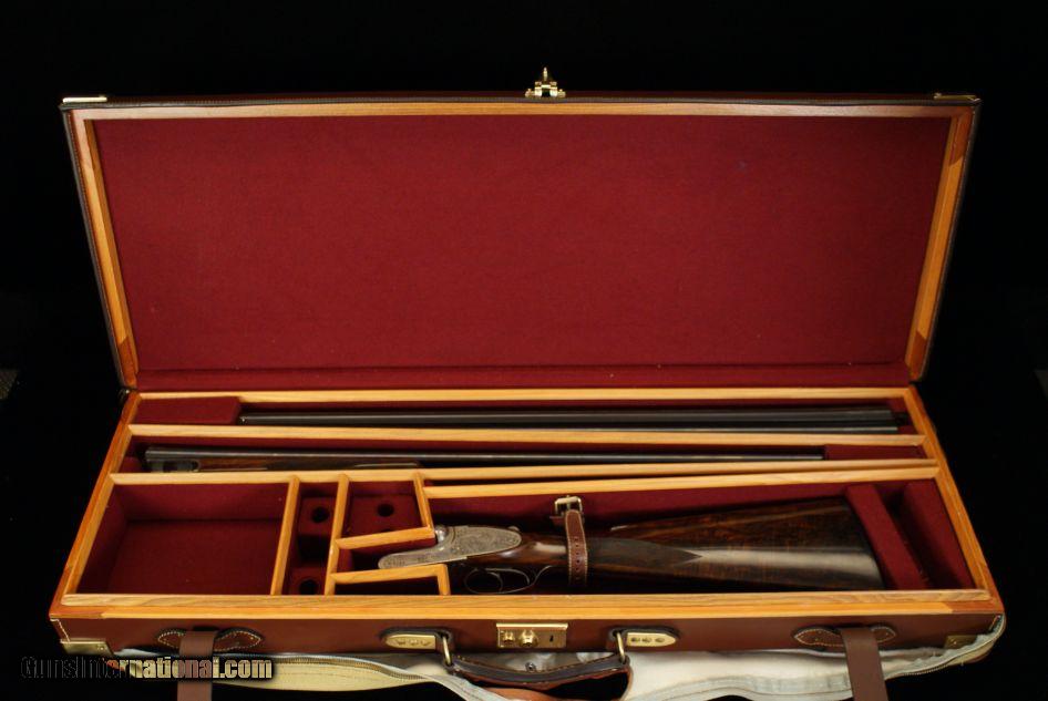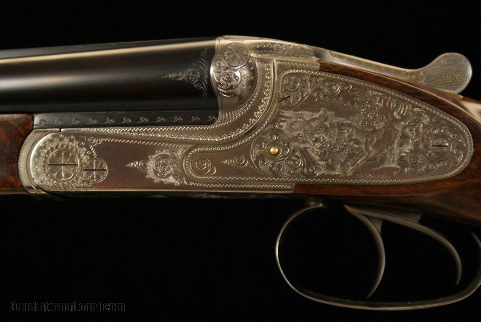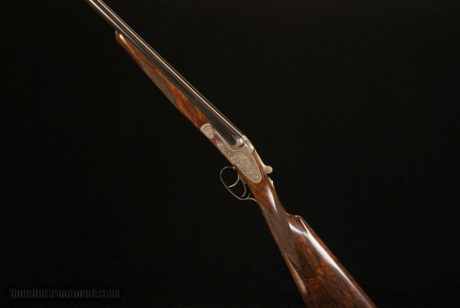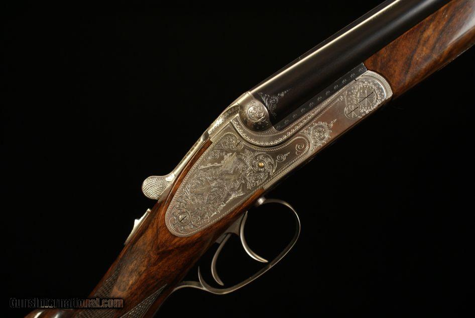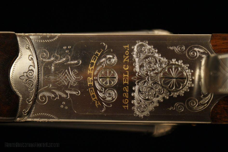 Description: Merkel 1622 EL Combo Boxlock Ejector, 16 and 20 bores, 2 3/4" and 3" chambers respectively, double triggers, straight grip, splinter forend, 28" barrels both sets, 16 bore choked .005 IC and .015 Mod., 20 bore choked .005 IC and .015 Mod., 16 bore weighs 6 lbs. 2 oz. and 20 bore weighs 6 lbs. 3 oz., 14 1/4" LOP over a butt plate, 1 1/2" DAC, 2 1/2" DAH, 1/8" cast off, the 1622 is a limited edition version of the 1620 and features a full sideplate, made in only 2006 and 2007 and this gun is "No. 1" as stated in gold on bottom of action, the EL features upgraded Luxus level wood and engraving, game scene engraved with pheasants on the right side and dog and grouse on the right side, engraving signed "Richter". The gun is in excellent condition but with some minor handling marks in wood. Comes with original box and a Galazan oak and leather case. SOLD |