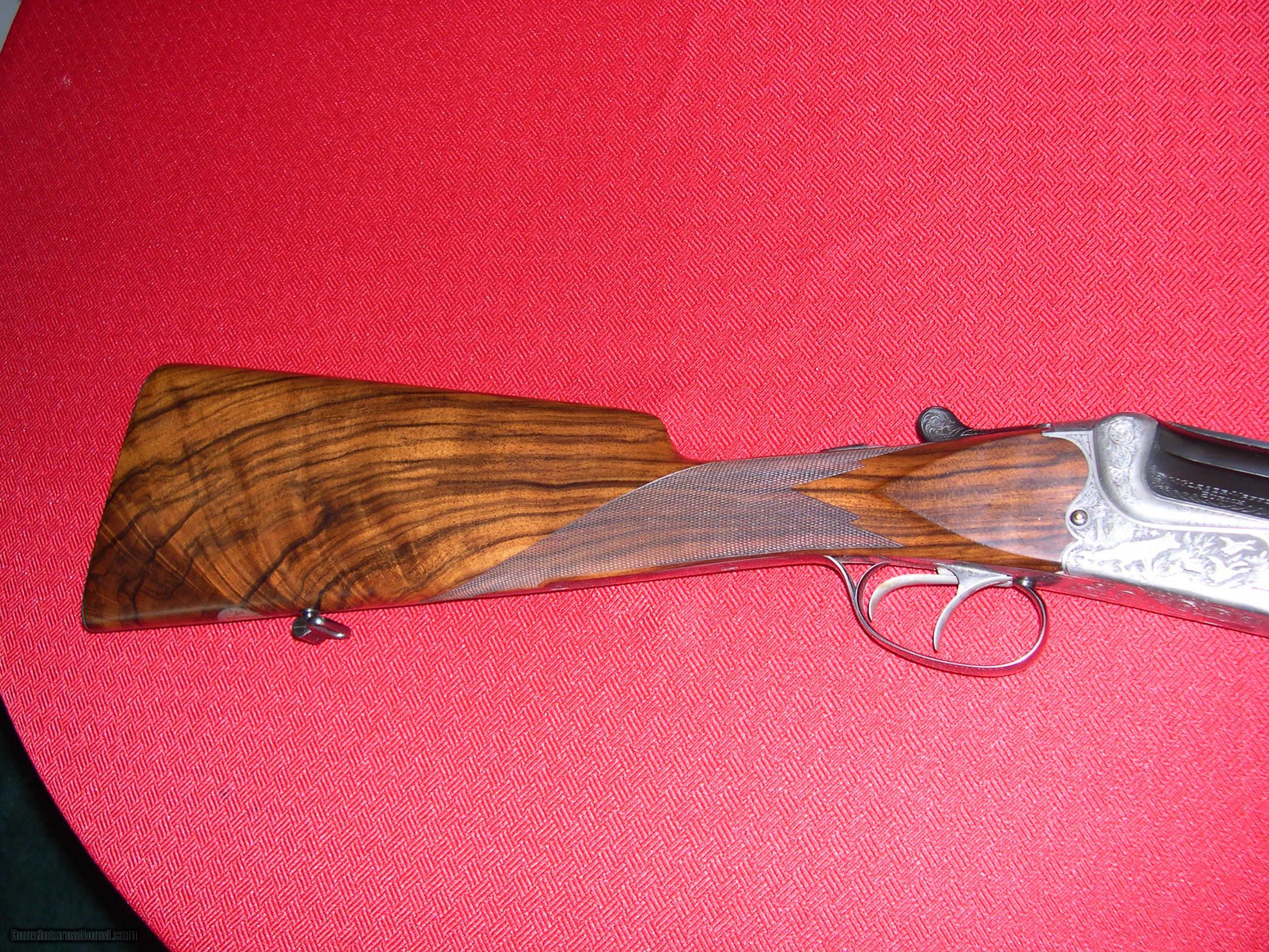 Description: Really nice Merkel 20 gauge with beautiful game scene engraving weighs 6# 6oz 26 3/4 " barrels upgraded wood with English straight grip with 14 1/4" LOP, mfgd in 1958 and handles like a gem. Choked .022 Full & .008 Mod chambered 2 3/4". This is a high grade Merkle with double Kersten locks and a real beauty a real buy for this 20 gauge. Will Trade Priced at $5750.00 OBO 3 day inspection S & I is $85.00. Contact Bud 509-465-8406 for more information, must ship FFL. SOLD |