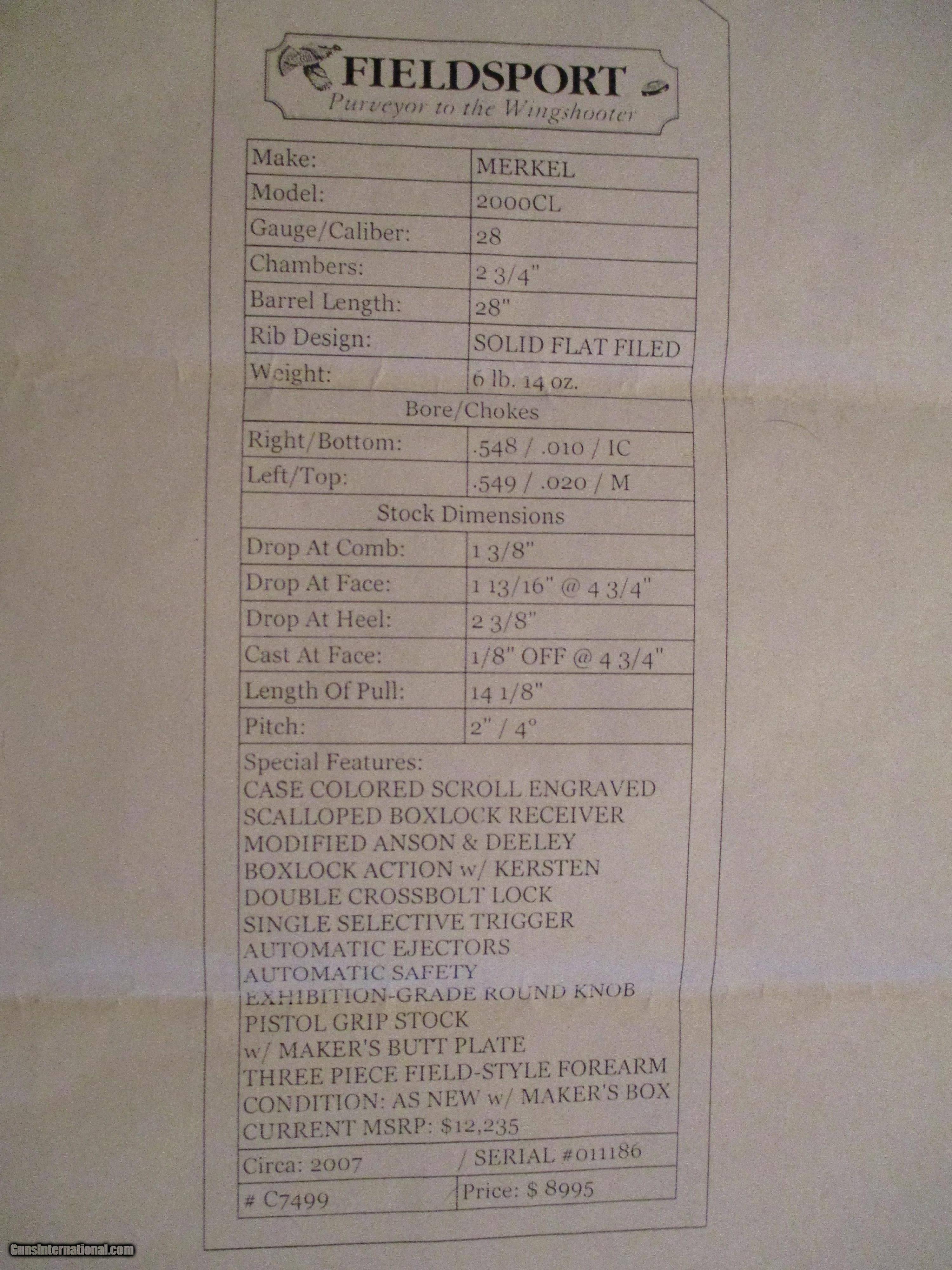 Description: MERKEL 28GA O/U MODEL 2000CL. THIS IS A GORGEOUS GUN!!!. THIS GUN HAS ONLY 30 ROUNDS THROUGH HER. SPECIAL FEATURES: CASE COLORED SCROLL ENGRAVED SCALLOPED BOXLOCK RECIEVER. MODIFIED ANSON & DEELEY BOXLOCK ACTION W/ KERSTEN DOUBLE CROSSBOLT LOCK. SINGLE SELECTIVE TRIGGER AUTOMATIC EJECTORS AUTO SAFETY EXHIIBITION GRADE ROUND KNOB PISTOL GRIP STOCK W/MAKERS BUTT PLATE THREE PIECE FIELD STYLE FOREARM SOLD Shotgun Gauge: 28 Gauge Manufacturer: MERKEL Model: 2000CL Serial Number: 011186 Chambers: 2 3/4 Ejectors: YES Condition: EXCELLENT Metal Condition: EXCELLENT Wood Condition: EXCELLENT Bore Condition: EXCELLENT Barrels: EXCELLENT Barrel Type: SOLID FLAT FILED RIB Triggers: 1 SELECTIVE Stock Comb: 1 3/8 Stock Heel: 2 3/8 Stock Cast: 1/8 CAST OFF LOP: 14 1/8 IN Rib: SOLID FLAT FILED RIB Finish: MATTE Weight: 6LB 14OZ Manufacture Date: 2007 Chokes: IC/MOD Case: MERKEL BOX |
