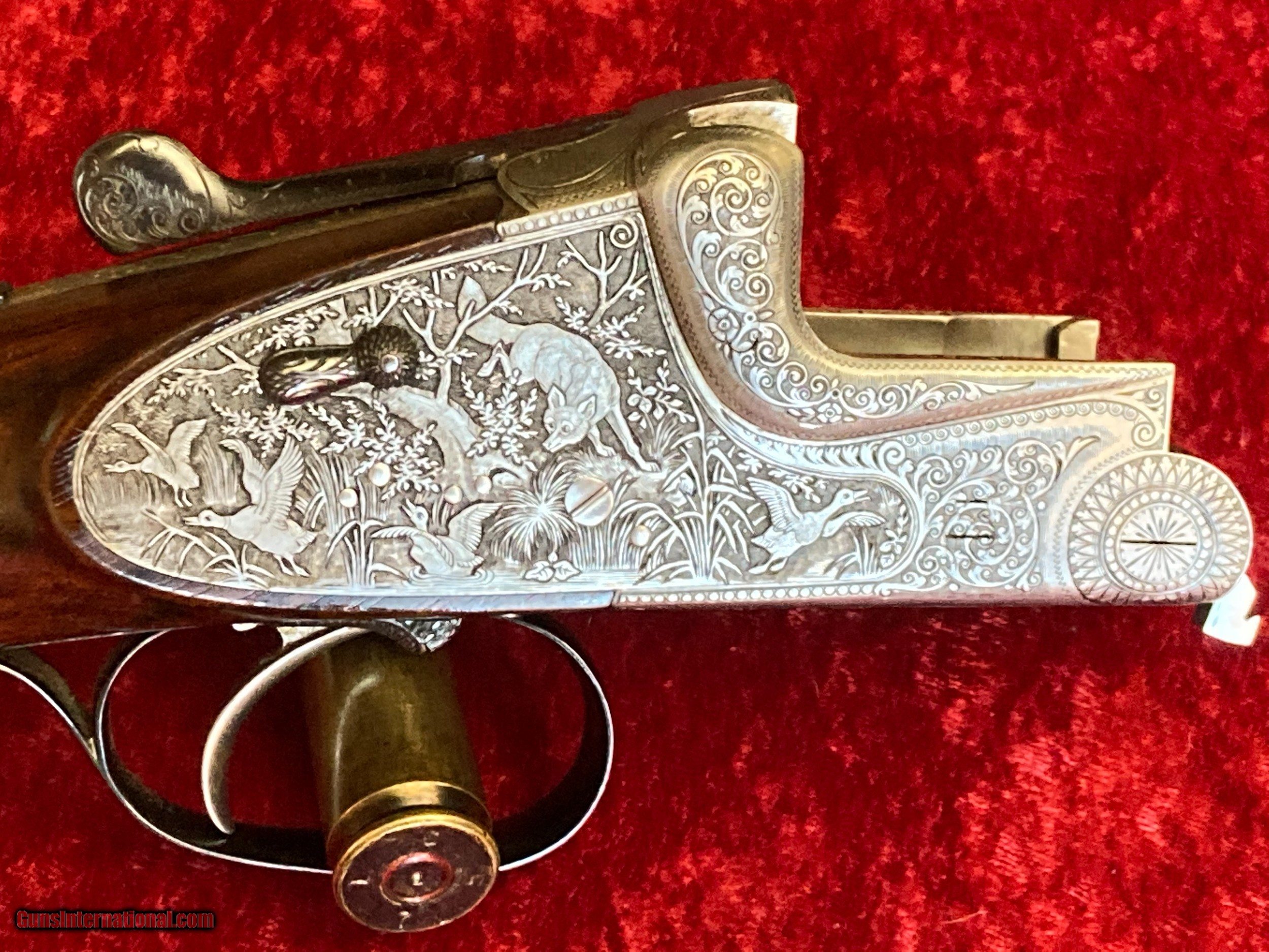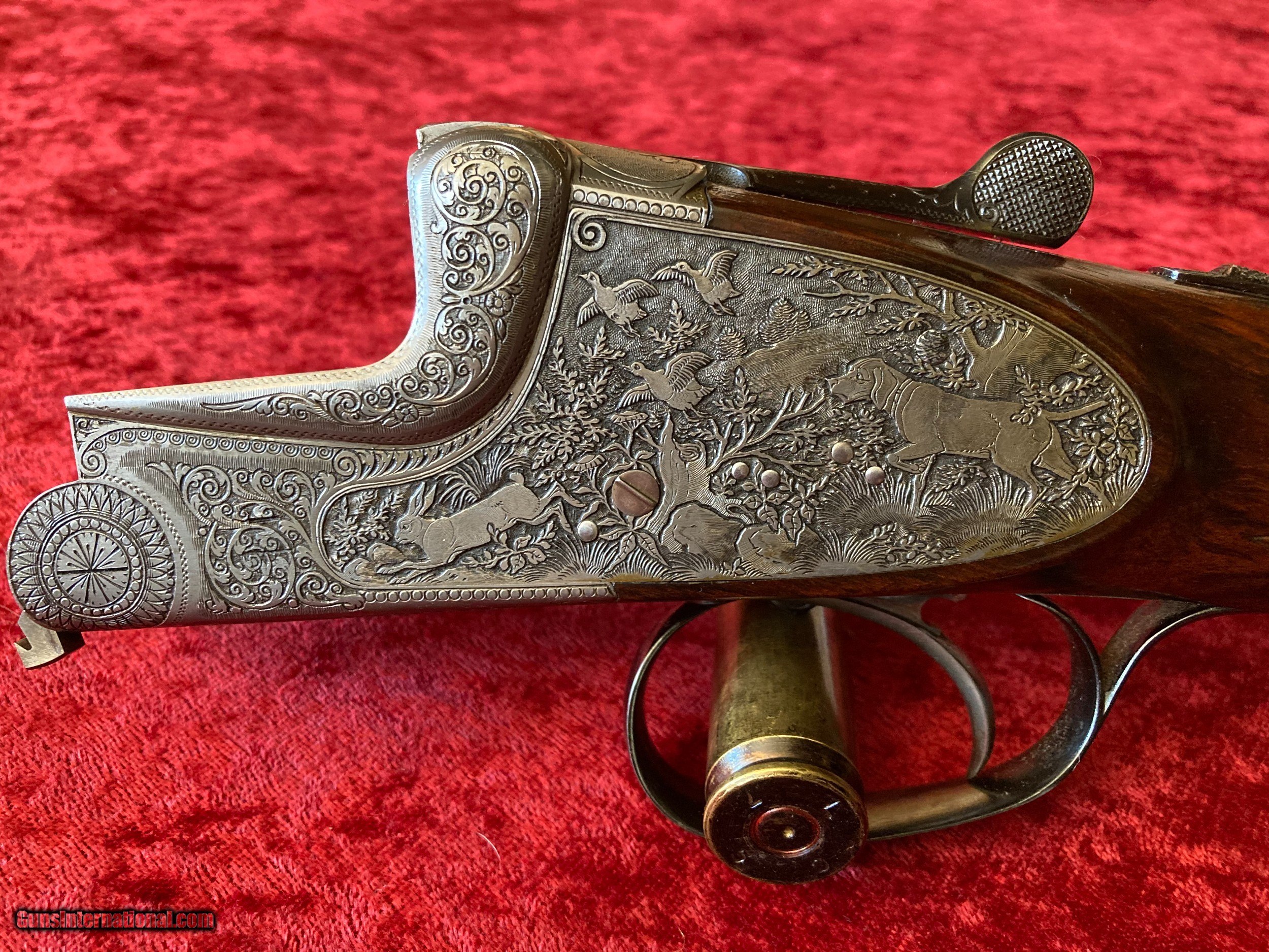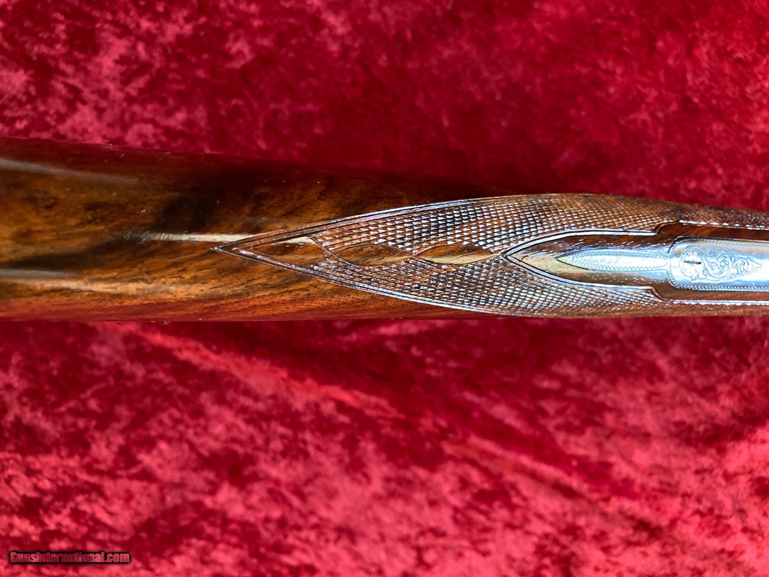 Description: You guys that have always wanted a true sidelock, here is the best opportunity you have seen in 12 years~! You will NOT be disappointed. Merkel 203 Game scene Hand detachable sidelock. Used 90%+ condition. 20ga. 26" and 20ga. 28" two, ventilated Bohler steel barreled set. Mfg. May 1968 Serial no.69218 Choked approx. .5800 to .6150 at muzzle ends. Brass sight beads incl. mid-bead. 2 3/4" chambers. H&H auto ejectors. Single selective trigger. Manual safety. 14 5/8" LOP to Pachmayr Old English Red recoil pad. Straight English grip Turkish AAA stocking with long tang metal and long tang checkering. Old style skeet ovate forearm that fits both barrels. Third fastner through bottom of the receiver similar to the 303. Nice crisp semi-deep engraving of Short haired pointer on flushing game birds and running Hare on left of receiver. Right side has Fox stalking/flushing 4 ducks off river. Has the Suhl gunsmith on bottom of receiver that is now discontinued. Has the usual handling and safe queen handling marks and depressions. Worst is approx. 1/4" on top of buttstock comb. Great gun at a great price. SOLD |