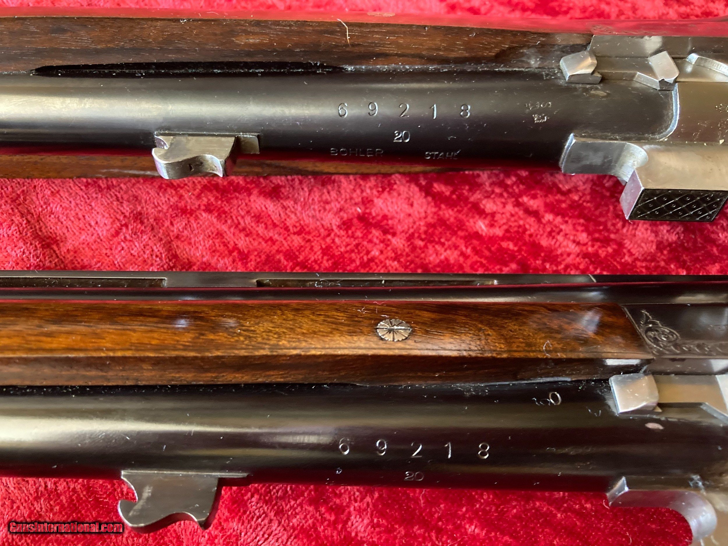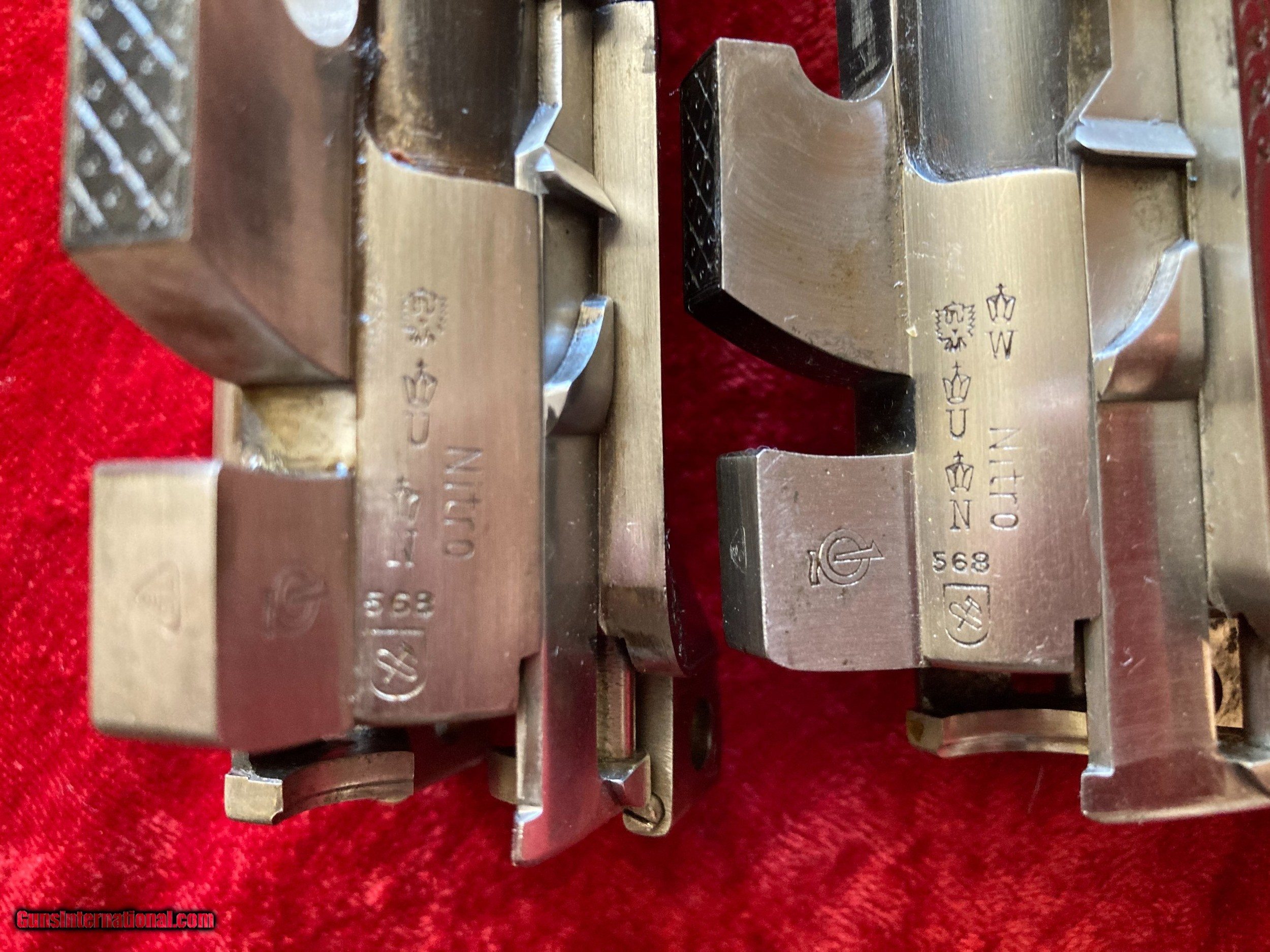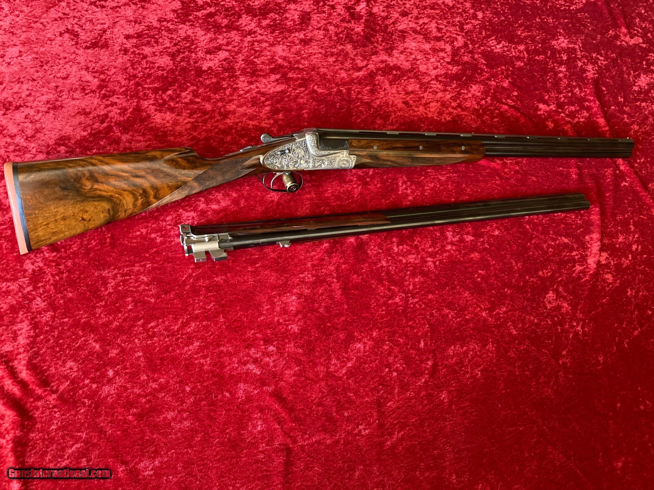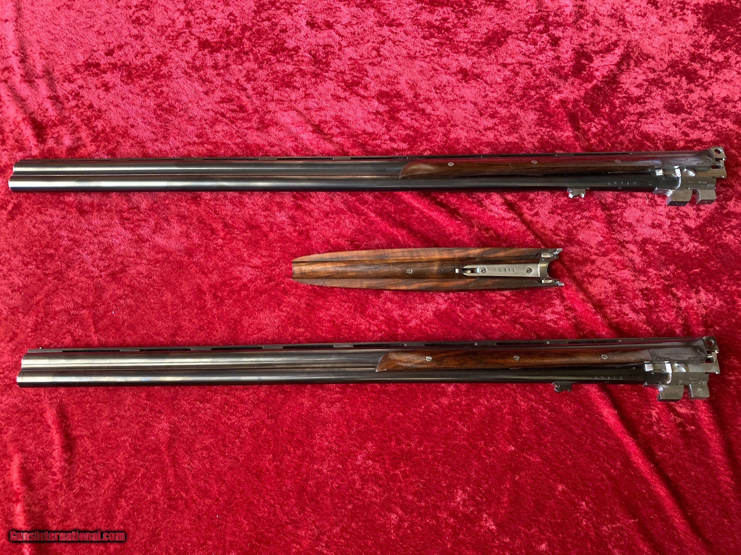 Description: You guys that have always wanted a true sidelock, here is the best opportunity you have seen in 12 years~! You will NOT be disappointed. Merkel 203 Game scene Hand detachable sidelock. Used 90%+ condition. 20ga. 26" and 20ga. 28" two, ventilated Bohler steel barreled set. Mfg. May 1968 Serial no.69218 Choked approx. .5800 to .6150 at muzzle ends. Brass sight beads incl. mid-bead. 2 3/4" chambers. H&H auto ejectors. Single selective trigger. Manual safety. 14 5/8" LOP to Pachmayr Old English Red recoil pad. Straight English grip Turkish AAA stocking with long tang metal and long tang checkering. Old style skeet ovate forearm that fits both barrels. Third fastner through bottom of the receiver similar to the 303. Nice crisp semi-deep engraving of Short haired pointer on flushing game birds and running Hare on left of receiver. Right side has Fox stalking/flushing 4 ducks off river. Has the Suhl gunsmith on bottom of receiver that is now discontinued. Has the usual handling and safe queen handling marks and depressions. Worst is approx. 1/4" on top of buttstock comb. Great gun at a great price. SOLD |