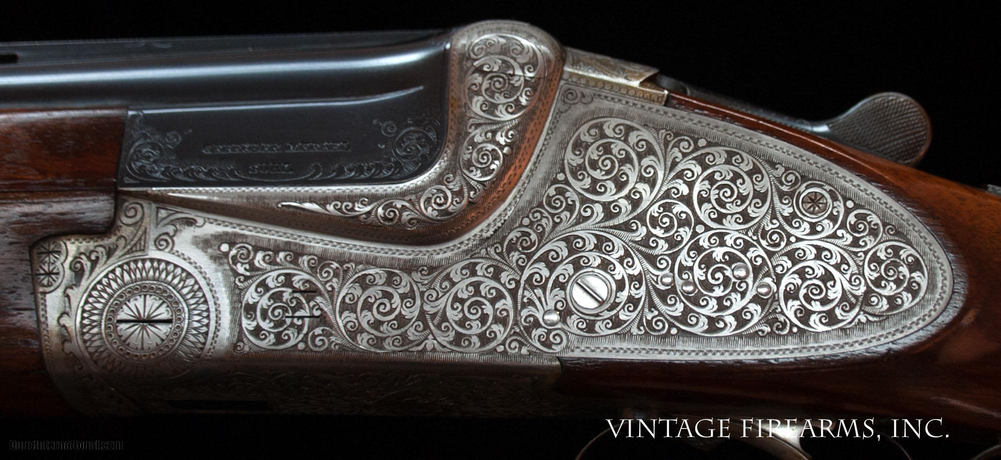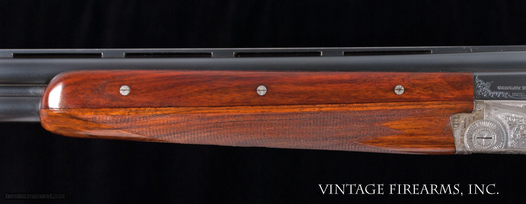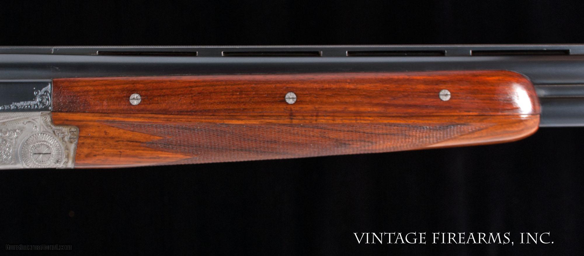Description: MERKEL 203 SIDELOCK O/U 12 GAUGE HAND-DETACHABLE LOCKS, BOHLER STEEL 28” BARRELS General Specs: Merkel, Year 1966, 12 Gauge, 6lbs 13oz, O&U Serial Number: 65148 Gerbruder Merkel of Suhl Germany is an incredible gun maker. They make all manner of fine guns that run the gamut from entry level side by side guns to more elaborate, fully engraved sidelock ejector over under guns like the one being reviewed here. Built in 1966, this gun remains in near new condition and is in excellent mechanical condition. The ejectors are strong and well timed, the single selective trigger functions flawlessly, and the 28” Bohler Steel barrels are without flaw and equipped with Briley 6 thin wall screw-in chokes that range from .005 constriction to .030 constriction in 5 thousandths increments, or SK, IC, LM, M, IM, F for extreme versatility. Weighing a very light 6lbs. 13oz. and balanced perfectly 1/8” in front of the hinge pin, this gun is lively and would be an amazing field gun for your favorite upland birds, or as a fast handling gun for the clay target sports shooting from a down gun. The butt stock is nicely figured with good shooting dimensions and the 3 piece forearm fits nicely in hand. We have priced this gun to sell, and it is ready to give the new owner another 5 decades of flawless use. Thanks for looking at our inventory! Barrels Barrel Length: 28" Bohler Steel Chokes: Briley thin wll .005; .010; .015; .020; .025; .030 Bores: perfect mirror Bore Diameter: .730 both Wall Thickness: .026/.030 % Blue: 99% Chambers: 3" Ribs: vent rib, tight Sights: silver mid and front Action Action: tight Ejectors or Extractors: ejectors, timed Case Color: french grey Screws: perfect Engraving: 100% coverage bank note scroll Trigger Type: single selective trigger, crisp Trigger Guard Color: 99% factory blue Stock Type: capped pistol grip/3 piece forend/ european walnut LOP: 14 3/16" LOP To End Of Wood: 13 7/16" DAH: 2 1/2" DAC: 1 9/16" Cast: 1/4" off Checkering Condition: superb 28 lines per inch Butt Treatment: leather covered pad There are more photos upon request. We offer a 30 day mechanical warranty on this fine shotgun. Call us for full details. PLEASE SEE MY OTHER FINE VINTAGE FIREARMS. Just open one of my ads and click on the line that says “see all items from this seller” and a very nice list of fine sporting and collectible arms will appear. I have many more fine sxs shotguns not yet listed. Thanks for looking! We employ a full time gunsmith on premises and can perform alterations to suit your needs within a few weeks of purchase. Payment Methods: Money Order, Certified Check, Personal Check, Wire Transfer Inspection Period / Return Policy: Three Days from the date the item was received. Sales Tax: 6% Michigan Only Shipping & Insurance: Ground $65.00 We ship internationally! Item Condition: Used Requires FFL?: Yes If you have any questions about this item or payment, please email or call us directly, at #616-292-6240. Thanks! Jay Shachter, Vintage Firearms, Inc We employ a full time gunsmith on premises and can perform alterations to suit your needs within a few weeks of purchase. Common requests are: -stock bending to suit your particular requirements -addition of any specified butt pad to increase length of pull -alteration of chokes to suit your shooting preferences -lengthening of chambers and forcing cones -darkening stock color with penetrating stains -restoring any part of the gun including rust blue, charcoal blue, bone and charcoal case color, wood restoration and checkering recuts. If you like one our guns but it needs "tweaked", let us know and we can quote you a time and price. Some enthusiasts like the guns "as found" and others want them "just so". We often list guns as found and let the particular buyer choose how they want their gun to fit or look. SOLD Curio/Relic: Yes |