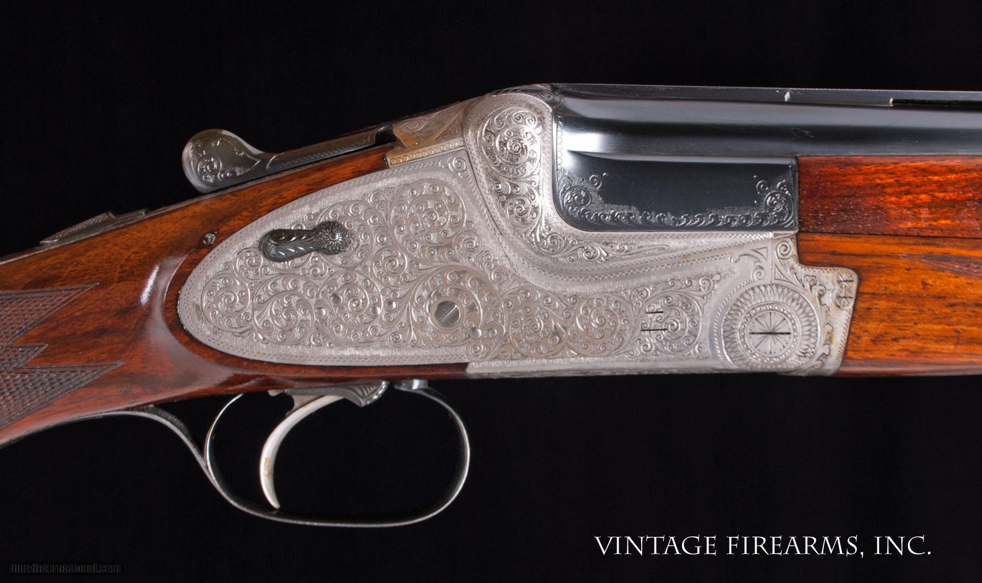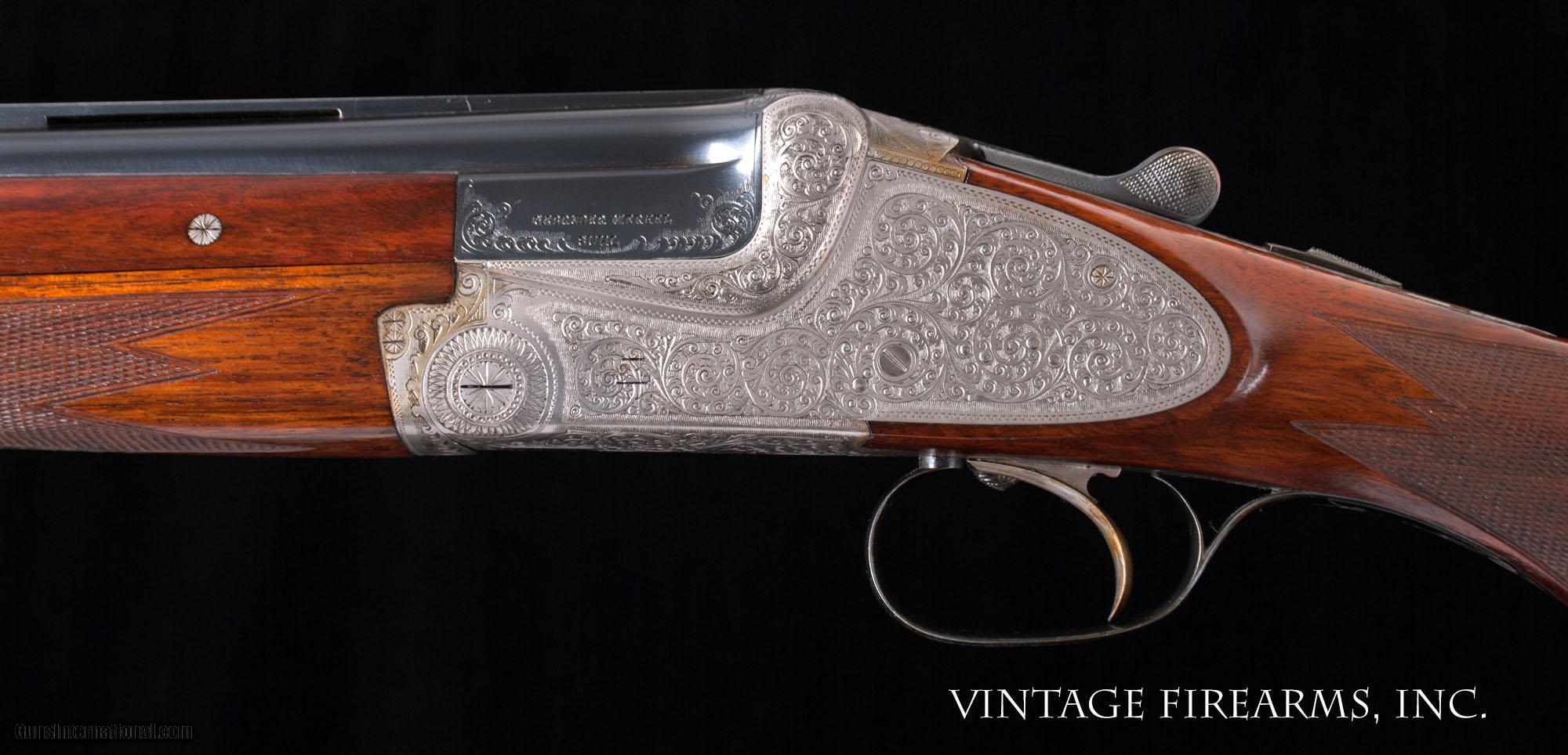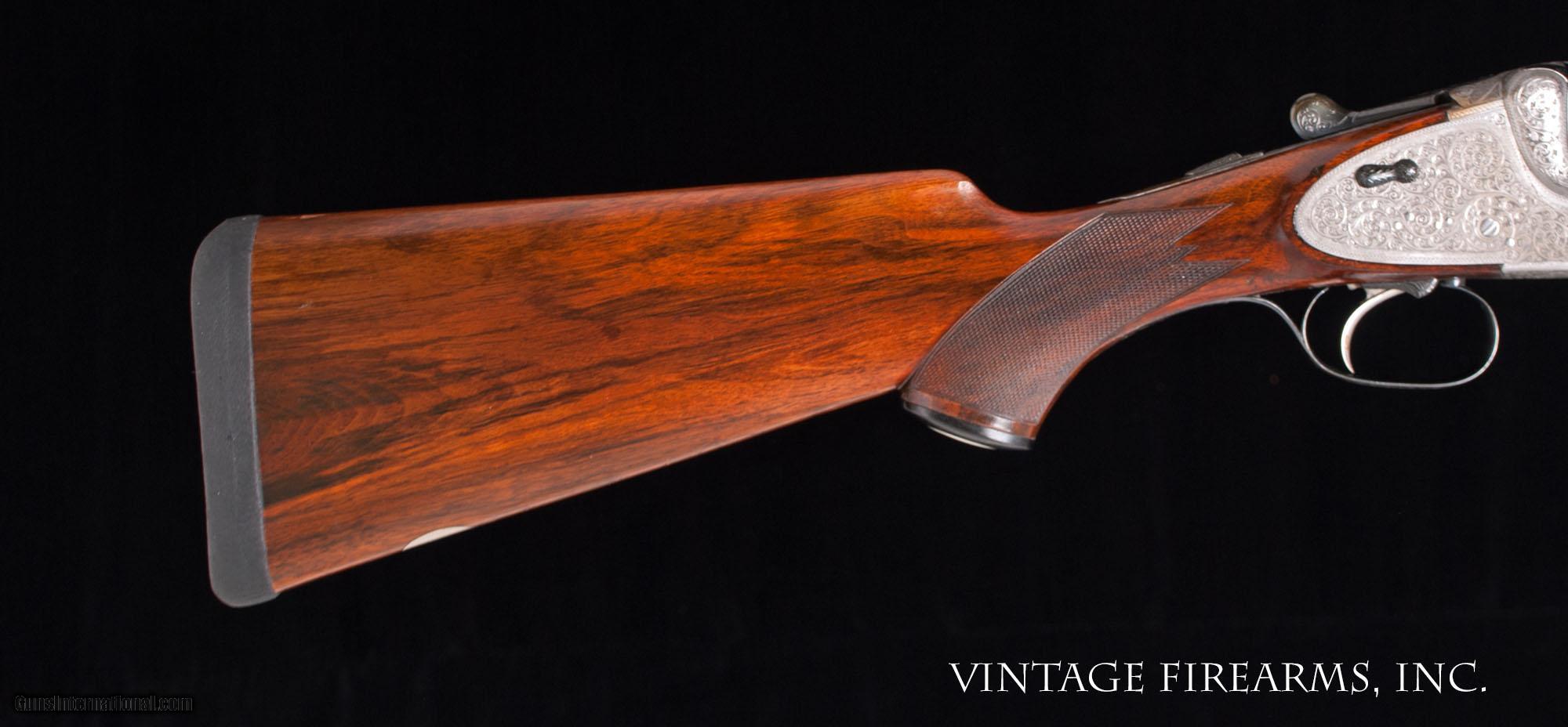Description: MERKEL 203 SIDELOCK O/U 12 GAUGE HAND-DETACHABLE LOCKS, BOHLER STEEL 28” BARRELS General Specs: Merkel, Year 1966, 12 Gauge, 6lbs 13oz, O&U Serial Number: 65148 Gerbruder Merkel of Suhl Germany is an incredible gun maker. They make all manner of fine guns that run the gamut from entry level side by side guns to more elaborate, fully engraved sidelock ejector over under guns like the one being reviewed here. Built in 1966, this gun remains in near new condition and is in excellent mechanical condition. The ejectors are strong and well timed, the single selective trigger functions flawlessly, and the 28” Bohler Steel barrels are without flaw and equipped with Briley 6 thin wall screw-in chokes that range from .005 constriction to .030 constriction in 5 thousandths increments, or SK, IC, LM, M, IM, F for extreme versatility. Weighing a very light 6lbs. 13oz. and balanced perfectly 1/8” in front of the hinge pin, this gun is lively and would be an amazing field gun for your favorite upland birds, or as a fast handling gun for the clay target sports shooting from a down gun. The butt stock is nicely figured with good shooting dimensions and the 3 piece forearm fits nicely in hand. We have priced this gun to sell, and it is ready to give the new owner another 5 decades of flawless use. Thanks for looking at our inventory! Barrels Barrel Length: 28" Bohler Steel Chokes: Briley thin wll .005; .010; .015; .020; .025; .030 Bores: perfect mirror Bore Diameter: .730 both Wall Thickness: .026/.030 % Blue: 99% Chambers: 3" Ribs: vent rib, tight Sights: silver mid and front Action Action: tight Ejectors or Extractors: ejectors, timed Case Color: french grey Screws: perfect Engraving: 100% coverage bank note scroll Trigger Type: single selective trigger, crisp Trigger Guard Color: 99% factory blue Stock Type: capped pistol grip/3 piece forend/ european walnut LOP: 14 3/16" LOP To End Of Wood: 13 7/16" DAH: 2 1/2" DAC: 1 9/16" Cast: 1/4" off Checkering Condition: superb 28 lines per inch Butt Treatment: leather covered pad There are more photos upon request. We offer a 30 day mechanical warranty on this fine shotgun. Call us for full details. PLEASE SEE MY OTHER FINE VINTAGE FIREARMS. Just open one of my ads and click on the line that says “see all items from this seller” and a very nice list of fine sporting and collectible arms will appear. I have many more fine sxs shotguns not yet listed. Thanks for looking! We employ a full time gunsmith on premises and can perform alterations to suit your needs within a few weeks of purchase. Payment Methods: Money Order, Certified Check, Personal Check, Wire Transfer Inspection Period / Return Policy: Three Days from the date the item was received. Sales Tax: 6% Michigan Only Shipping & Insurance: Ground $65.00 We ship internationally! Item Condition: Used Requires FFL?: Yes If you have any questions about this item or payment, please email or call us directly, at #616-292-6240. Thanks! Jay Shachter, Vintage Firearms, Inc We employ a full time gunsmith on premises and can perform alterations to suit your needs within a few weeks of purchase. Common requests are: -stock bending to suit your particular requirements -addition of any specified butt pad to increase length of pull -alteration of chokes to suit your shooting preferences -lengthening of chambers and forcing cones -darkening stock color with penetrating stains -restoring any part of the gun including rust blue, charcoal blue, bone and charcoal case color, wood restoration and checkering recuts. If you like one our guns but it needs "tweaked", let us know and we can quote you a time and price. Some enthusiasts like the guns "as found" and others want them "just so". We often list guns as found and let the particular buyer choose how they want their gun to fit or look. SOLD Curio/Relic: Yes |