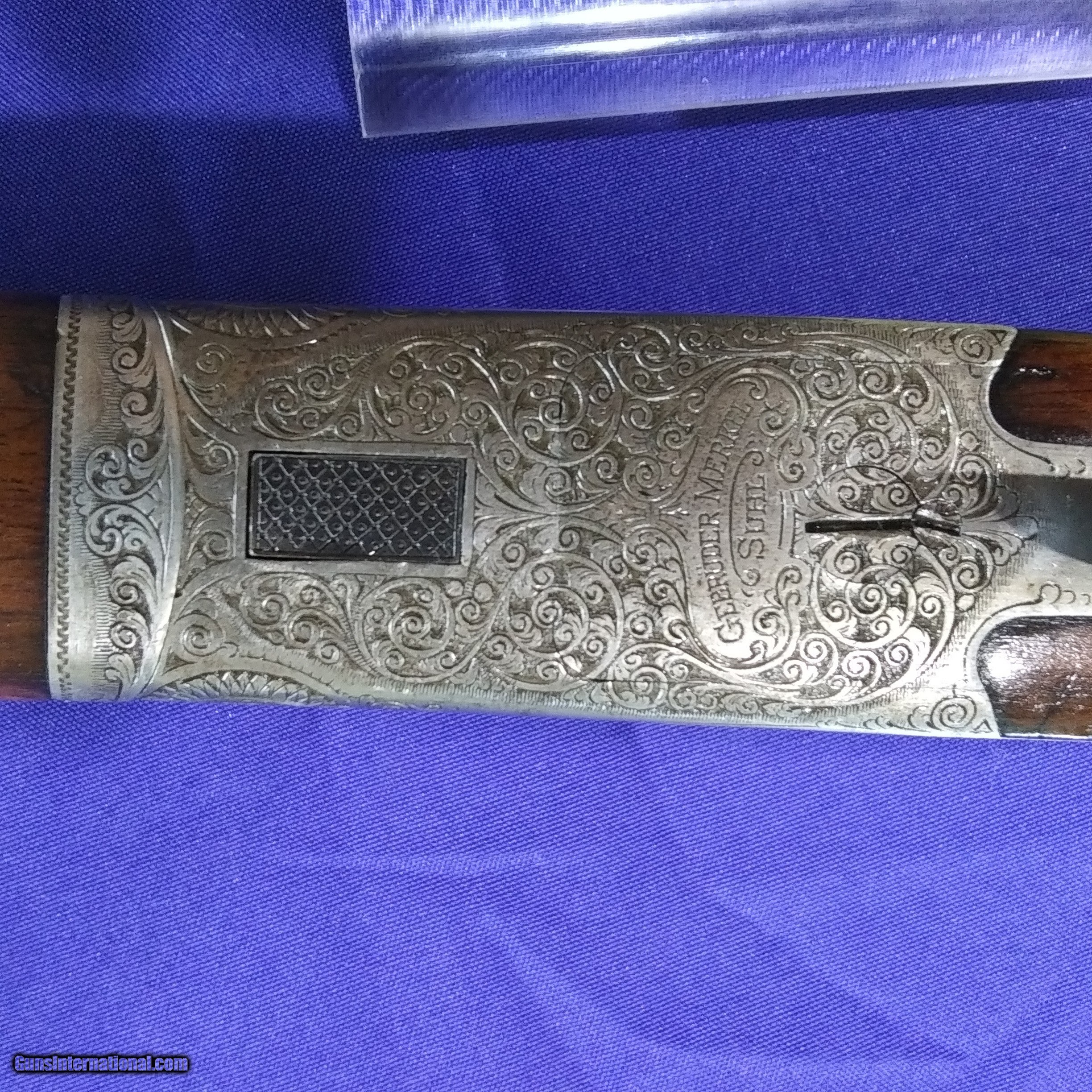 Description: Pending Sale. Will soon be on it's way to Alex in New Hampshire. Thanks Guns International. Maker: Merkel Suhl Model: Model 203e 4 Barrel Combination Gun At the suggestion of a couple GI members, I have added a Zeiss Diavari ZM 3-12X56T Scope with swing mounts to the double rifle barrel. This adds more than $1600 value to this fine set. I have a full picture file to send on e-mail request. Description: This Merkel Sidelock 203e from 1953 is a very rare and fine example of German craftsmanship. LOP is 14 1/8 inches. This Model 203e Sidelock has very nice exclusive fine scroll engraving on the side locks. Wood and Blueing are in great condition. Beautiful Dark high grade oiled stock in near perfect condition. This is a dream combination made for the owner that wants it all in one gun. O/U Double Shotgun, O/U Shotgun/Rifle in .22 Hornet for small game and preditors, O/U Shotgun/Rifle in 7/65R for large game and preditors as well as a Double Rifle in 7X65-R for large game. Truely a one of a kind custom combination. There are NO importer’s markings anywhere on the gun. Extras: Fine Scroll Engraving. High Grade Wood. Exclusive Custom Leather Case. Each Barrel marked. Key. Very fine old leather case. This case would cost $3000 plus today. The following is a detailed description of the barrel combinations. Original Gun Caliber: O/U 16 ga. 2 3/4 Chamber Serial Nr.: 38176 Proof Date: 1953 LOP: 14 1/8 in. Weight: 6 lbs. 12 oz. Barrel Length: 28 in. Overal Length: 44 1/4 in. Choke: Mod and Imp Barrel Combination Extra Set # 1 Caliber: O/U 16 ga. / .22 Hornet Serial Nr.: 38176 Proof Date: 1975 LOP: 14 1/8 in. Weight: 8 lbs. 12 oz. with Scope Barrel Length: 24 1/2in. Overal Length: 40 3/4 in. Choke: Extra Full Scope: Nickel Supra (Germany) 4X32 with leather cover Mounts: Claw Mounts Barrel Combination Extra Set # 2 Caliber: O/U 16 ga. / 7X65R (Known in Europe as the European .06) Serial Nr.: 38176 Proof Date: 1954 LOP: 14 1/8 in. Weight: 8 lbs. 11 oz. with Scope Barrel Length: 24 in. Overal Length: 40 1/4 in. Choke: Extra Full Scope: Henzoldt (now Zeiss) 1.5-6X32 Mounts: Claw Mounts Barrel Combination Extra Set # 3 Caliber: O/U 7X65R/ 7X65R Serial Nr.: 38176 Proof Date: 1976 LOP: 14 1/8 in. Weight: 7 lbs. 10 oz. without Scope Barrel Length: 24 in. Overal Length: 40 1/4 in. Scope: None. I can be of help in selecting the right scope for you. Mounts: Base Mounts for European Swing Mounts Extras: Top Barrel is adjustable for easy barrel adjustment. I am sure everyone can agree that this combination is almost impossible to have made today. The cost would be enormous. Today's value is in excess of $ 25.000. This is truly a great value for a investment or just a beautiful gun to hunt with. It will definitely make some collector and shooter very happy. Fixed insured shipping cost of $100.00 to the lower 48 States Item will ship Insured from me to your FFL when funds clear. Feel Free to e-mail me for a complete picture file. I can only add 15 pictures here. SOLD Curio/Relic: Yes Manufacturer: Merkel Model: 203E Serial Number: 38176 Barrel Length: 28 in. Condition: very good Metal Condition: very good Wood Condition: very good Bore Condition: very good LOP: 14 1/8 in. Manufacture Date: 1953 Chokes: Improved / Modified Engraving: Fine Scroll Case: Exclusive Leather Custom Case Item Location: Arkansas |