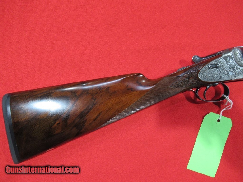 Description: Excellent condition overall with some light handling wear to the stock and blue wear on the long tang: 1955 Mfg, sidelock with nicely executed game scene engraving, straight grip stock, solid rib, The head of the stock is carved with a scroll patter before transitioning into standard checkering, single selective trigger, manual safety, cocking indicators, Bohler steel barrels with 2 3/4" chambers, threaded for Briley thinwall choke tubes. This gun measures 1 1/2" x 2 1/8" x 14 1/4" over a Kick-Eez recoil pad. Comes with a hard leather case and five choke tubes and a choke tube wrench. SOLD |