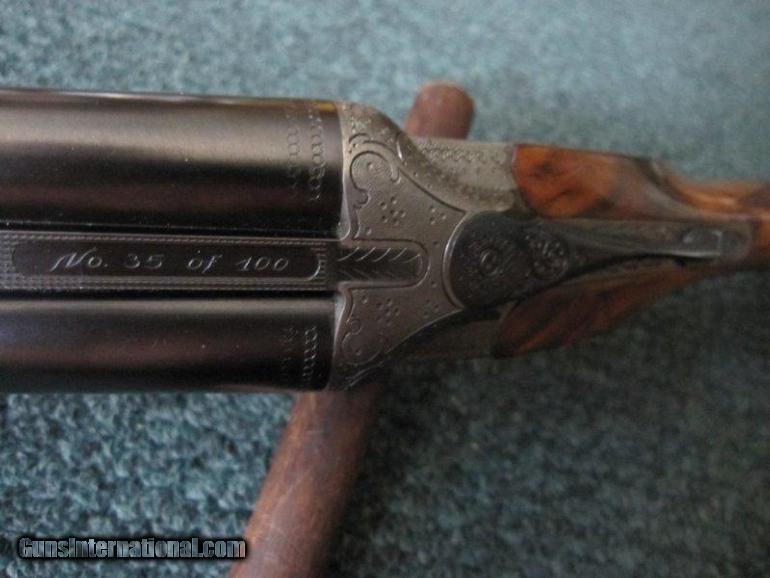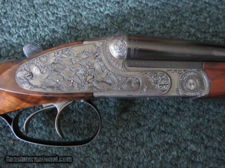 Description: Merkel 280 SL 28ga, number 35 of 100, hand picked out of 23 for the best engraving and wood selection, Master engraved Merkel, made in Germany, engraved by Bernd Ludwig, engraving depicts a English setter pointing a flush of woodcock with forest floor background and scroll accents on left side of sidelock and receiver, right side depicts a covey rise of Hungarian partridge with northern woods scene with pine trees on skyline accented by scroll in semi relief with French gray receiver and forend metal, 28" barrels, 5 5/8 lbs., 14 1/2 LOP, 44 3/8 overall length, 2 3/8 drop in heel, right hand cast off, original Merkel case and papers, Improved cyl and mod, straight English grip and splinter forearm with beautifully figured wood, excellent condition with some light handling marks in wood, metal 100%. Rust blue trigger guard and barrels, matted rib. For further information call John at 941-748-7318. SOLD |