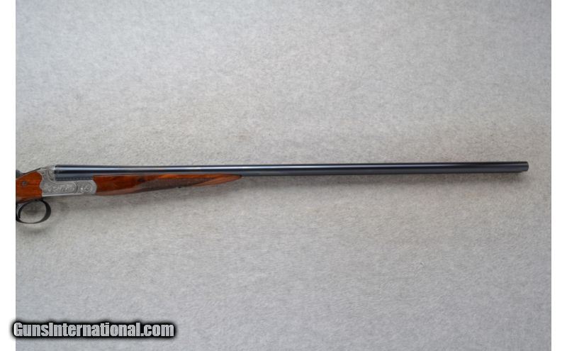 Description: This Merkel Model 280E is a 28 Ga. side by side shotgun. It has 28 inch barrels with a solid rib and 2 3/4 inch chambers. The chokes are fixed Cylinder and Modified. The stock is a checkered walnut pistol grip and a checkered walnut splinter forearm. It has an Anson & Deeley boxlock action with Greener crossbolt and double under barrel locking lugs. H&H ejectors. The silver receiver is very nicely engraved with birds in flight outdoor wildlife scenes and scroll. This fine shotgun is in very good condition. SOLD Caliber Info: 28 Ga. Chambers: 2 3/4 inch side x side with ejectors. Metal Condition: Very good. Very minor handling mark on the left barrel top and very minor blue wear on the solid rib. Wood Condition: Very good. Very minor surface finish marks and minor handling marks. Bore Condition: Shiny Barrels: 28 inch blued with a solid rib. Front bead sight. Triggers: Single Stock: Checkered walnut pistol grip with a black cap. Stock Dimensions: LOP 14 1/4 inches. DAC 1 1/4 inch. DAH 2 3/8 inch. Fore End: Checkered grip walnut splinter. Butt Pad: Merkel horizontal grooved black plate. Weight: 5 lbs. 8 oz. Sights: Brass front bead on the solid rib. Chokes: Fixed Cyl. & Mod. Item Location: Richfield, WI |