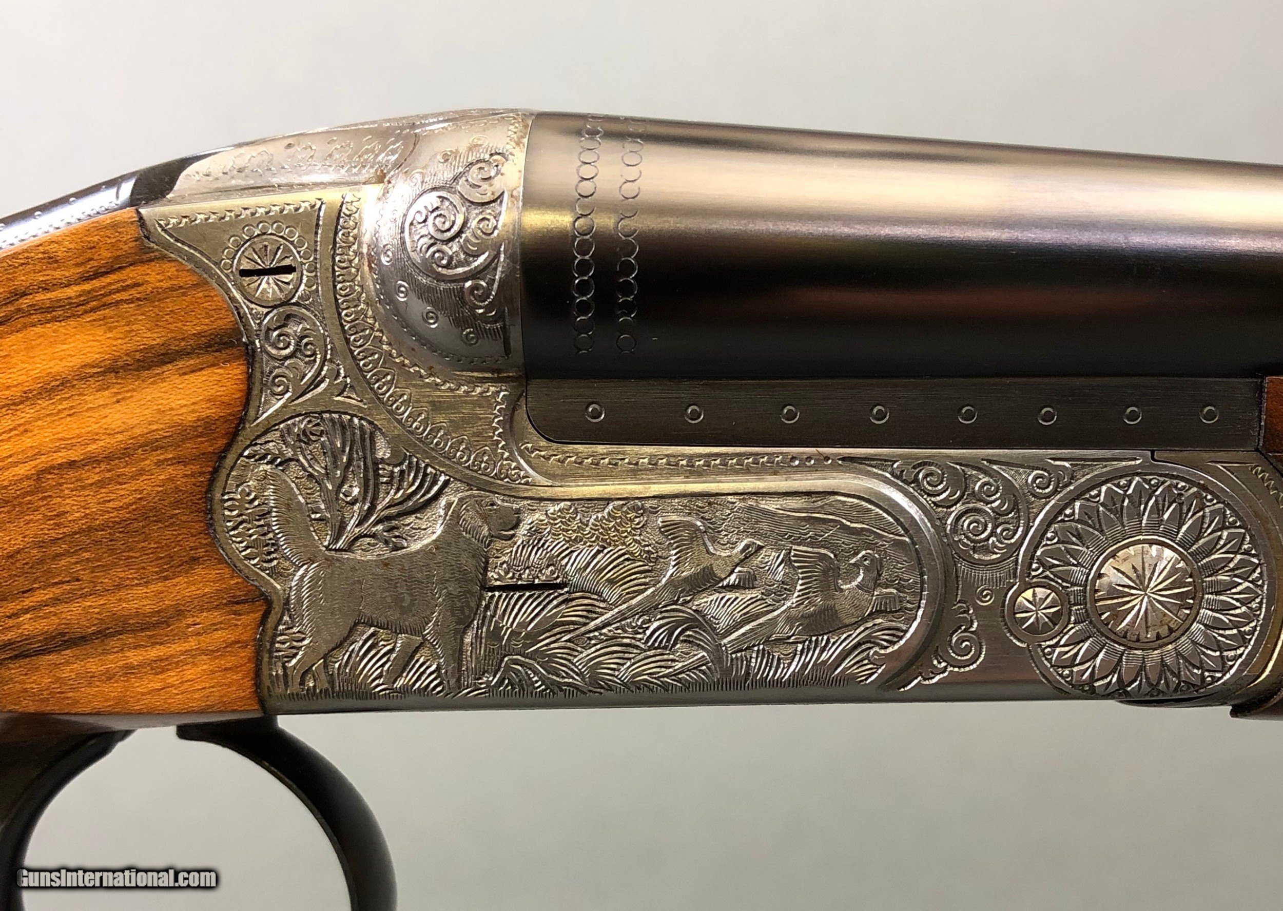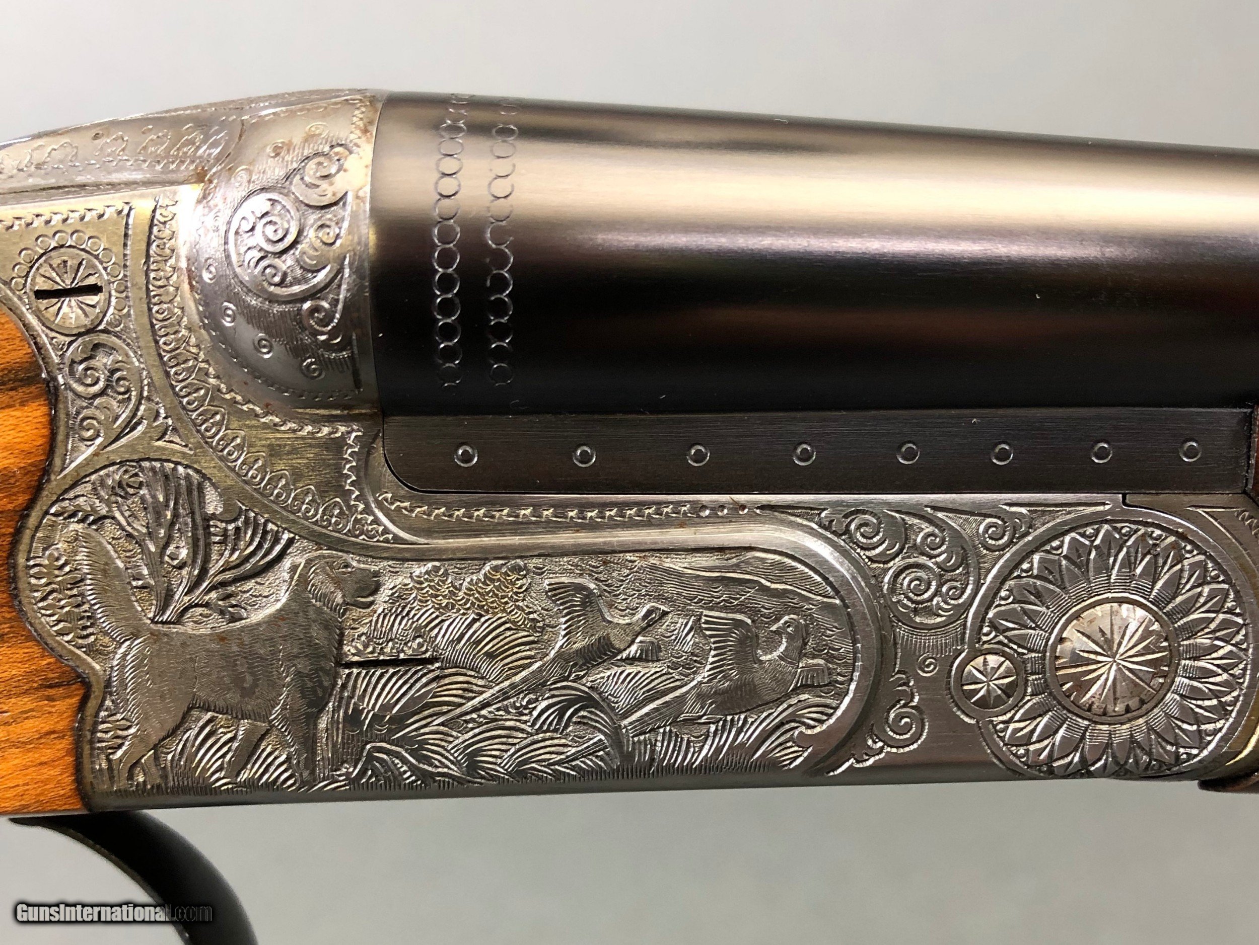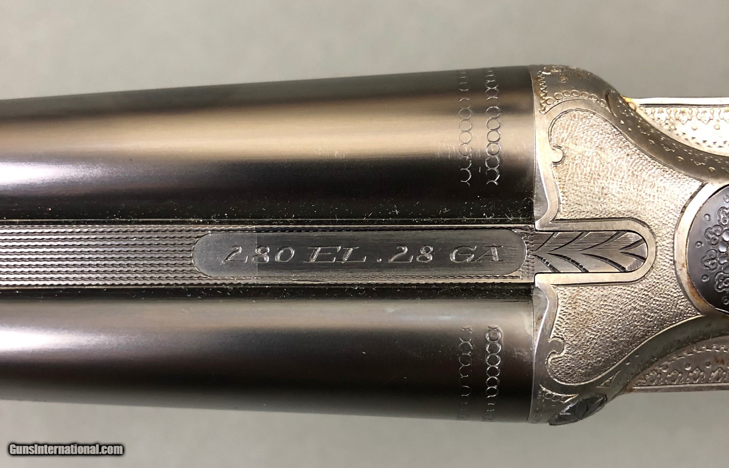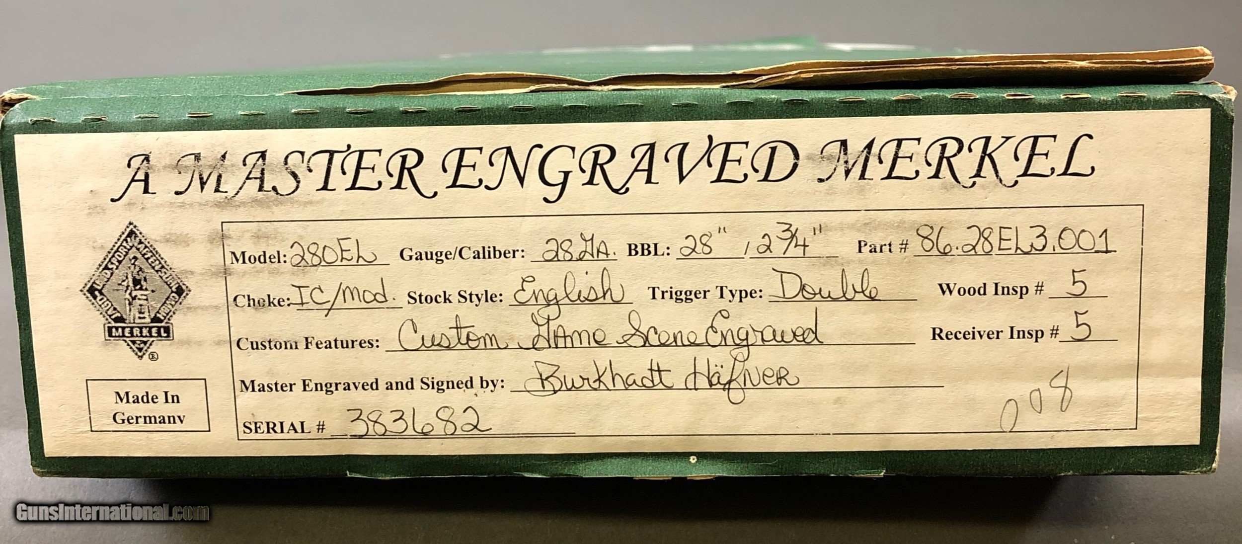 Description: Merkel 280EL with original box. This gun is near new original condition with 99% barrel blue and only minor handling marks in the wood. Tight as the day it was made! It is factory choked IC/MOD with a straight grip, 28' barrels, and double triggers. At 5lbs 5oz, it's the lightest 280 Ive owned. I believe the gun was orignally made for a left handed shooter because it has 5/8 CAST ON. Hand engraved and signed by the engraver, Burkhadt Hafner. It features an English Setter on each side with quail and pheasants. Trades always considered, up or down. SOLD Manufacturer: Merkel Model: 280EL Serial Number: 383682 Chambers: 2 3/4 Ejectors: Yes Condition: Excellent Original Metal Condition: Excellent Original Wood Condition: Excellent Original Bore Condition: Mint Barrels: 28 Action: Boxlock Triggers: Double Gauge Info: 28 Stock Dimensions: 14 1/4 x 1 3/8 x 2 1/2 Stock Cast: 5/8 cast on Finish: Original Weight: 5lbs 5oz Chokes: Factory IC/Mod Choke Left: .550 ( .018 ) Choke Right: .550 ( .008 ) Engraving: Hand Engraved by Burkhadt Hafner Extras: Original Box |