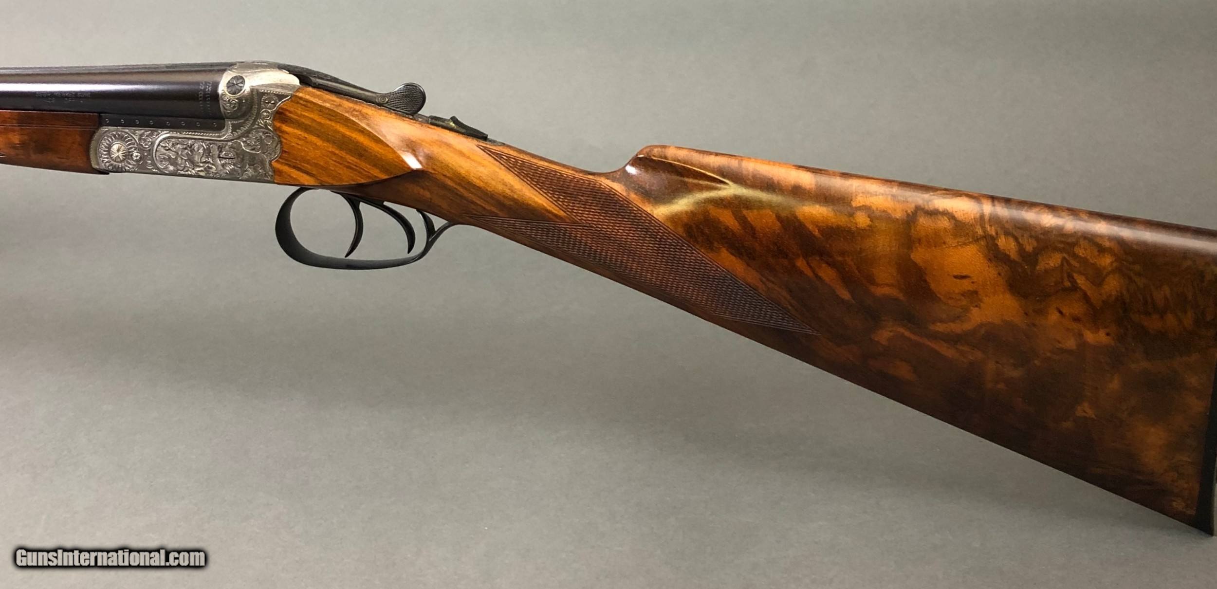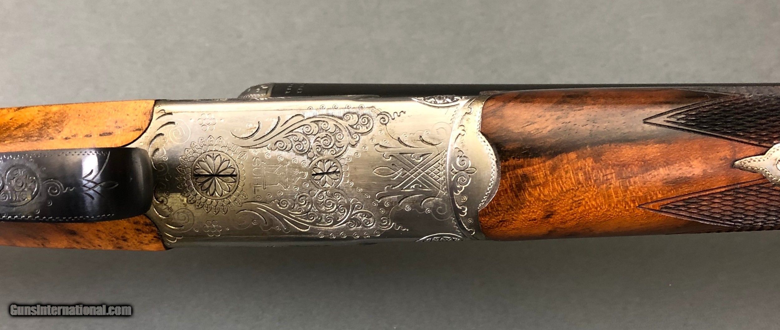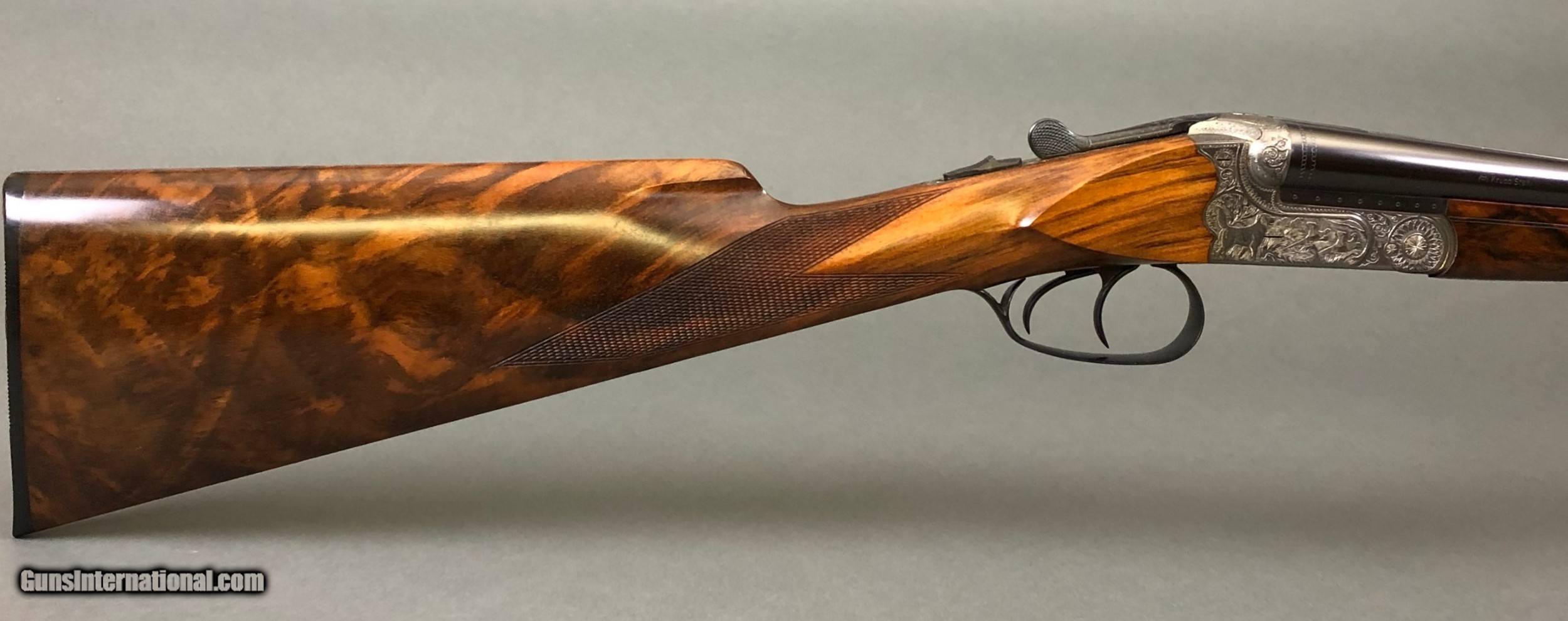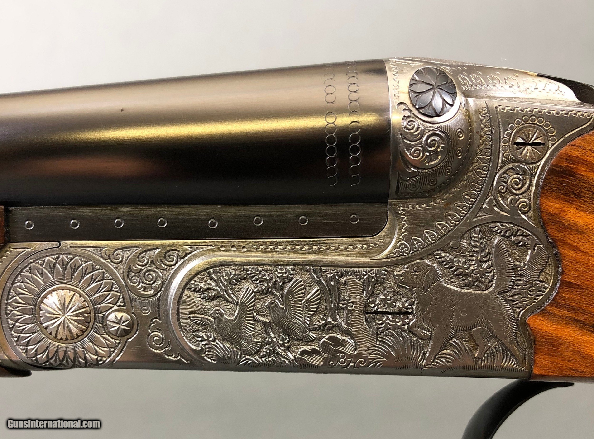 Description: Merkel 280EL with original box. This gun is near new original condition with 99% barrel blue and only minor handling marks in the wood. Tight as the day it was made! It is factory choked IC/MOD with a straight grip, 28' barrels, and double triggers. At 5lbs 5oz, it's the lightest 280 Ive owned. I believe the gun was orignally made for a left handed shooter because it has 5/8 CAST ON. Hand engraved and signed by the engraver, Burkhadt Hafner. It features an English Setter on each side with quail and pheasants. Trades always considered, up or down. SOLD Manufacturer: Merkel Model: 280EL Serial Number: 383682 Chambers: 2 3/4 Ejectors: Yes Condition: Excellent Original Metal Condition: Excellent Original Wood Condition: Excellent Original Bore Condition: Mint Barrels: 28 Action: Boxlock Triggers: Double Gauge Info: 28 Stock Dimensions: 14 1/4 x 1 3/8 x 2 1/2 Stock Cast: 5/8 cast on Finish: Original Weight: 5lbs 5oz Chokes: Factory IC/Mod Choke Left: .550 ( .018 ) Choke Right: .550 ( .008 ) Engraving: Hand Engraved by Burkhadt Hafner Extras: Original Box |