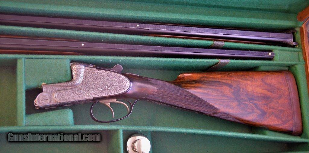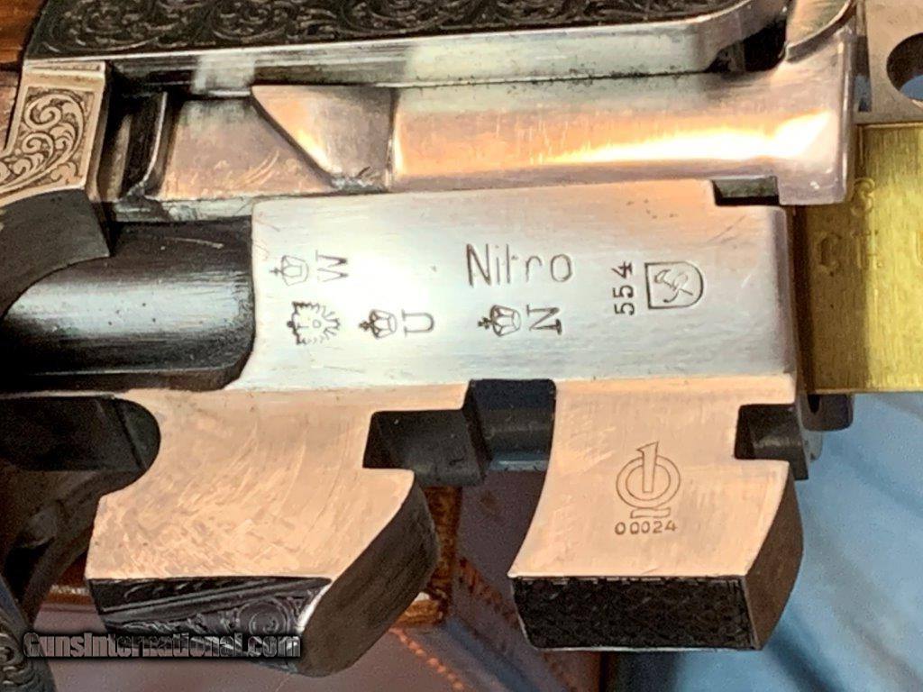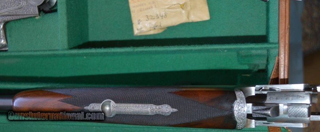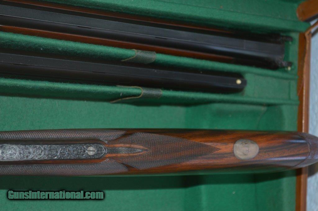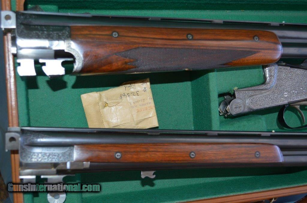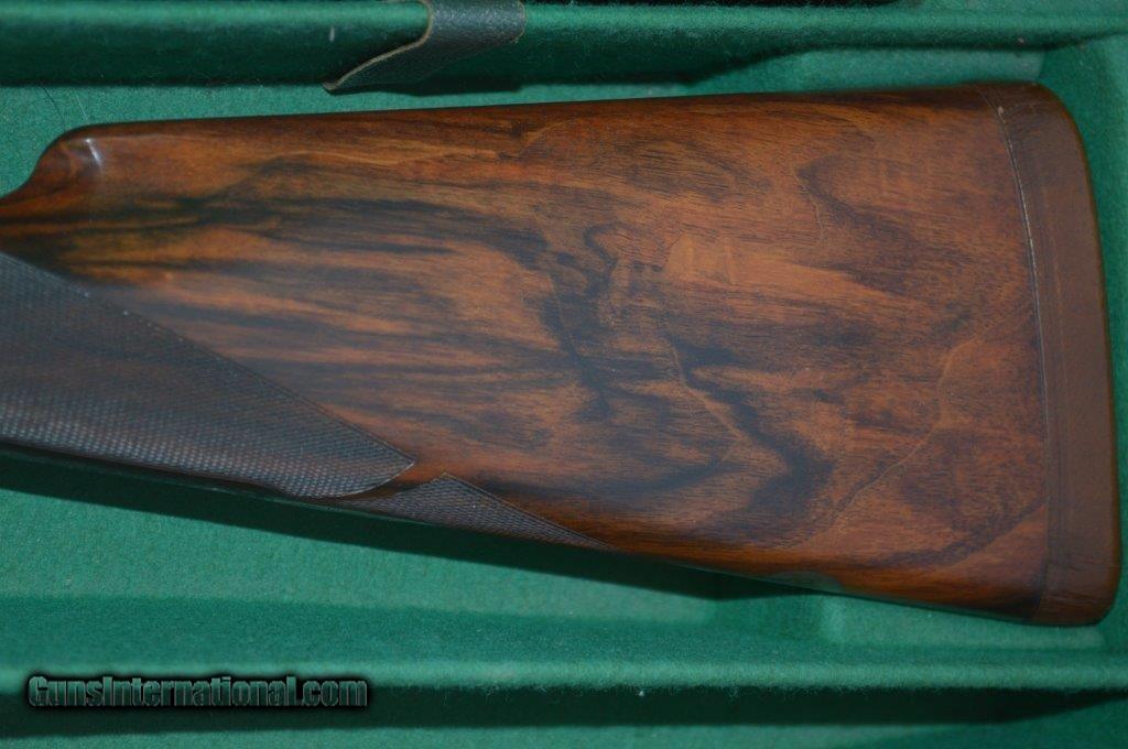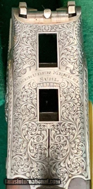 Description: SOLD to MARK The New York Man *** This is a beautiful Merkel 303E Deluxe two barrel set from 1954. It certainly has the features that set it apart and make it a collection quality shotgun. Considered to be one of the best post war Merkels ever made it exhibits wonderful balance and beautiful workmanship. The Kersten patent double lump extensions ensure a tight lock up. The Arabesque hand engraving on all areas of the gun is flawlessly executed and a great example of old world craftsmanship. The darkly colored walnut stock has gorgeous figure on both sides and measures 14-1/4" from the first trigger to the leather covered recoil pad. The three piece forends are nicely made and perfectly checkered as well. The 28" (71 cm) Bohler Stahl barrels have a solid raised rib with perfect bores and feature 2-3/4" chambers and are choked Mod/Imp Cyl. The second set was added in October 1960, is 25-5/8" (65 cm) and they are choked cylinder and IC. It also has cocking indicators on either side of the frame so you'll know when the gun has been fired. Of course a gun of this grade features a hand detachable sidelock action. This is a excellent example of the quality of Merkel's post war production. SOLD Curio/Relic: Yes |