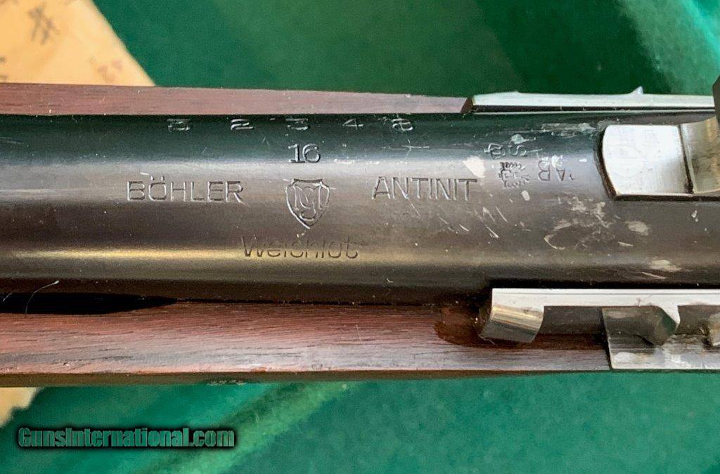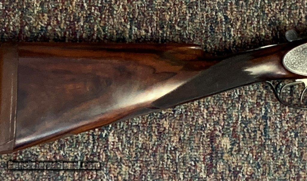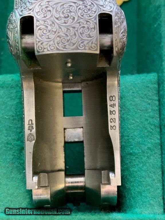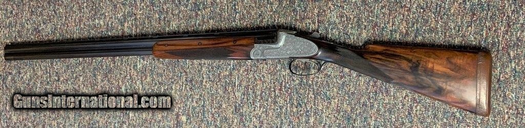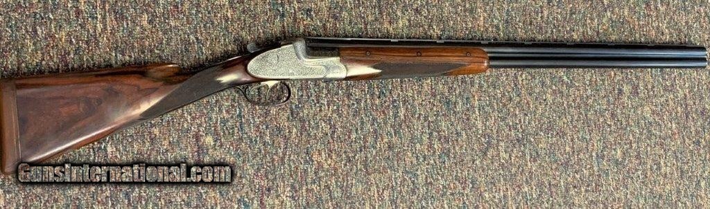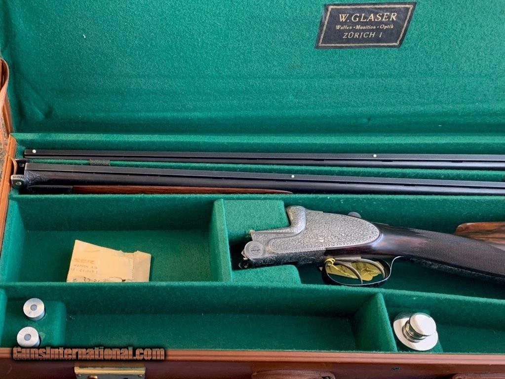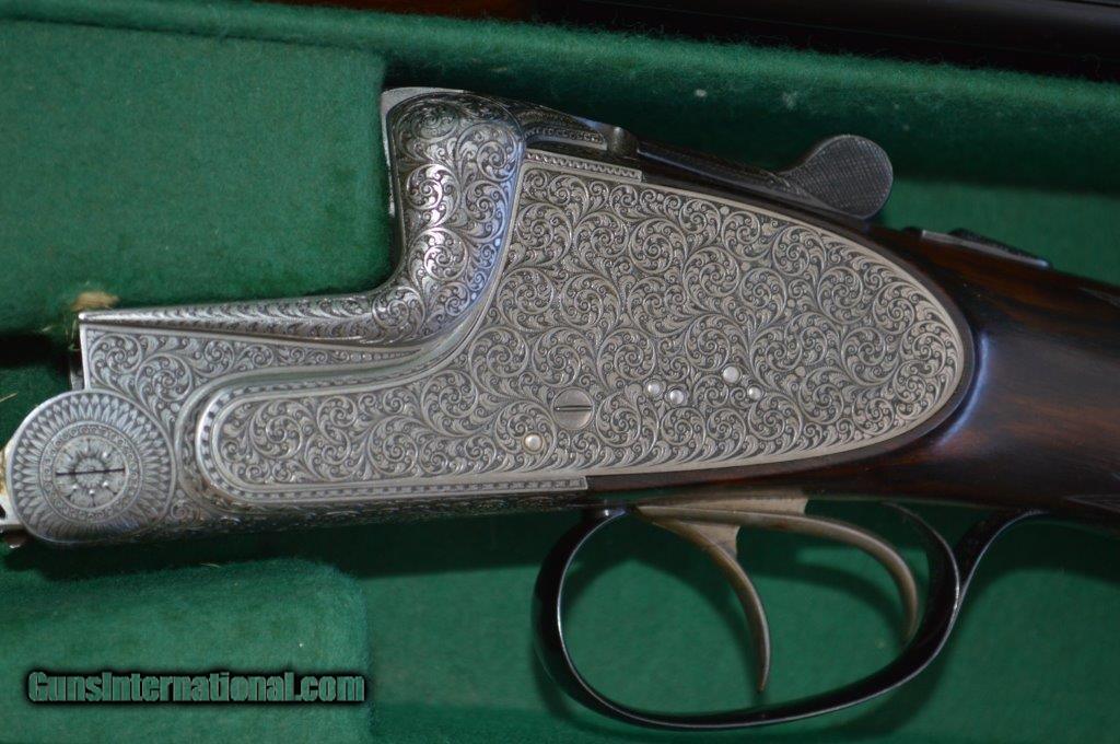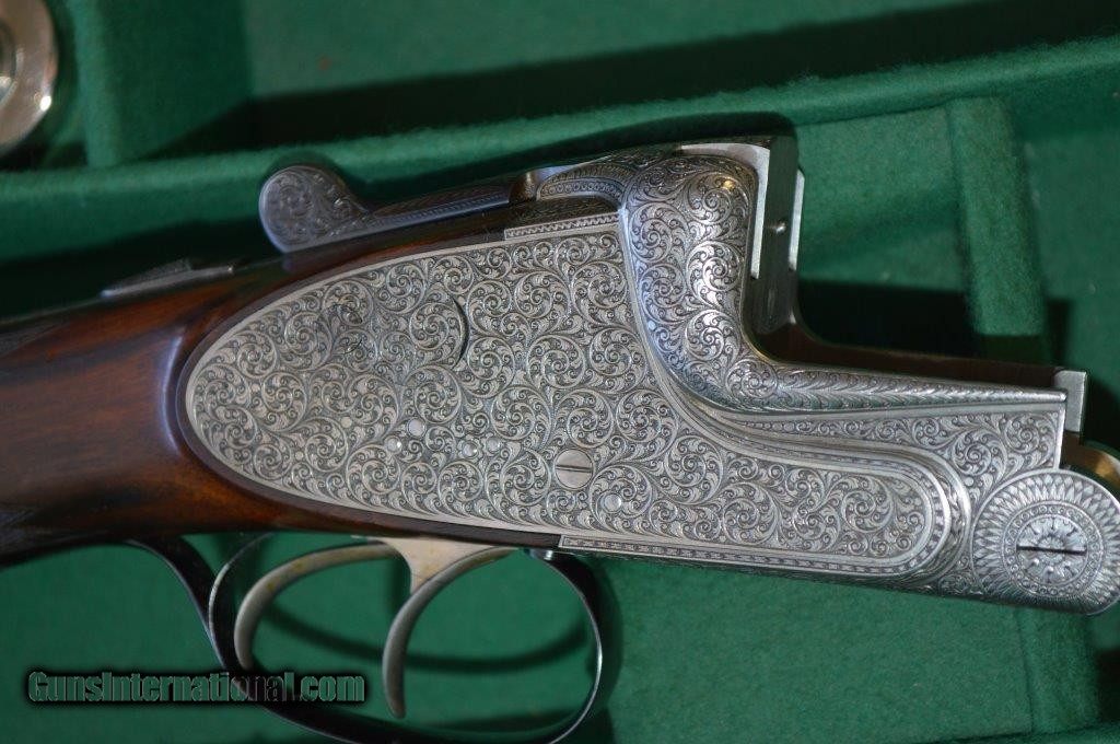 Description: SOLD to MARK The New York Man *** This is a beautiful Merkel 303E Deluxe two barrel set from 1954. It certainly has the features that set it apart and make it a collection quality shotgun. Considered to be one of the best post war Merkels ever made it exhibits wonderful balance and beautiful workmanship. The Kersten patent double lump extensions ensure a tight lock up. The Arabesque hand engraving on all areas of the gun is flawlessly executed and a great example of old world craftsmanship. The darkly colored walnut stock has gorgeous figure on both sides and measures 14-1/4" from the first trigger to the leather covered recoil pad. The three piece forends are nicely made and perfectly checkered as well. The 28" (71 cm) Bohler Stahl barrels have a solid raised rib with perfect bores and feature 2-3/4" chambers and are choked Mod/Imp Cyl. The second set was added in October 1960, is 25-5/8" (65 cm) and they are choked cylinder and IC. It also has cocking indicators on either side of the frame so you'll know when the gun has been fired. Of course a gun of this grade features a hand detachable sidelock action. This is a excellent example of the quality of Merkel's post war production. SOLD Curio/Relic: Yes |