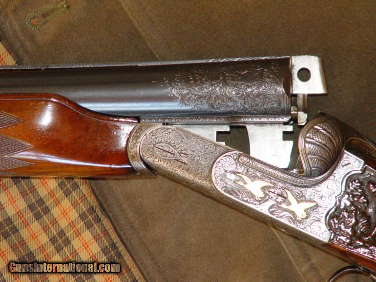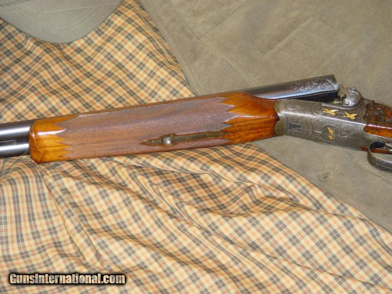 Prewar Merkel 12 gauge 32" Pigeon gun. This gun is equipped with a single selective trigger, ejectors, receiver side clips, a ventilated rib, a beavertail forend and ivory beads. The receiver is adorned with six gold inlays; two pheasants on the right side, two ducks on the left side and two woodcocks on the bottom. The Boehler Antinit barrels are lavishly engraved as well with two pheasants on the right side and two ducks on the left side. The bores are smooth and shiny with 2-3/4" chambers. The bottom rib has two exceptions in it of about 1-1/2" long that allow additional air movement for cooling during heavy shooting. And like all great pigeon guns it has no safety to ensure a positive shot when high stakes are on the line. Insured and shipped to your FFL for $75.