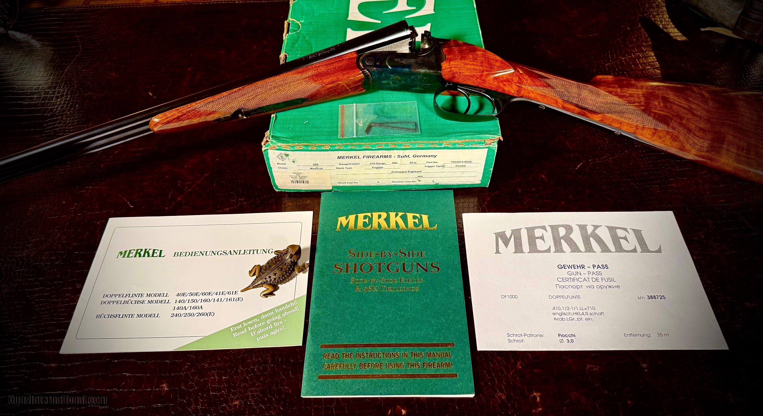Description: MERKEL 360 410GA 28" 99% AS NEW IN THE BOX MOD/FULL CHOKES - INCREDIBLE CLARO WALNUT - DOUBLE TRIGGER TINY FRAME - MOST GORGEOUS LITTLE FIELD 410 WITH THE TINEST FRAME FOR CARRYING ALL DAY.