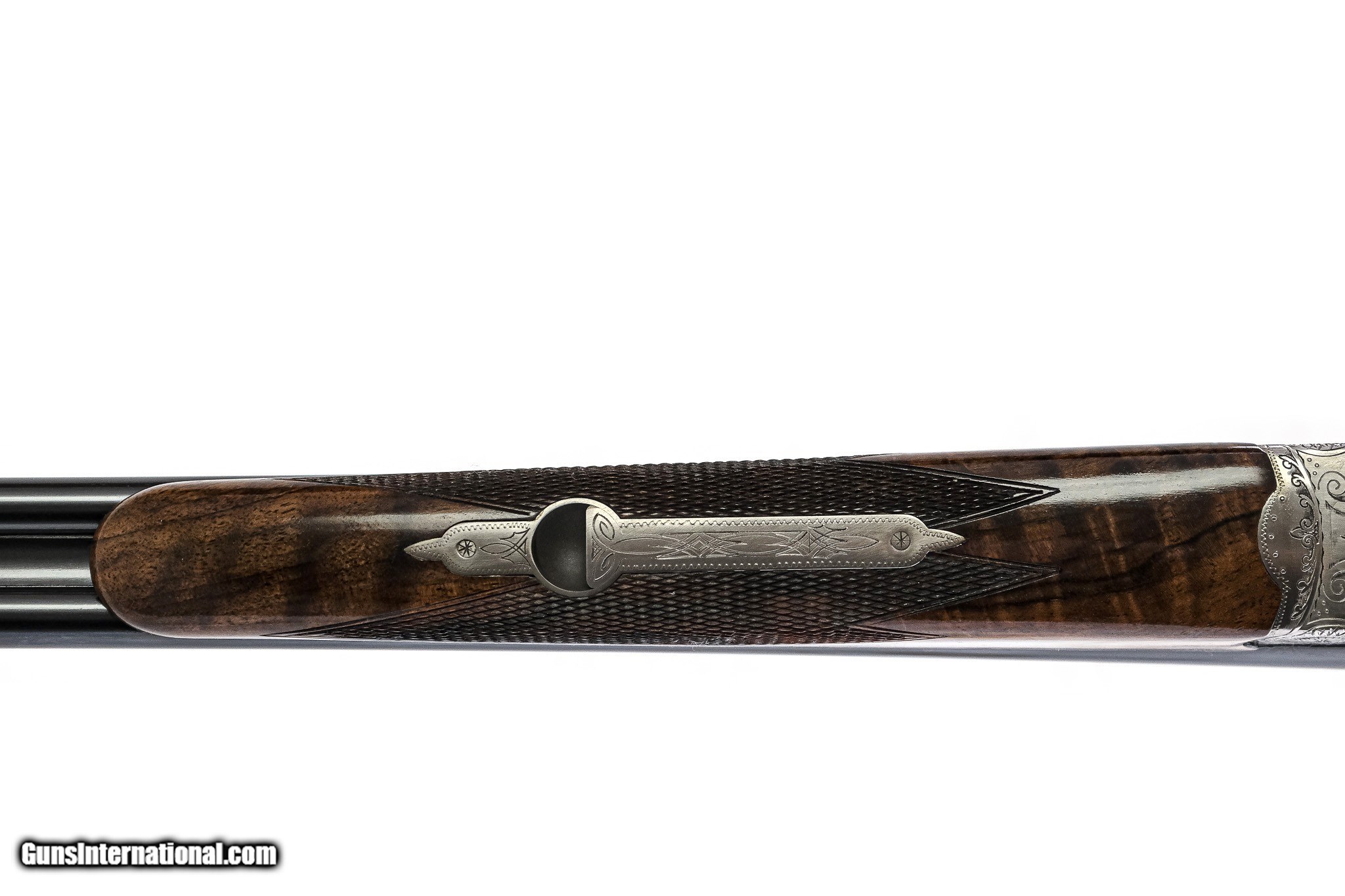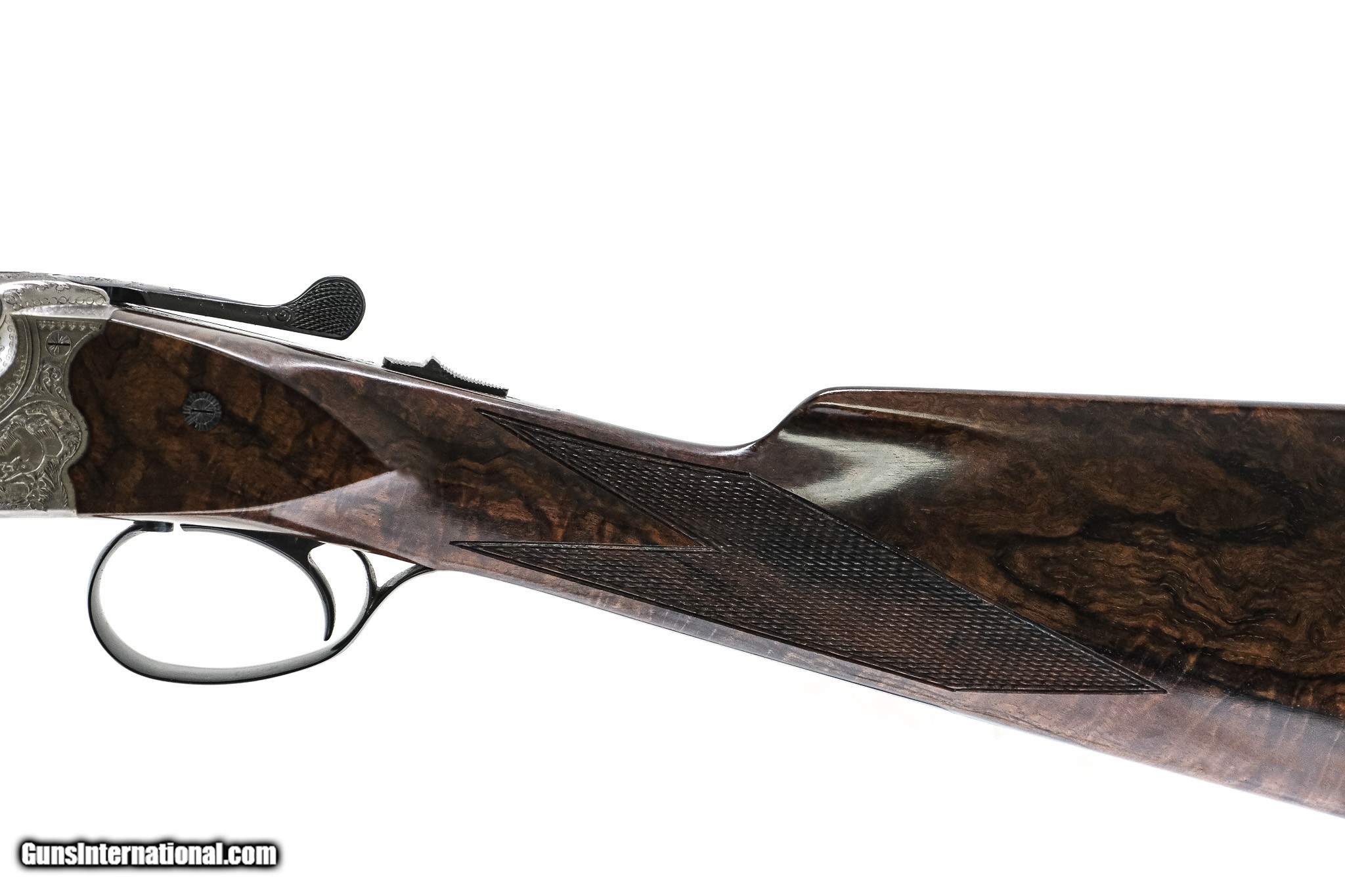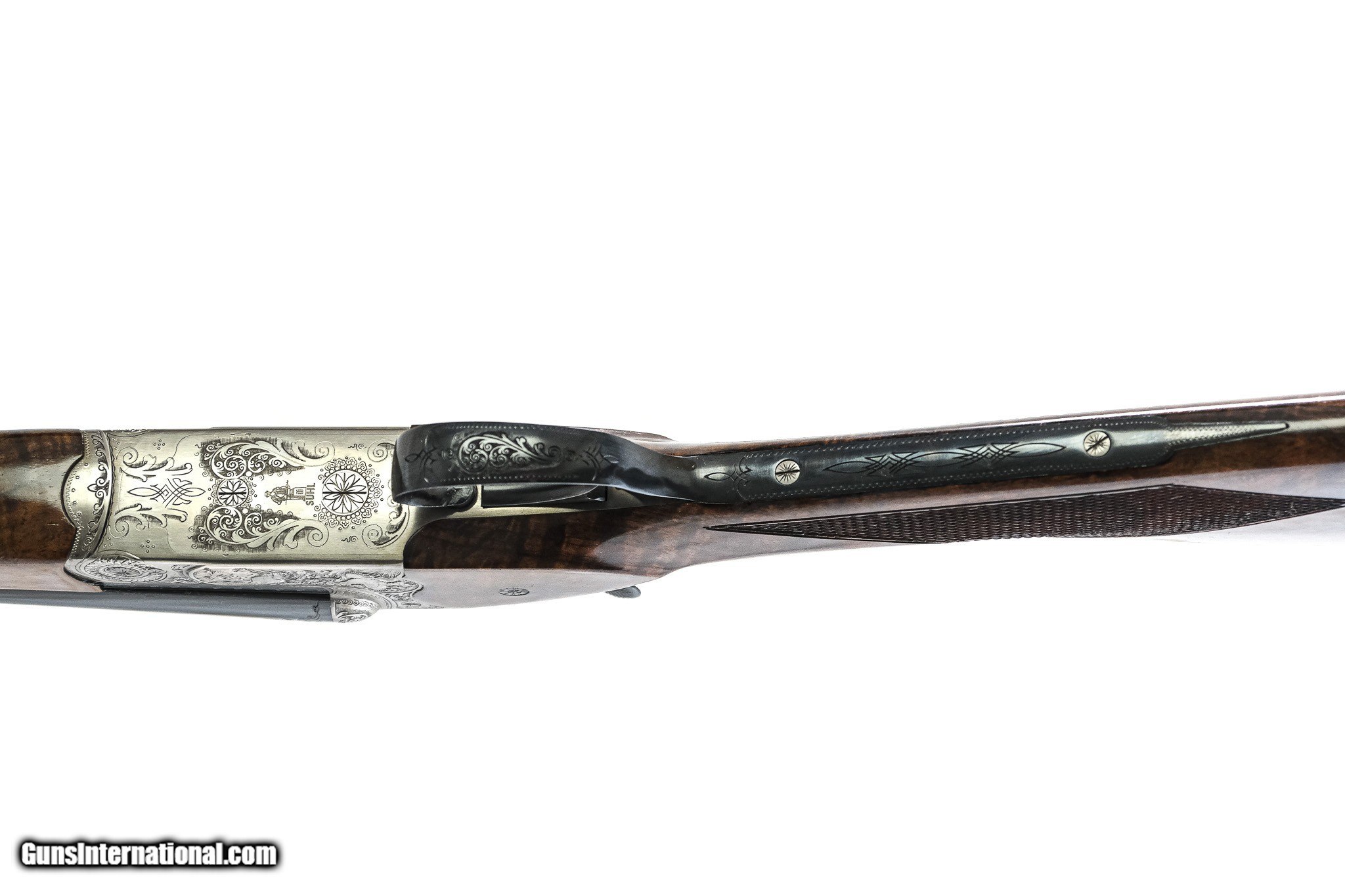 Description: Merkel - 360EL, SxS, Special Order, .410ga. 28" Barrels Choked M/F. Barrels choked at Mod/Full, straight grip, splinter forend, single trigger, auto ejector, this gun was custom built by Merkel, with custom stock dimensions, and a specially selected piece of Turkish walnut, diamond grip, original buttplate, relief engraved with quail, woodcock, and surrounded by squirrels on a rebated frame. This is a very special gun of late Manufacturer, gun remains as new with minor handling marks. Inv: 72621 5 lbs. 7 oz. 14 3/4" x 1 5/8" x 2 3/4" $8,450.00 SOLD |
