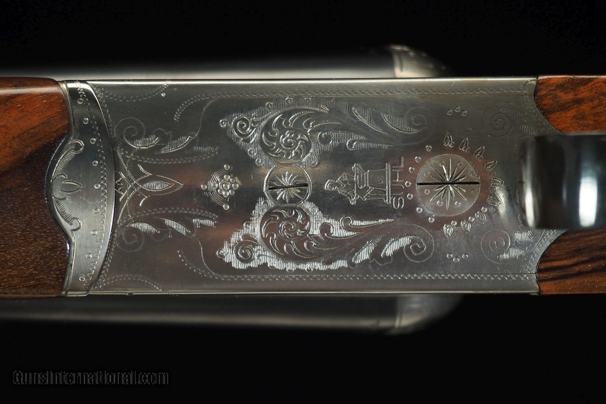 Description: Merkel 47SL Sidelock Ejector, 12 Bore, 6 lbs. 12 oz., 3" chambers, 28" Krupp steel barrels with a raised concave machined game rib, choked .009 IC and .015 Lt. Mod, sidelock action in coin finish with some scroll engraving extending to the fences and breech end of barrels, cross-bolt, sideclips, cocking indicators, disc-set strikers, automatic safety, double triggers, splinter forend, highly figured European walnut stock, 15" LOP over a leather covered pad, 1 9/16" DAC, 2 7/16" DAH, 1/8" cast off, straight grip. Excellent condition showing little use. Comes with the early Merkel hard canvas and leather luggage case.You don't see many Merkel sidelocks. 1990's era gun. SOLD |