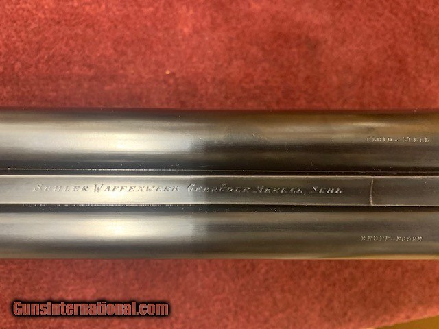Description: Merkel BLE 12g 30" Cool old German SxS. YOM 1926. Borderline engraving, horn capped pistol grip with unengraved gold medallion, Silver's recoil pad (somewhat ill-fitting), splinter forearm with Anson push rod, Purdey double underlug bolting, smooth concave tapered rib with single bead. Ribs re-layed and barrels re-blacked by Kirk Merrington. Excellent bores- recently inspected and serviced by Dan Morgan. Merkel made few pre-war sxs. Great colors! 2 3/4" chambers 29 7/8" barrels Bores .721 R and .721 L Chokes IC/LM .008 R and .015 L Walls .032 R and .033 L LOP 15" w/14" of wood Comb 1 1/2" Heel 2 1/2" Cast 1/8" off 5 degrees pitch Ejectors Automatic safety 7 1/2 lbs Double triggers Call or email for additional information. SOLD Shotgun Gauge: 12 Gauge Condition: Good to very good Metal Condition: Very Good Wood Condition: Very Good Bore Condition: Excellent Item Location: Vermont |