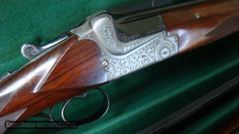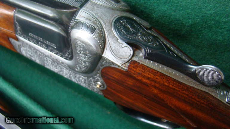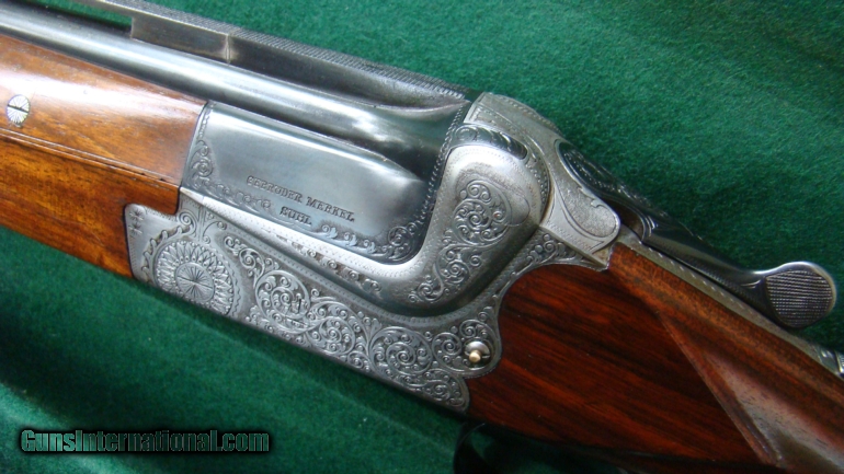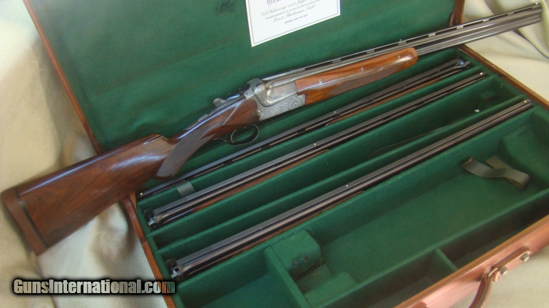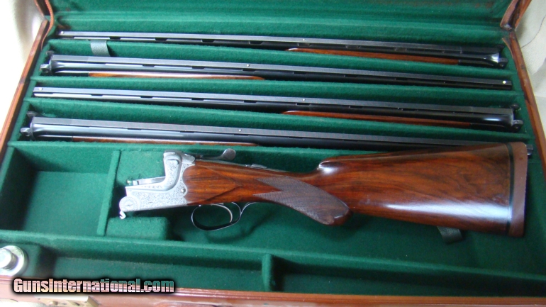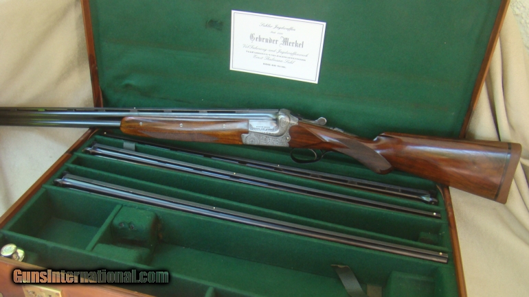 Description: Merkel O/U 4 ga. 12/20/28/410 set, 4 sets of 26" Bohler steel vent rib barrels feature double ivory beads. Choked as follows: 12 ga. .004./.004, 20 ga. .007/.007, 28 ga. .006/.006, 410 ga. .005/.005 Double Kersten lockup, scalloped back action with old silver finish and full arabesque coverage. Cocking indicators, single selective trigger, automatic ejectors, three piece forend, non-auto safe. Semi-round knob pistol grip stock of nicely figured European walnut measures 1-3/8" x 2-3/8" x 14-1/2" over a solid rubber pad. Seldom seen and a gauge for every purpose! 99% overall. Cased in its original leather trunk case SOLD |