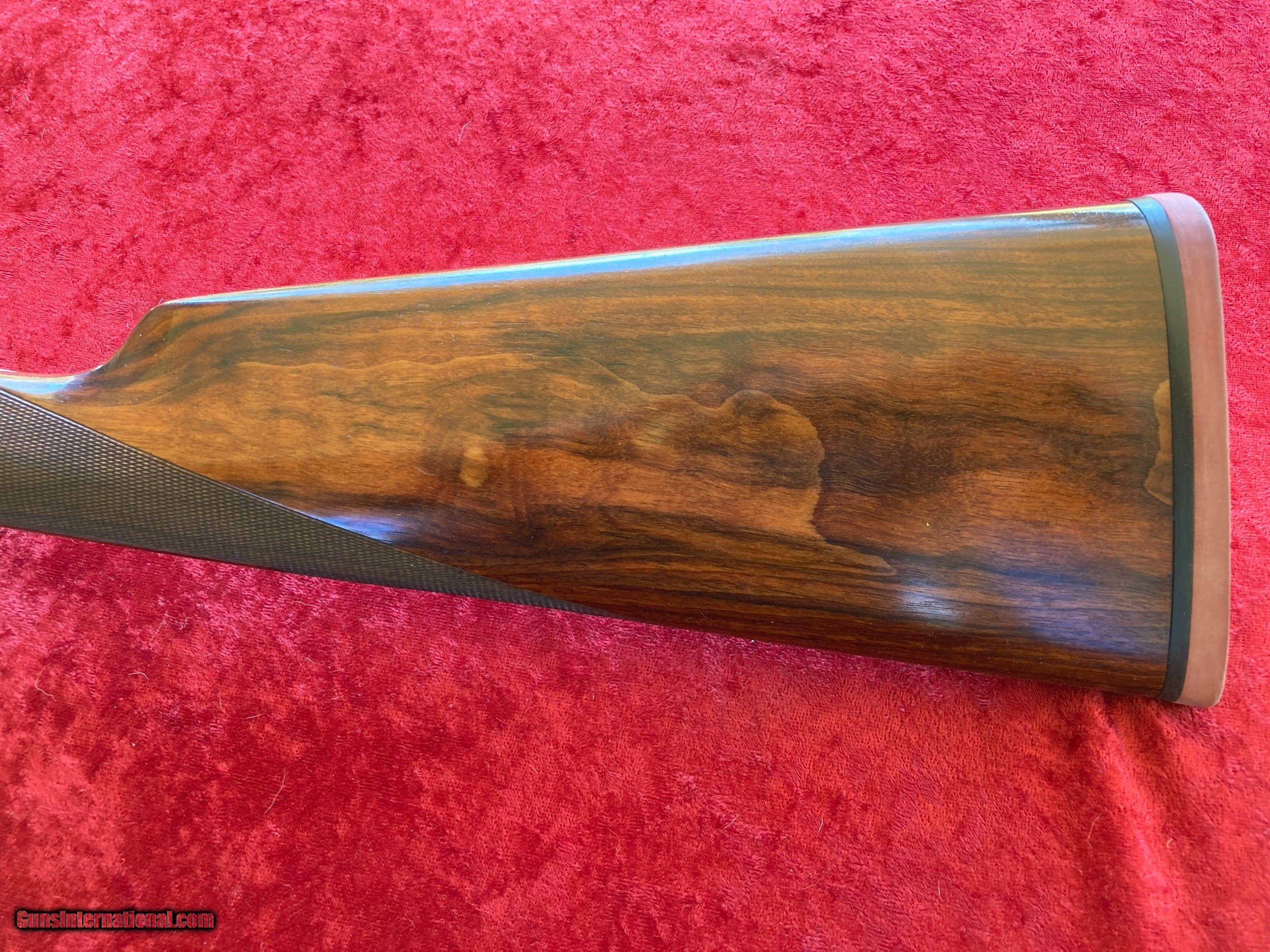 Description: Merkel model 203 Hand detachable 5 pin sidelock. Mfg. June 1966. Used 90%+ condition. Serial #64753 20 & .410 ga. barrels. 20ga. has 2 3/4" chambers and measures approx..600 at the muzzles. .410 barrels are 3" chambers and measure approx. .400 at the muzzles. Both sets are 26" With vented ribs and Ivory front bead. Custom stocked in AAA Turkish walnut. Hand checkered and carved long tang on the butt stock. 14 3/4" LOP to a red Pachmayr recoil pad. Same forearm for both sets of barrels. Forearm bottom half is similar to the old skeet/trap Ovate style of yesteryear. Single, selective mechanical trigger. Manual safety. Right side of receiver has hand engraved dog retrieving pheasant with 4 more pheasants in the scene. Left side of receiver is Flying hawk attacking Hungarian partridge with 5 others flying escape. Arabesque engraving with Suhl gunsmith on the bottom of receiver. 3 small gun safe/handling marks towards the bottom of buttstock. It's a beauty. This is a ROCK BOTTOM PRICE. Bet you can't find any comparable shotgun for close to this price~! SOLD |