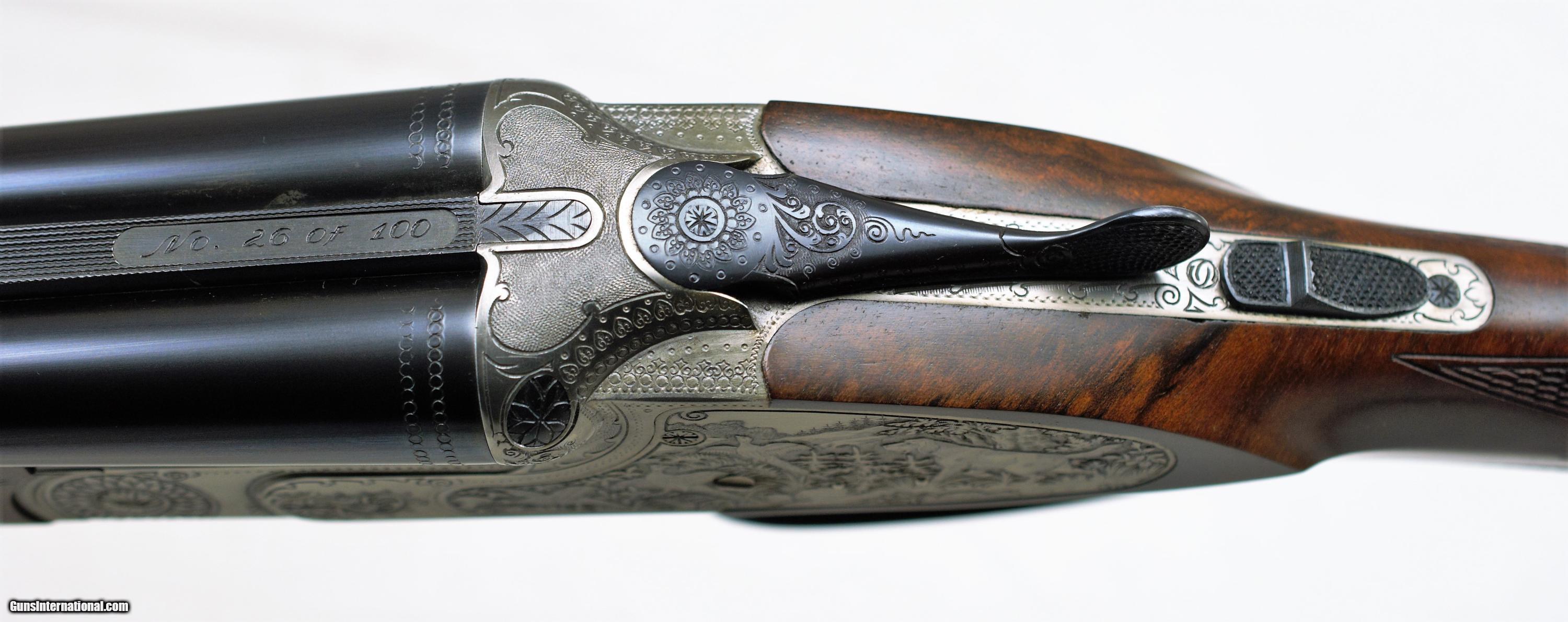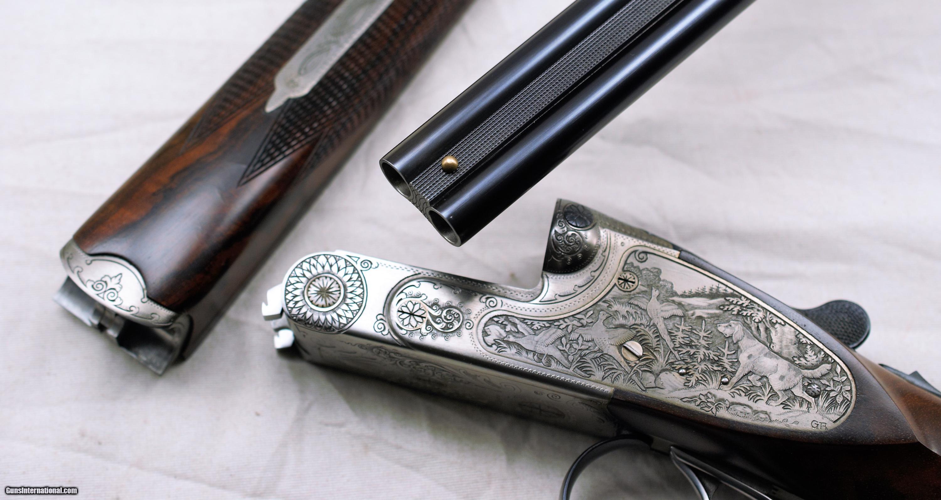 Description: NUMBER 26 OF 100 SIGNED BY MASTER ENGRAVER GUNTER RICHTER! MERKEL 360SL SIDE x SIDE ... 410 gauge ... 28" solid rib barrels ... 3" chambers ... choked Mod/Full ... Holland & Holland style sidelocks ... LOP 14 1/2" ... drop b 1 5/8" ... drop heel 2 1/2" ... double triggers. The receiver is deep relief engraved with 6 ducks in a marsh scene on the right, a dog flushing pheasants in a field scene on the left with scroll patterns surrounding both sides as well as the bottom, trigger guard and forearm hardware. The lower left side is signed "GR". Luxury grade, oil finished, full figured English walnut is used to make a beautiful straight grip stock and matching forearm. The gun is housed in a green canvas case with leather corners and a leather label afixed to the inside of the lid. The original Merkel box numbered to the gun es with this purchase. Enjoy the pictures and call with any questions. Please review our other listings for ... "Only the best!” SOLD |