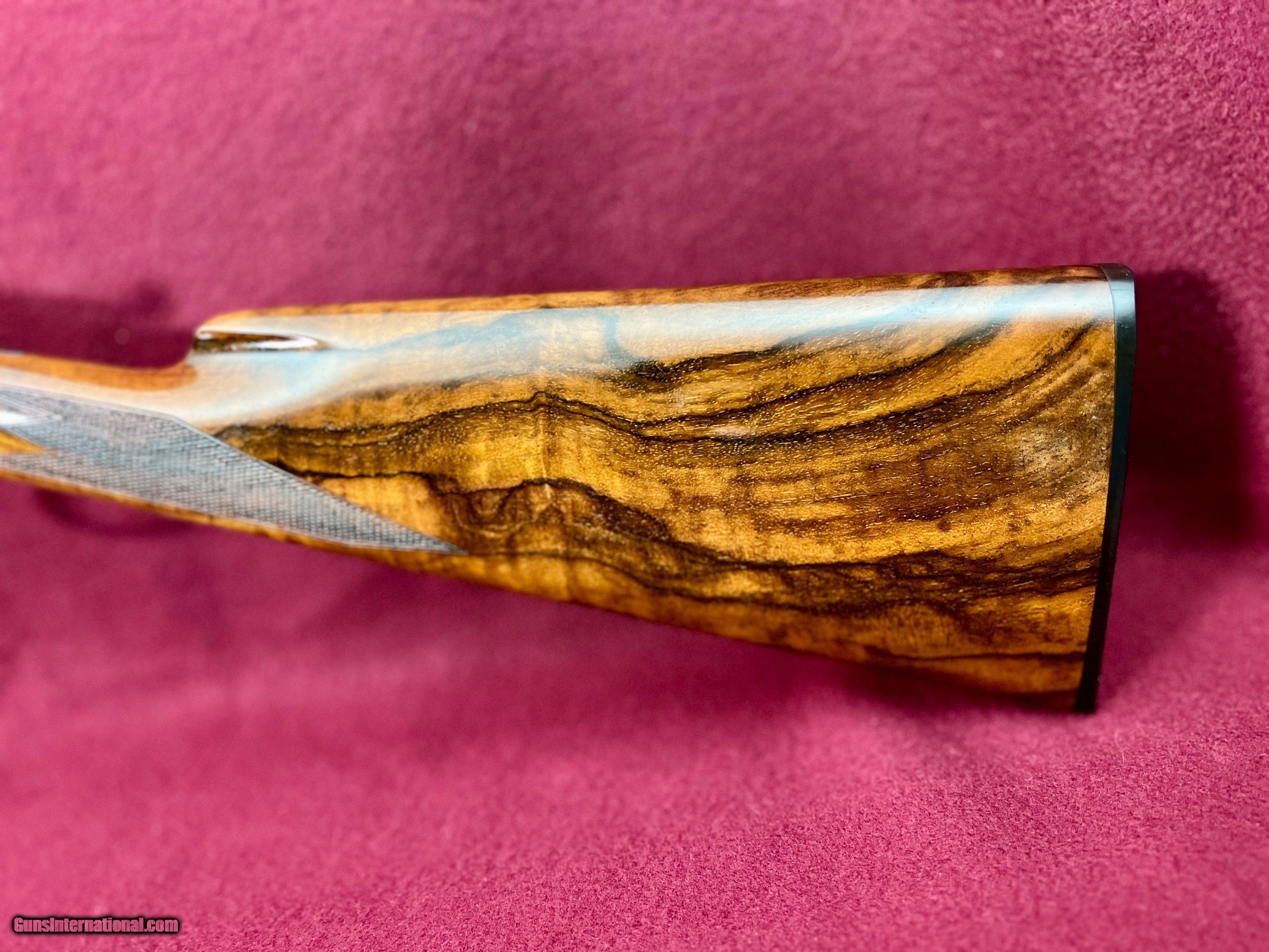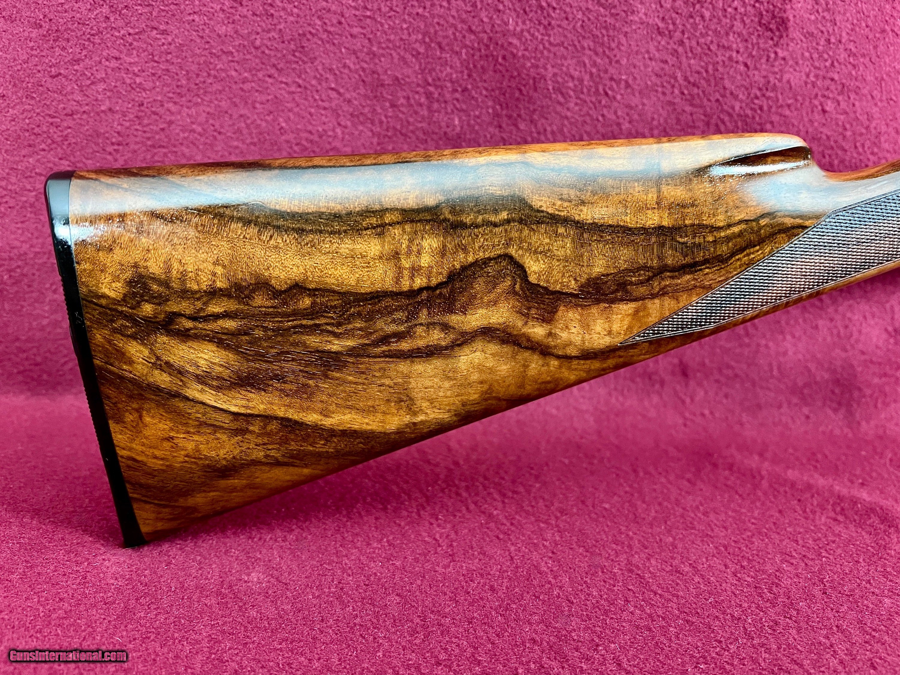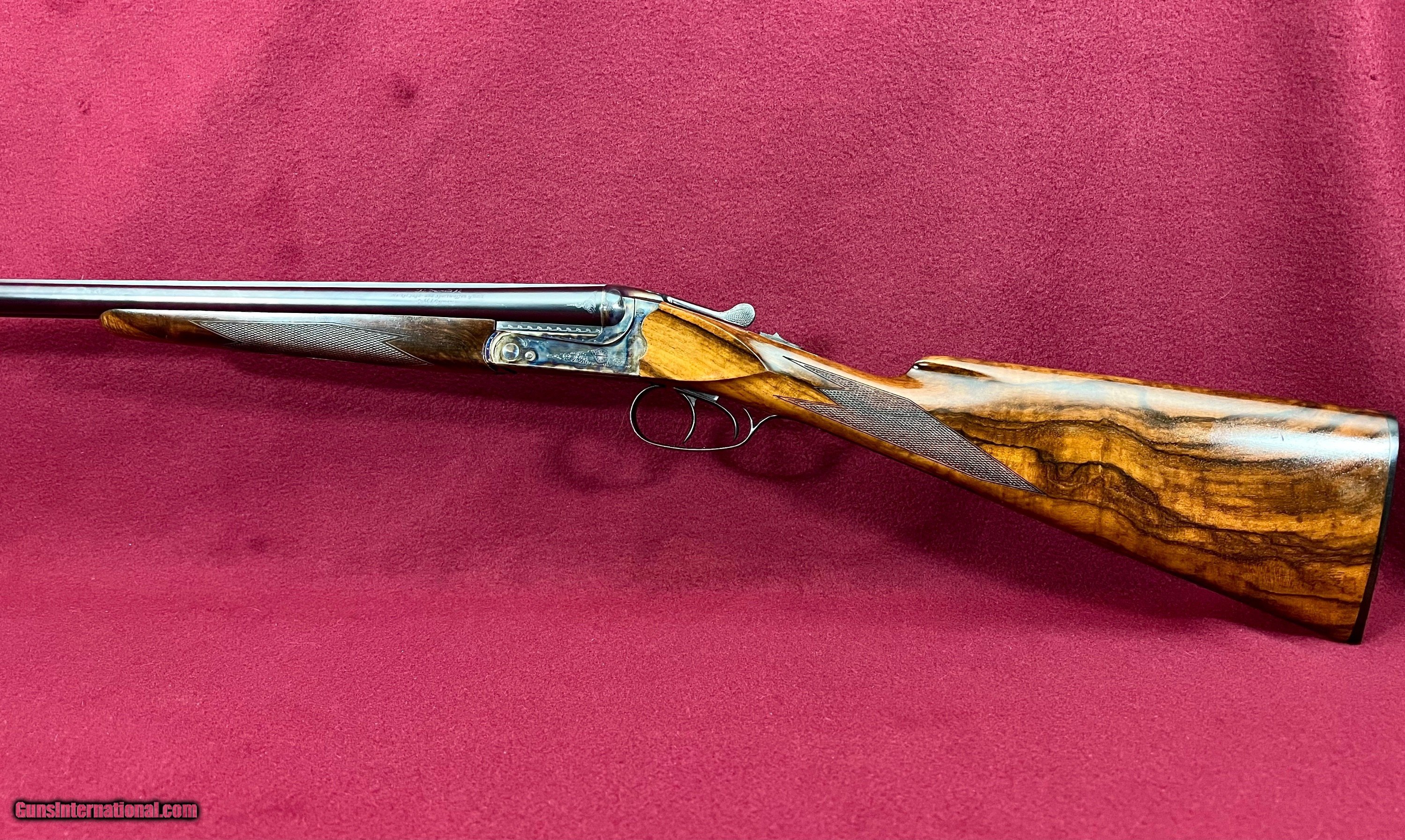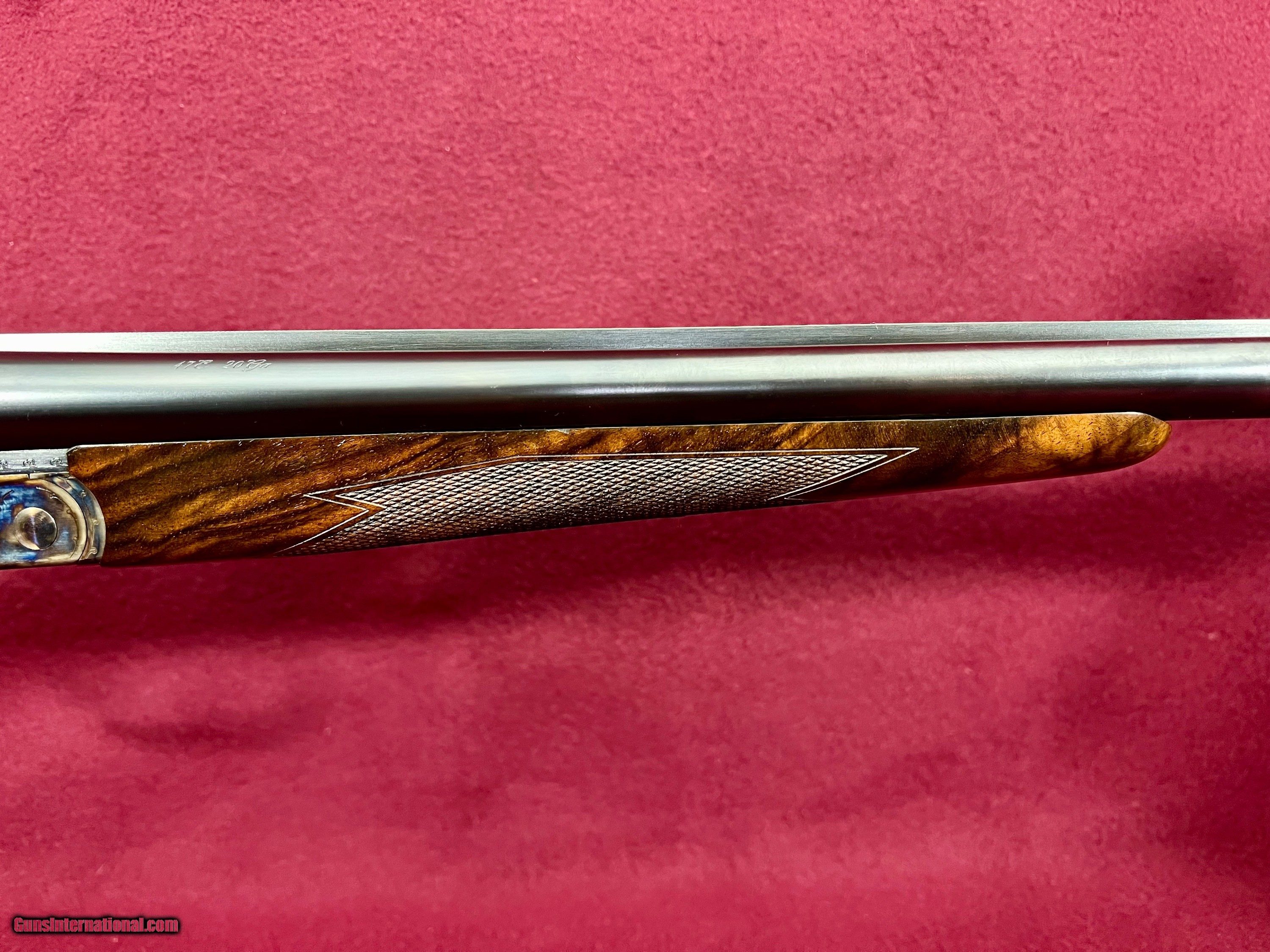 Description: I have for sale a beautiful Merkel Model 47E side by side in 20 gauge. This particular gun comes with 30 inch barrels with improved cylinder and modified chokes with both both bores measuring .627 and right barrel constriction of .008 IC and left at .016 Mod. just as marked on the barrel flats. The barrels also have factory 3 inch chambers which sets this gun up perfectly for Pheasants or even ducks over decoys. Straight English stock with dimensions of 1 1/2 X 2 1/2 X 14 7/16 over the original Merkel butt plate. Stock has slight cast off for the right hand shooter. While we are talking about the stock, please take a look at the attached pictures and see the wood on this gun. I've never owned or seen a Model 47E with wood even close to this stock. I would definitely say it had to be a special order gun to get this grade of wood. The stock also features a splinter forend which matches the butt stock perfectly. The bone and charcoal case coloring on this gun is drop dead gorgeous and in perfect condition as you can see in the pictures. Trigger pulls are crisp and selective ejectors are strong and well timed. Merkels are built tough with the greener crossbolt lockup and are made to be shot. Weight of the gun is a nice 6 pounds 6 ounces. Condition of the gun is excellent with a few light impressions in the wood. There is nothing that detracts from the beauty of this little gun. Price of the gun is $4200 plus $75 shipping to your FFL. As always there is a three day non-firing inspection period with the buyer paying shipping charges if returned. Contact me with any questions you might have. Shotgun Gauge: 20 Gauge Manufacturer: Merkel Model: 47E Serial Number: 3169 Barrel Length: 30 Chambers: 3 Inch Ejectors: Selective Well Timed Condition: Excellent Metal Condition: Excellent Wood Condition: Excellent Bore Condition: Perfect Action: Boxlock Triggers: Double Stock: Straight English Stock Comb: 1 1/2 Stock Heel: 2 1/2 Stock Cast: Slight Right Hand Fore End: Splinter Butt Pad: Merkel Plate LOP: 14 7/16 Rib: Solid Raised Weight: 6 pounds 6 ounces Sights: Single front Bead Chokes: IC & Mod Choke Left: .016 Mod Choke Right: .008 IC Engraving: Scroll Extras: None Price: $4,200.00 Shipping: $75.00 Contact Seller |