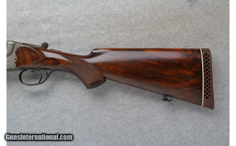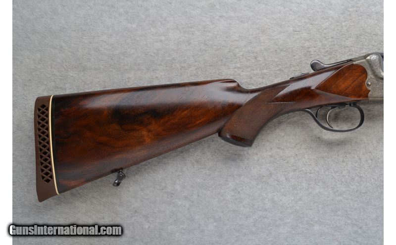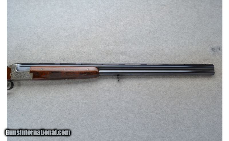 Description: This Merkel Over and Under Model is a16 Ga. shotgun. It has 28 inch barrels with ejectors and a top barrel ventilated rib with a white front bead sight. With a 2 3/4 inch chamber it has fixed Full and Modified chokes. The single trigger has a barrel selection lever on the trigger right side. The stock is a checkered walnut pistol grip and checkered grip two piece forearm. The coin finished receiver is beautifully engraved with scroll and has pheasant, fox, hunting dog and ducks in detailed outdoor scenes. It has sling swivels. 16 Gauge SOLD Chambers: 2 3/4 inch Over / Under with Ejectors. Metal Condition: Very good with a few spots of very minor barrel freckling and very minor handling marks. Wood Condition: Very good with some very minor handling marks. Barrels: 28 inch blued with a top barrel ventilated rib. Triggers: Single trigger with a barrel selection lever right side next to it. Stock Dimensions: LOP 14 3/8 inches. DAC 1 3/8 inch. DAH 2 3/8 inch. Fore End: Checkered two piece walnut. A small fine seperation in the two piece on left side front. Butt Pad: Pachmayr White Line rubber recoil pad. Sights: White front bead. Chokes: Fixed Full and Modified. Item Location: Grand Junction, CO |