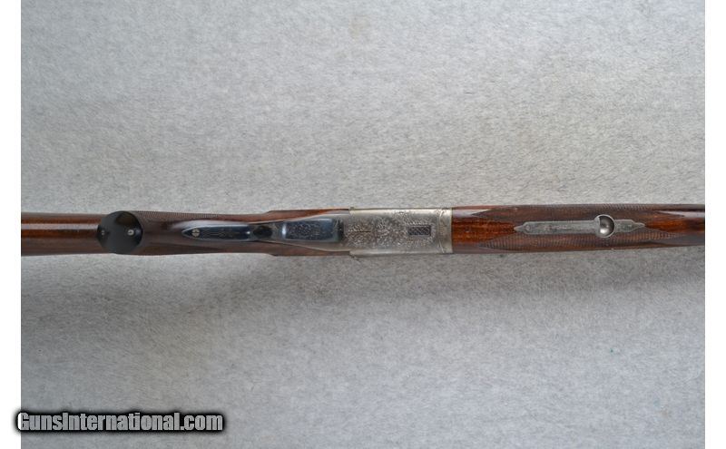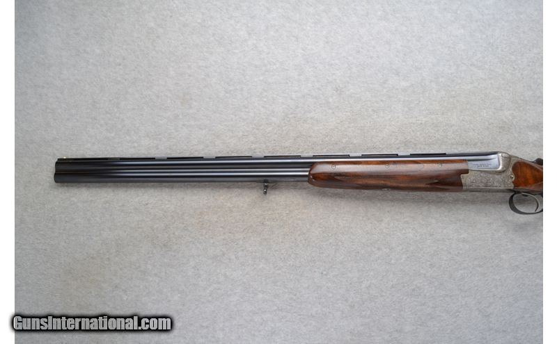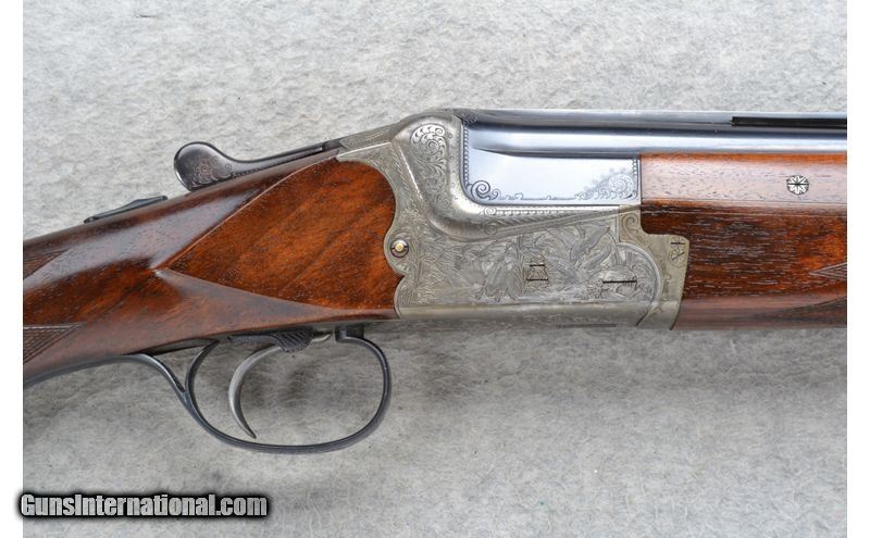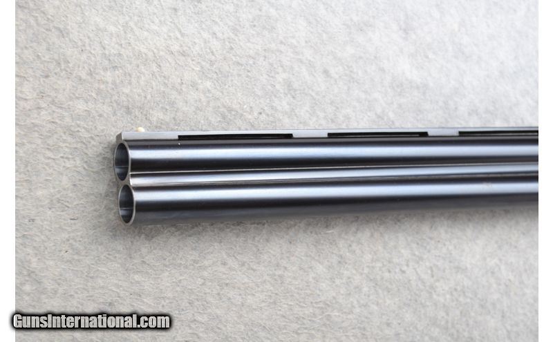 Description: This Merkel Over and Under Model is a16 Ga. shotgun. It has 28 inch barrels with ejectors and a top barrel ventilated rib with a white front bead sight. With a 2 3/4 inch chamber it has fixed Full and Modified chokes. The single trigger has a barrel selection lever on the trigger right side. The stock is a checkered walnut pistol grip and checkered grip two piece forearm. The coin finished receiver is beautifully engraved with scroll and has pheasant, fox, hunting dog and ducks in detailed outdoor scenes. It has sling swivels. 16 Gauge SOLD Chambers: 2 3/4 inch Over / Under with Ejectors. Metal Condition: Very good with a few spots of very minor barrel freckling and very minor handling marks. Wood Condition: Very good with some very minor handling marks. Barrels: 28 inch blued with a top barrel ventilated rib. Triggers: Single trigger with a barrel selection lever right side next to it. Stock Dimensions: LOP 14 3/8 inches. DAC 1 3/8 inch. DAH 2 3/8 inch. Fore End: Checkered two piece walnut. A small fine seperation in the two piece on left side front. Butt Pad: Pachmayr White Line rubber recoil pad. Sights: White front bead. Chokes: Fixed Full and Modified. Item Location: Grand Junction, CO |
