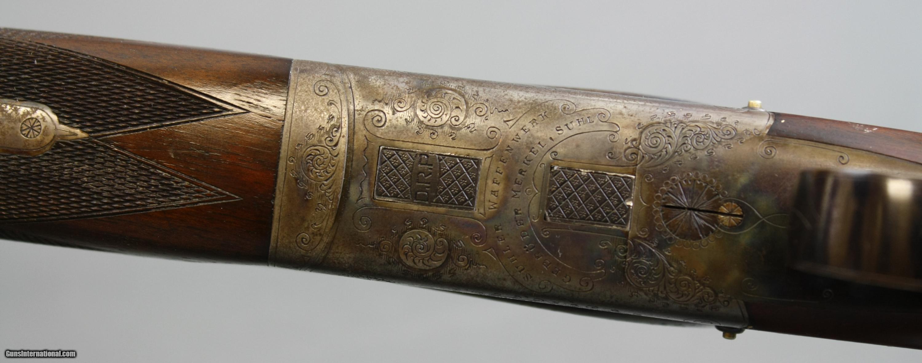 Description: This shotgun absolutely never saw field use. It retains 95% plus orignal rust blue, case colors, and wood finish. Minor handling finish marks only. Mint bores and tight as the day it was made. Solid rib with a factory ivory bead. Barrels actually measure a little over 28". This is a totally orignal gun in extrememly high survivor condition. Quality trades always considered. SOLD Curio/Relic: Yes Manufacturer: Merkel Model: 200E Bore: perfect Chambers: 2 3/4 Ejectors: yes Condition: orignal Gauge Info: 16 Stock Dimensions: 14 1/4 x 1 1/2 x 2 5/8 Butt Pad: plate Weight: 6 lbs Choke Left: top .668 ( .039 ) Choke Right: bottom .667 ( .028 ) |