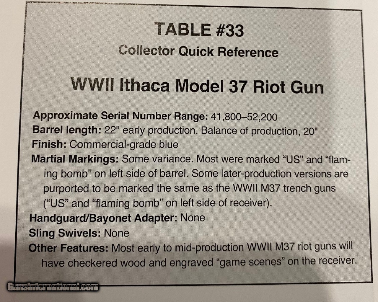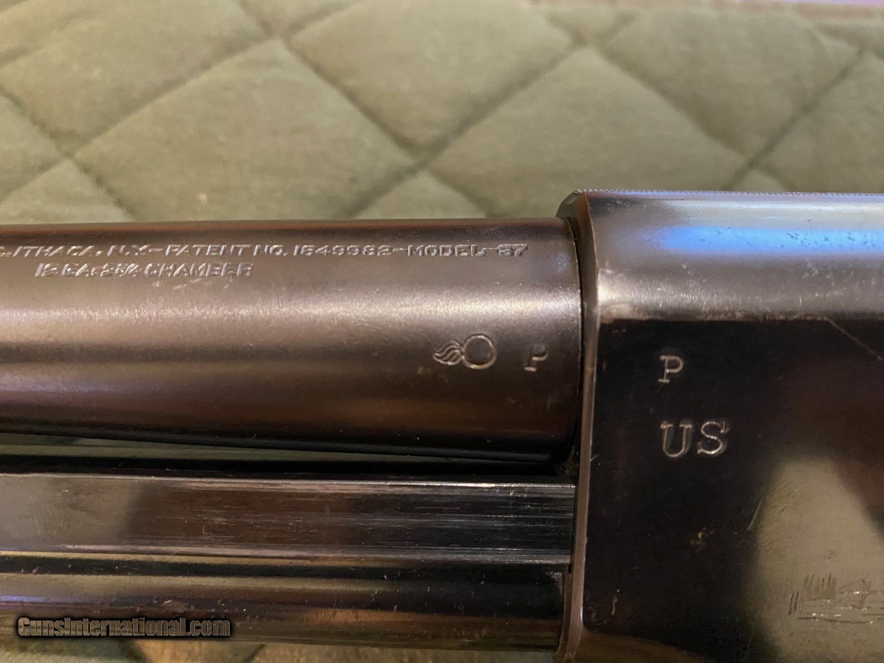 Description: SOLD - Funds Received This Ithaca RIot shotgun is believed to have been acquired as part of the 1940's "blanket procurement program", a U.S. government initiative to scour commercial and civilian sources for new and used shotguns, of which the government had a mighty need. THey were issued as primary armament to home front defensive units (like the "State Guard" units acting in lieu of federalized National Guard units or security forces at vital industrial establishments) and were also given to police and militia forces in lieu of weapons that could be recalled for Army issue. The accepted shotguns typically show a combination of standard commercial markings and hand-stamped inspection and approval markings, with this example having a "P" stamped on the chamber and receiver, "flaming bomb" on the barrel, and "US" on the receiver, in addition to the standard (matching serialized) barrel markings and roll-stamped receiver game bird scenes. The forearm and pistol grip are both checkered, 20 inch barrels and 13 1/2 inch length of pull. It also has the cartouche markings on the stock. Serial number matching on barrel and reciever. Please let me know if you have any questions, or interested in the shotgun SOLD Shotgun Gauge: 12 Gauge |