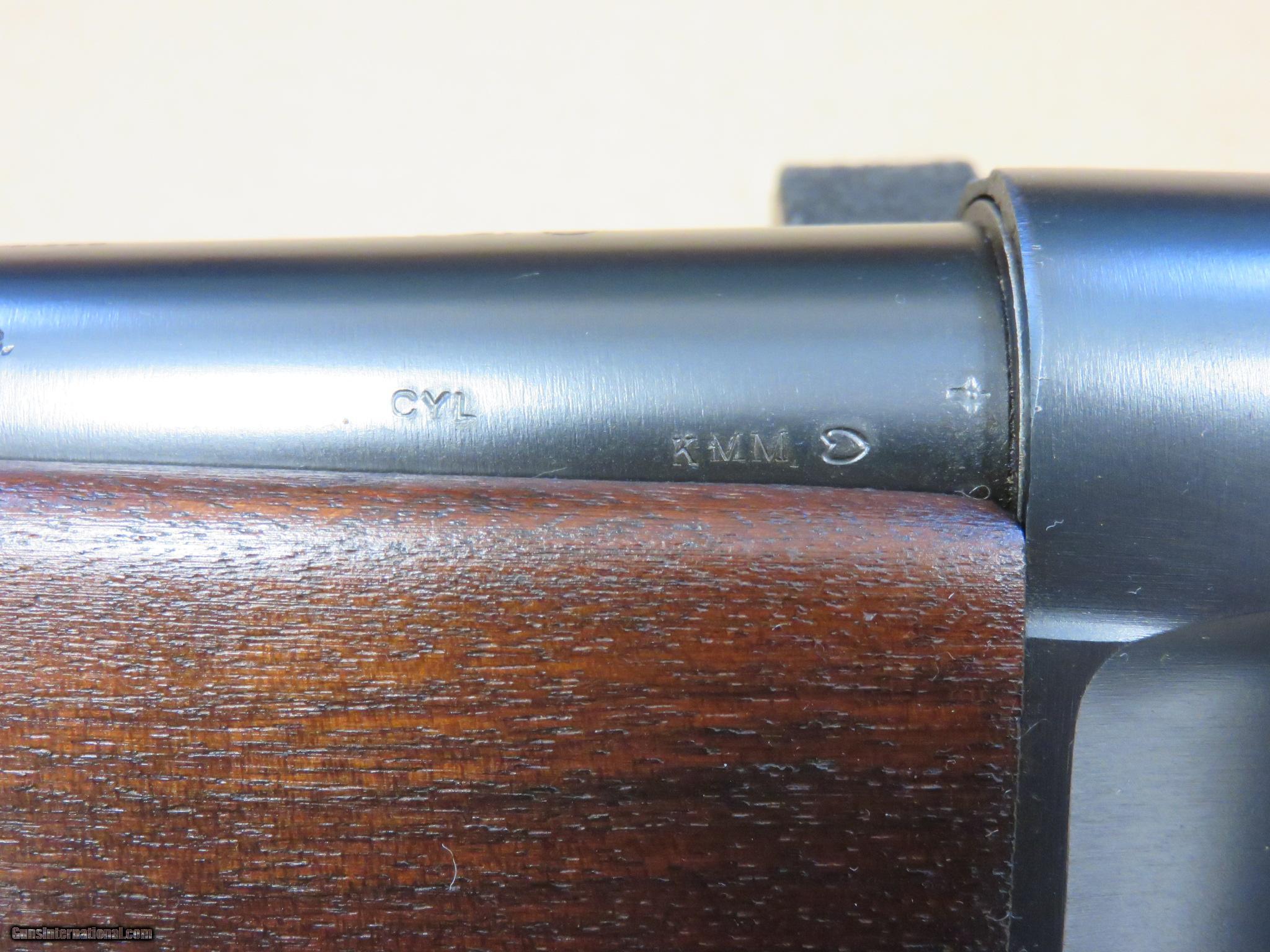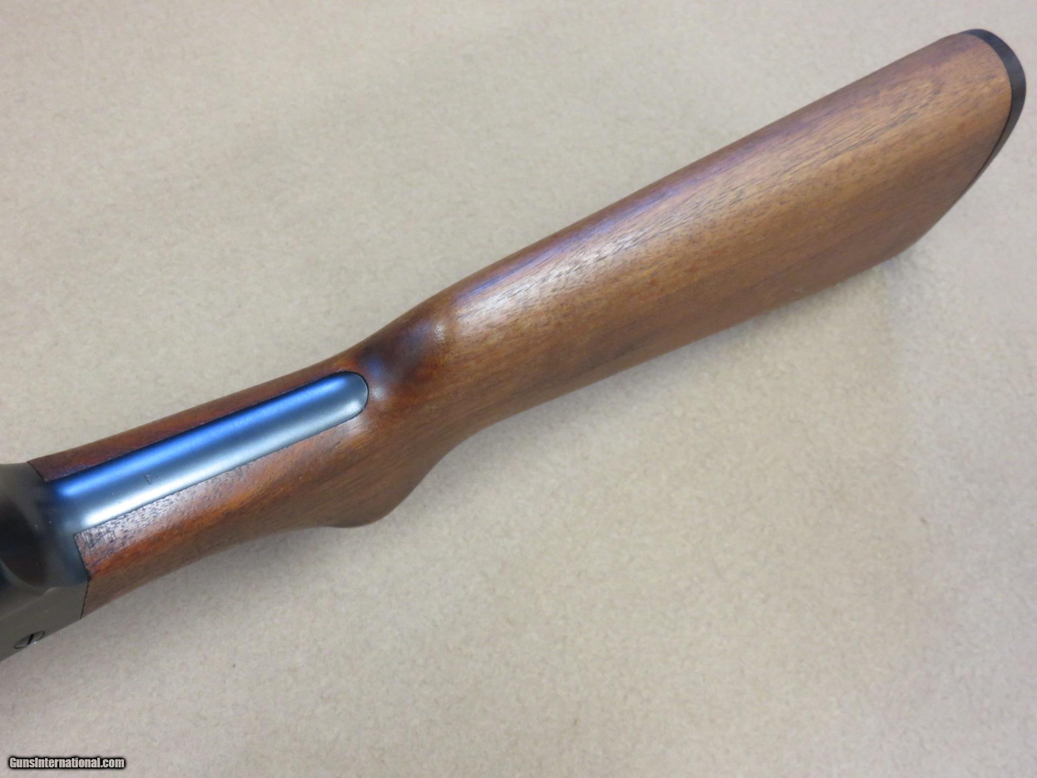 Description: Here we have an absolute beauty of a World War 2 production Remington Model 11 Riot Gun in minty, possibly unfired 100% original condition. During WW2 Remington produced under government contract the semi auto Model 11 in both standard configurations for gunnery training and recreational use, and a riot gun configuration for combat duty. All of the WW2 Remington Model 11s were made during a 3 year period within 2 serial number ranges. The U.S. Military contract Model 11 Riot guns were plain guns with unadorned walnut stocks and a "military" blue finish. The "military finish" blue was simply an elimination of the last polishing step before using the standard blue finish, resulting in a grainy duller appearance than the factory commercial gloss blue finish. The receiver was stamped "U.S." with an ordnance bomb, and "Military Finish". The bolts were left bright and stamped "Model 11". The barrels were just a hair under 20 inches in length and were stamped with the Remington date code, the choke "CYL", and "U.S." and the flaming ordnance bomb. The American Walnut stock set was given an oil finish and a brown plastic butt plate embossed with the Remington name, and after being inspected and accepted by the U.S. Military they were often stamped with the U.S. crossed cannons cartouche and "FJA" for the inspector Frank J. Atwood. This particular Model 11 Riot Gun is in like-new, minty condition. The blue finish rates 99% and the stock set shows no signs of wear. The bore is bright and minty, and the bolt face shows no signs of having been fired since test firing at the factory. All of the factory markings are crisp and the U.S. inspector's cartouche is nicely stamped into the butt stock. This shotgun is serial number 492577, and the barrel date code is "KMM" which means it was made in May of 1943. It was never rebuilt and refinished with parkerizing at a U.S. arsenal like many you may encounter. All of the serial numbers match (bottom of barrel behind magazine ring and under the tang on the stock). Everything works 100% like it did when it left the factory. It would be nearly impossible to upgrade from this example in condition or originality. This WW2 Remington Model 11 Riot Gun would be an excellent addition to any military collection, and has proven to be an excellent investment as well as they continue to appreciate in value. SOLD Curio/Relic: Yes Manufacturer: Remington Model: Model 11 Serial Number: 492577 Gauge Info: 12 Gauge Finish: Military Blue Finish Manufacture Date: May 1943 Chokes: Cylinder |