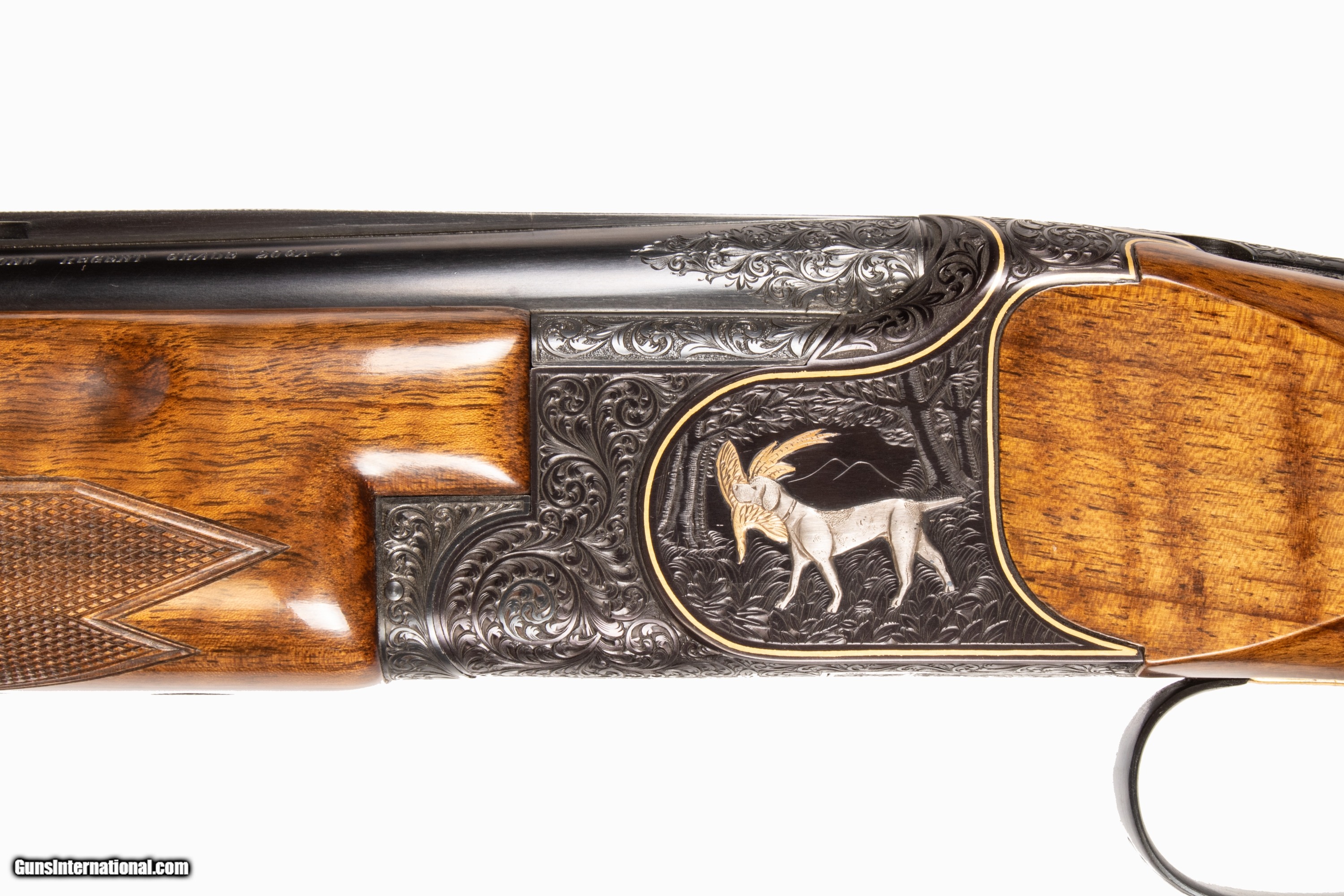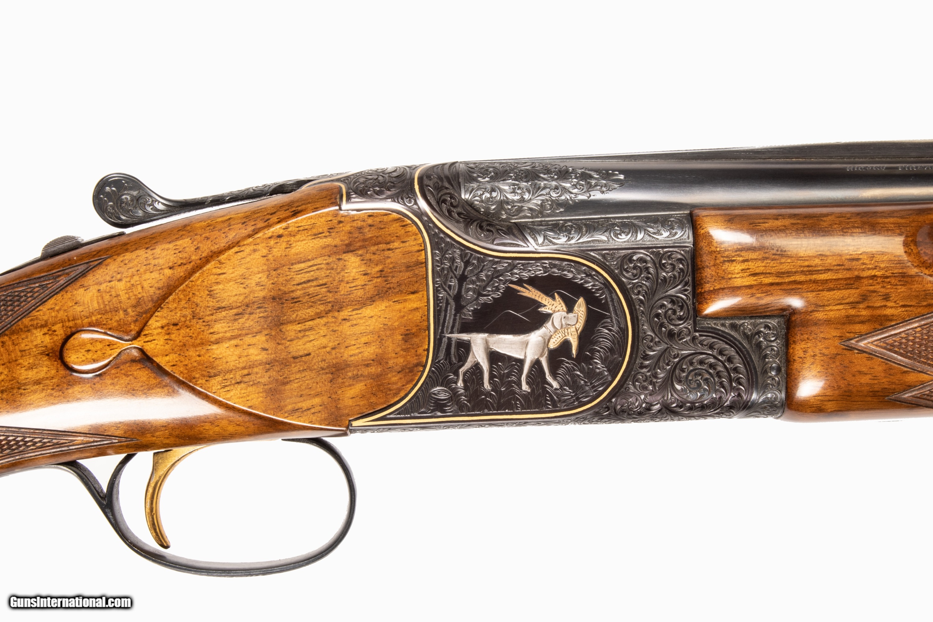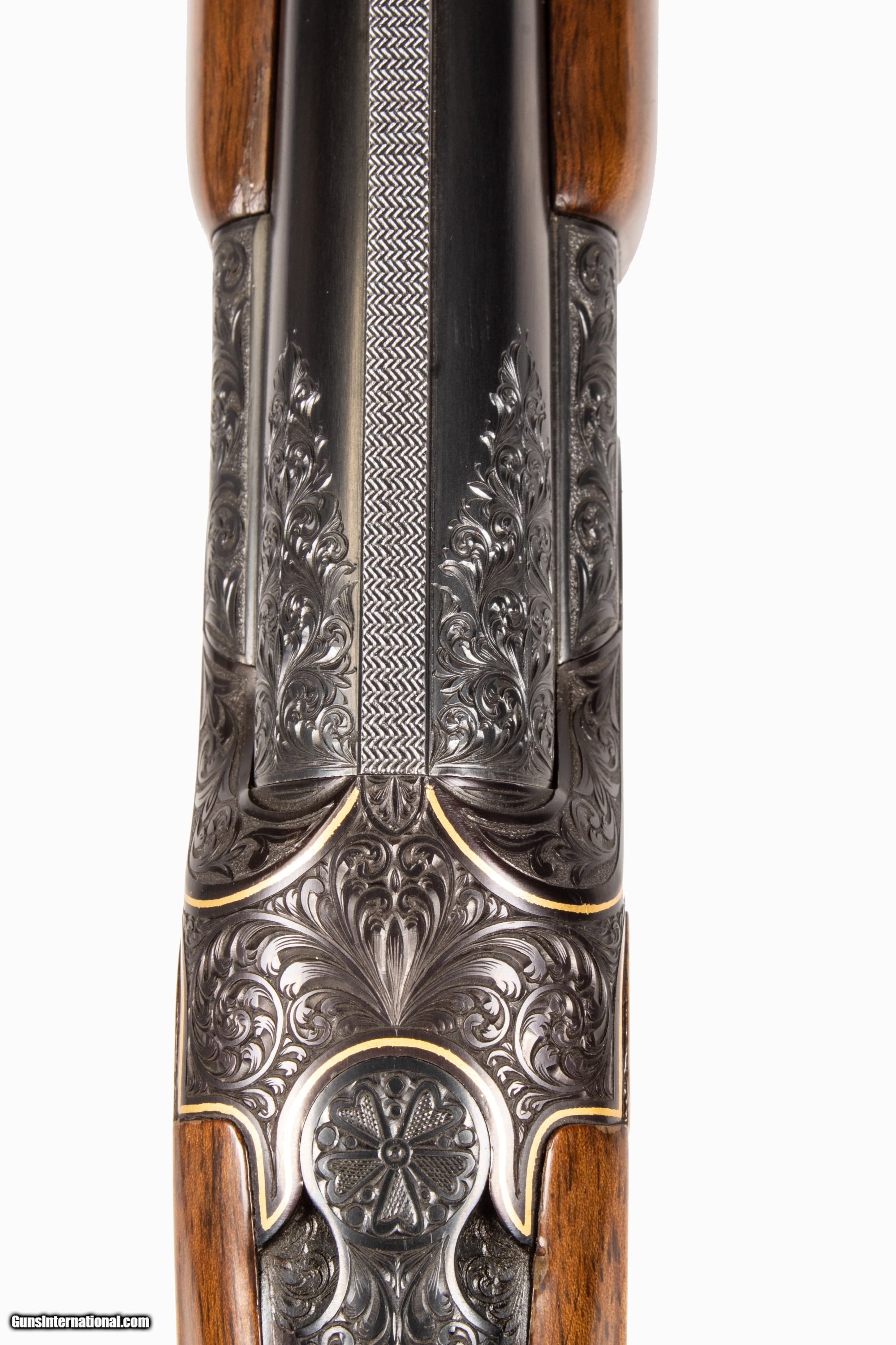 Miroku Diamond Regent chambered for 3 inch 20 gauge shells with 26 inch barrels bright & shiny bores heavily engraved with scroll gold borders game scenes with white gold dog and yellow gold bird. Internal parts were given a mirror finish for smooth functioning single selective inertia trigger and well timed selective ejectors. This is a used firearm that is in excellent condition and is covered by Dury's Lifetime Warranty.