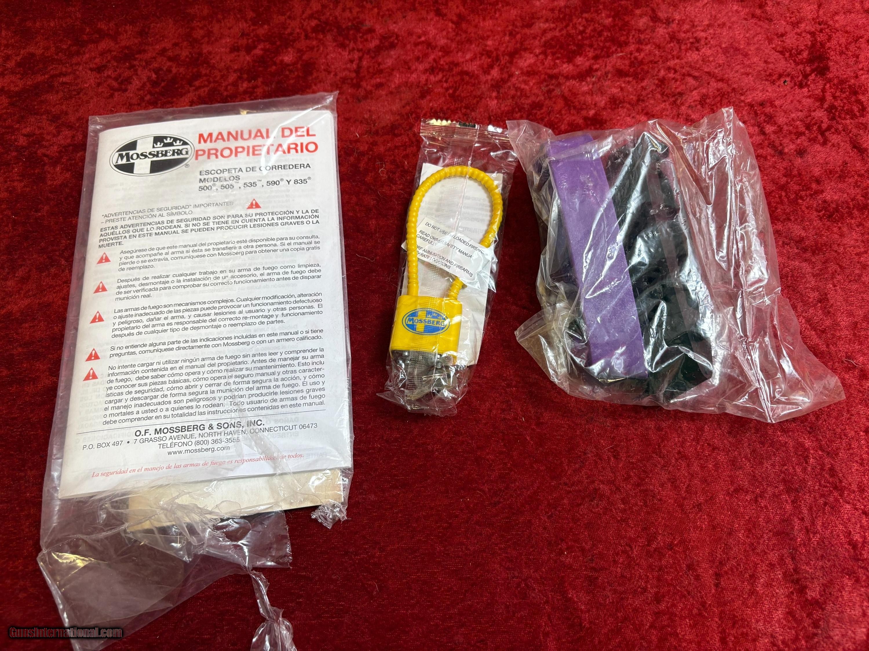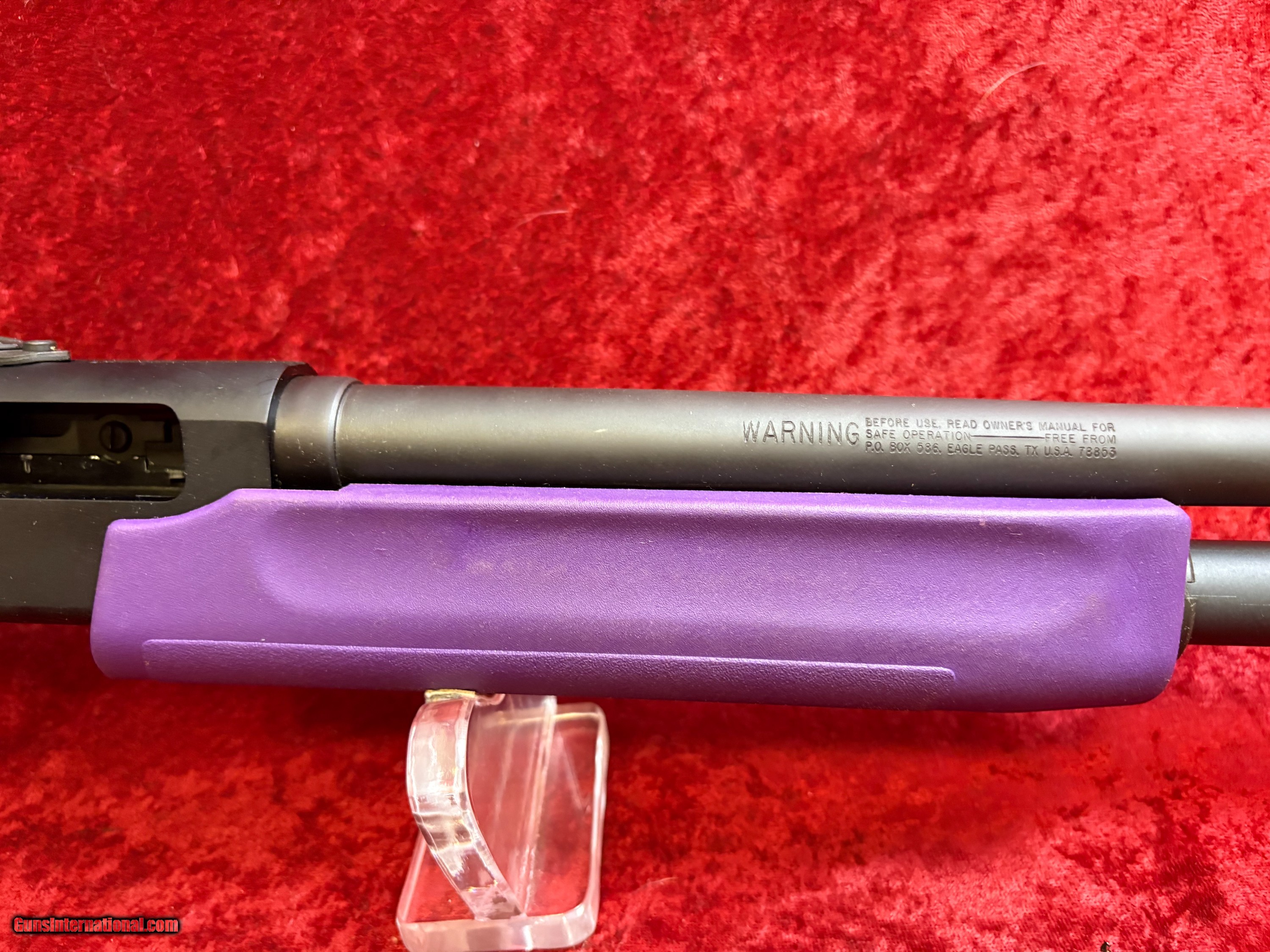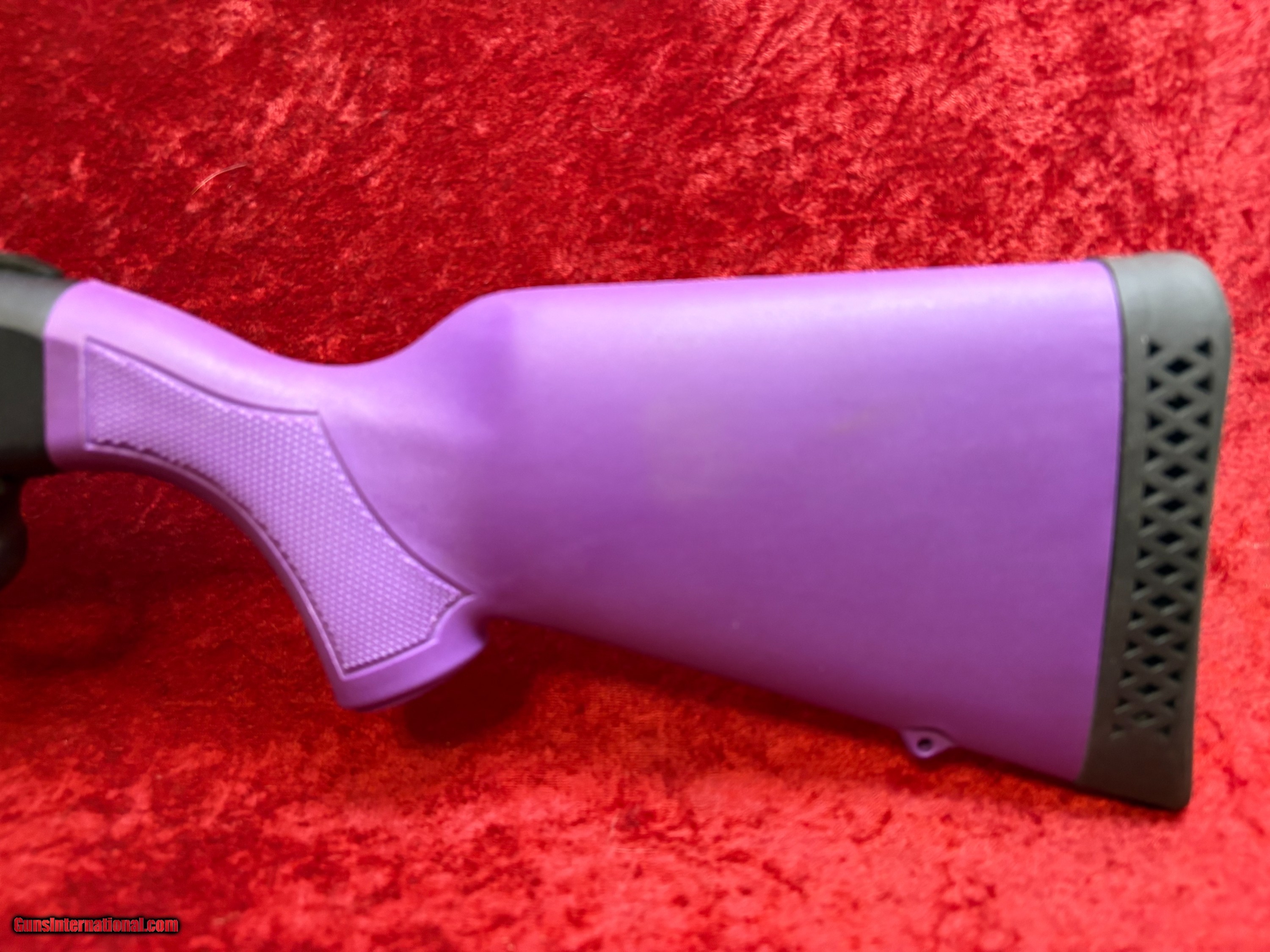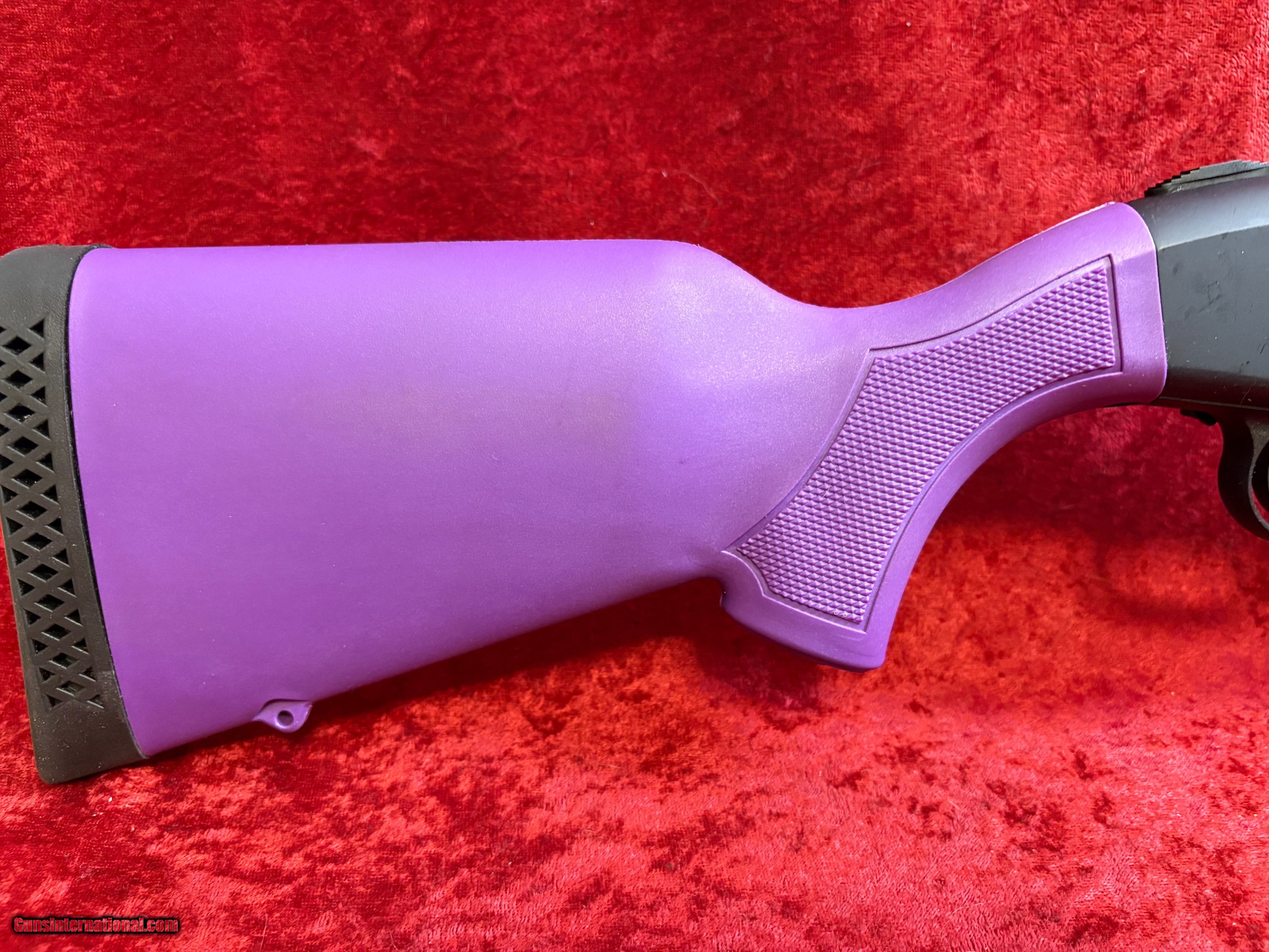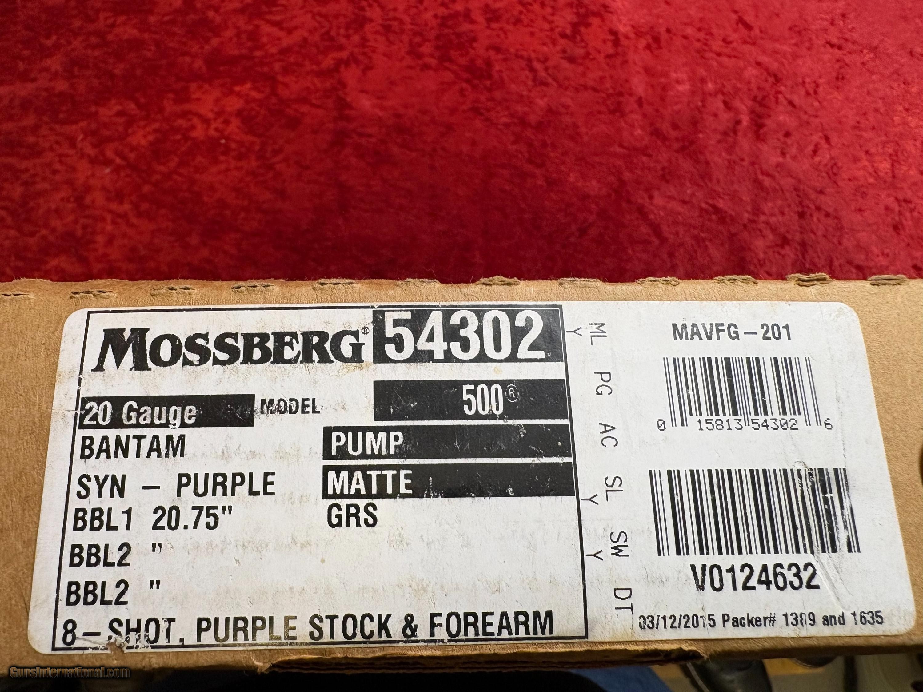 Description: Mossberg 500 Bantam Youth Pump Action 20 ga, 20" bbl 7rd Purple Stock #54302 These are no longer made--order while you can!! This is a Like NEW in Box Mossberg 500 BAntam Youth Pump Action 20 gauge shotgun, 3" chamber, 7 rd capacity for a great home defense shotgun. Ghost ring rear sight with bright orange single blade front sight. Appears unfired just showing signs from being handled. Comes in the original box with spacer & manual. Please see pictures!!
